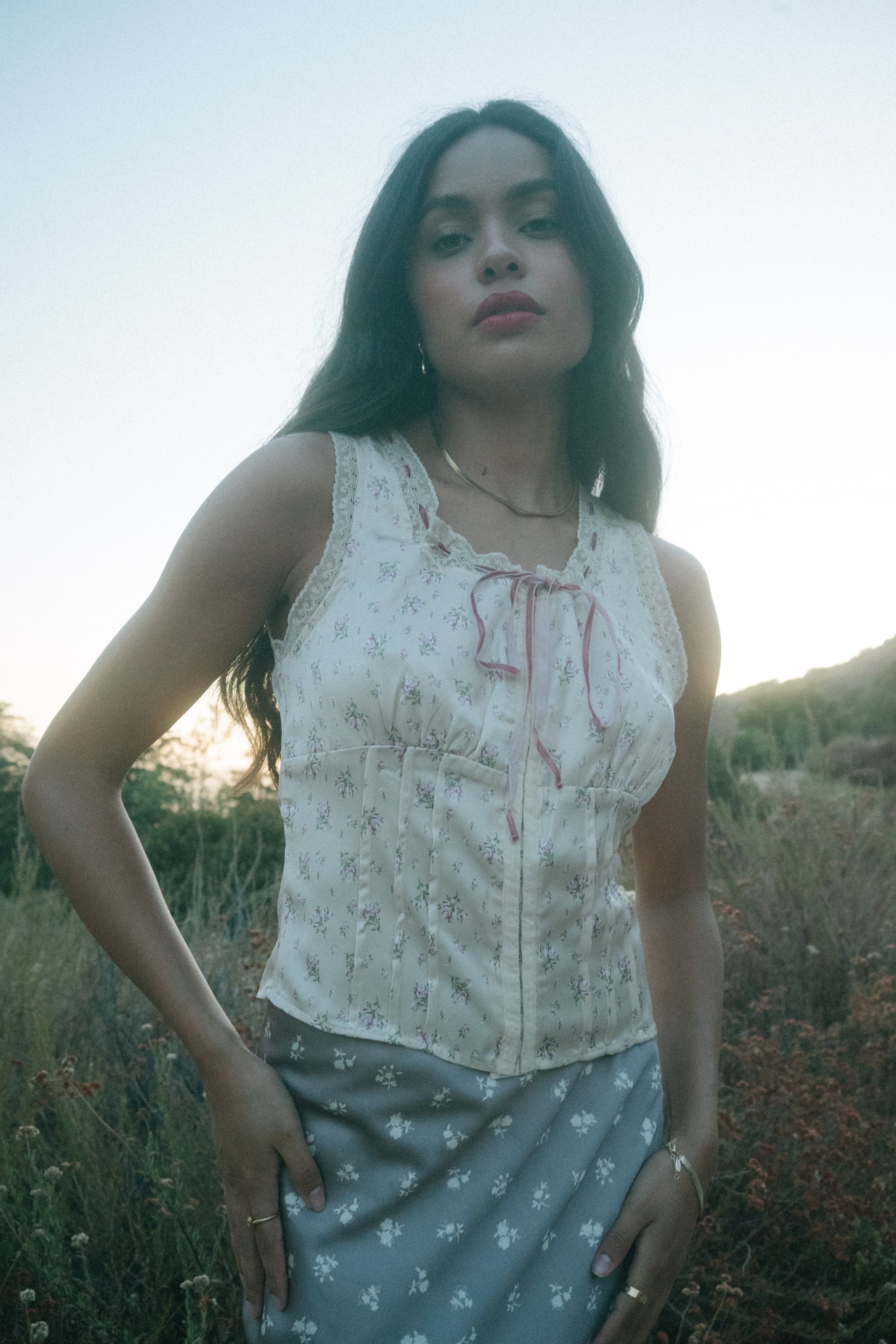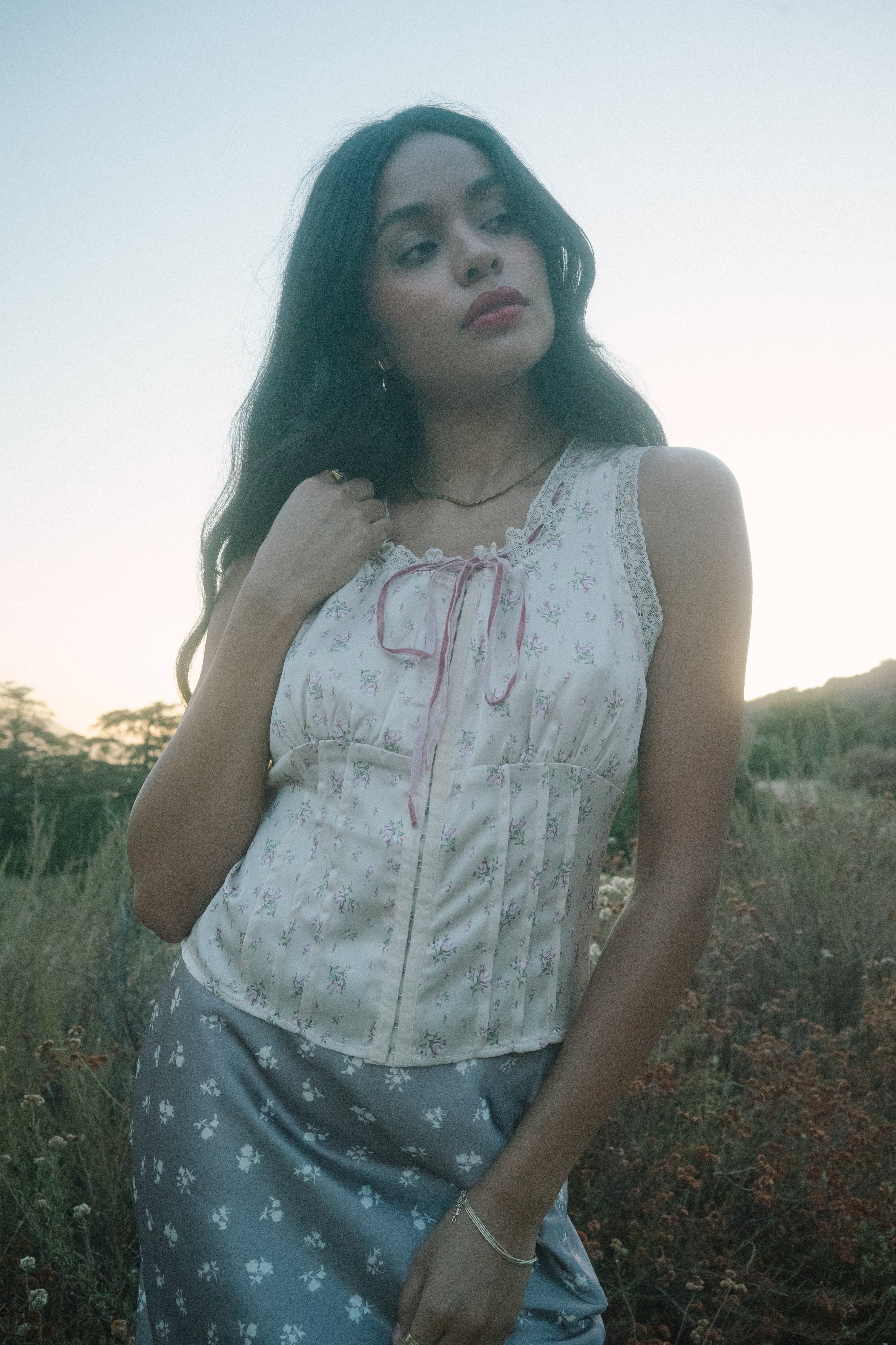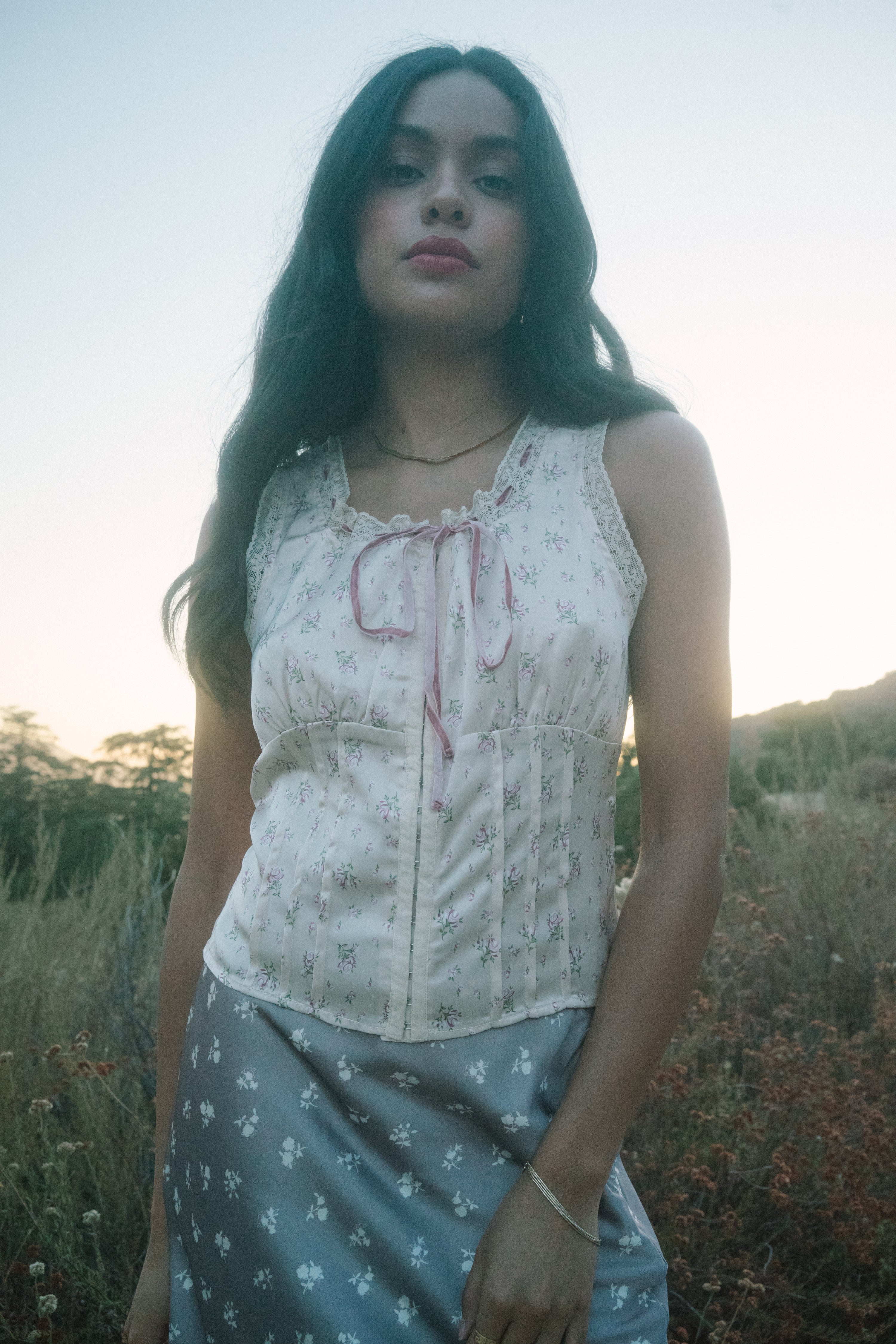 Inspired by darling Edwardian corsets, the Anna Top is the perfect vintage inspired blouse for any romance lovers dream. In a pretty beige hue, the blouse is scattered in a pink, purple and sage green ditsy floral print. This beauty has a scoop neckline, with a pretty pink velvet bow weaved throughout the neckline and tied together with an oversized bow in the center of the neckline. The piece has a raised bust line with vertical pleated detailing along the bodice and cream lace trim along the sleeves. Finished off with functional clasps along the center of the bodice, this is the sweetest vintage inspired beauty perfect for pairing with jeans, slides and a dash of lipstick.
