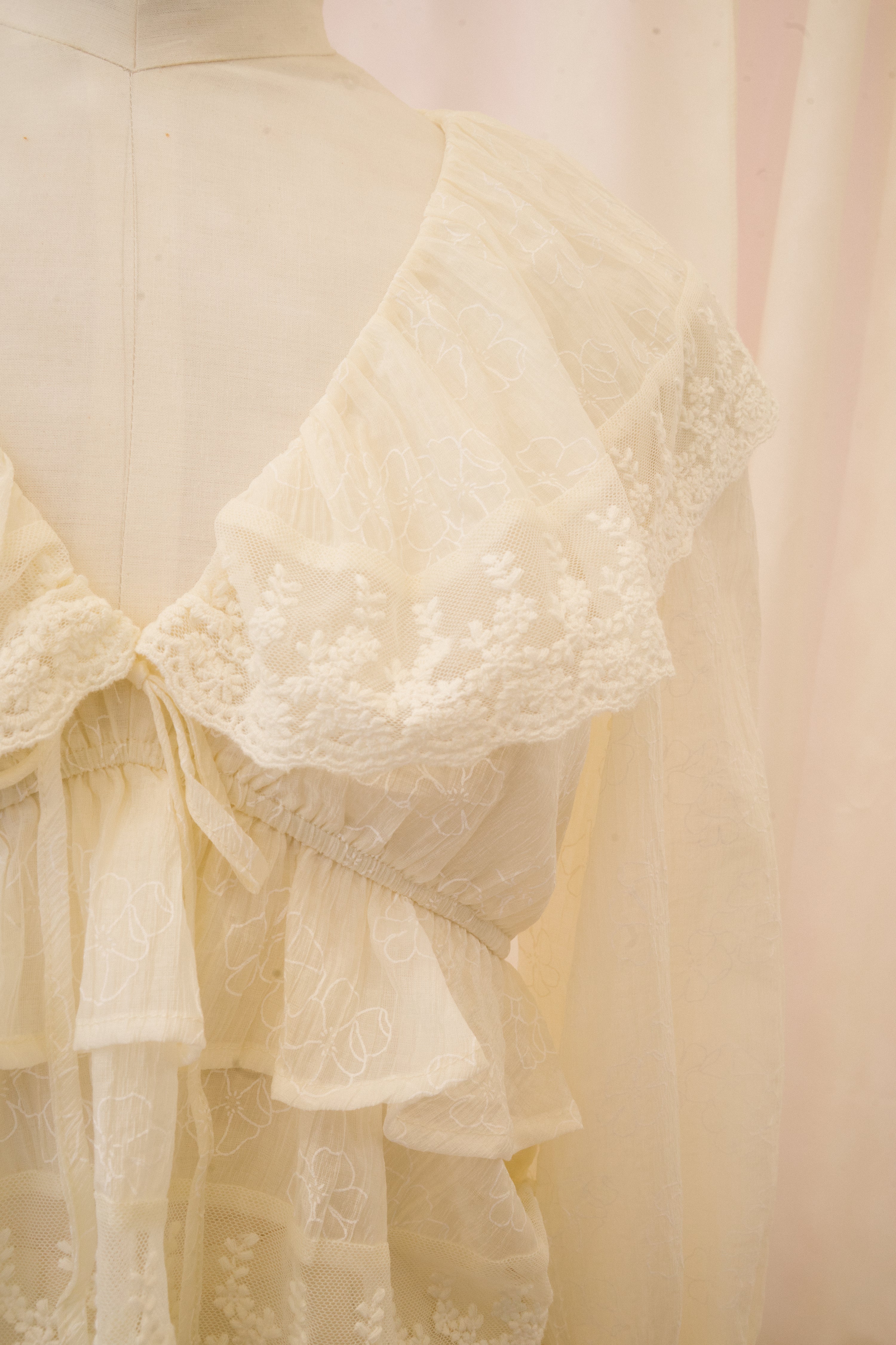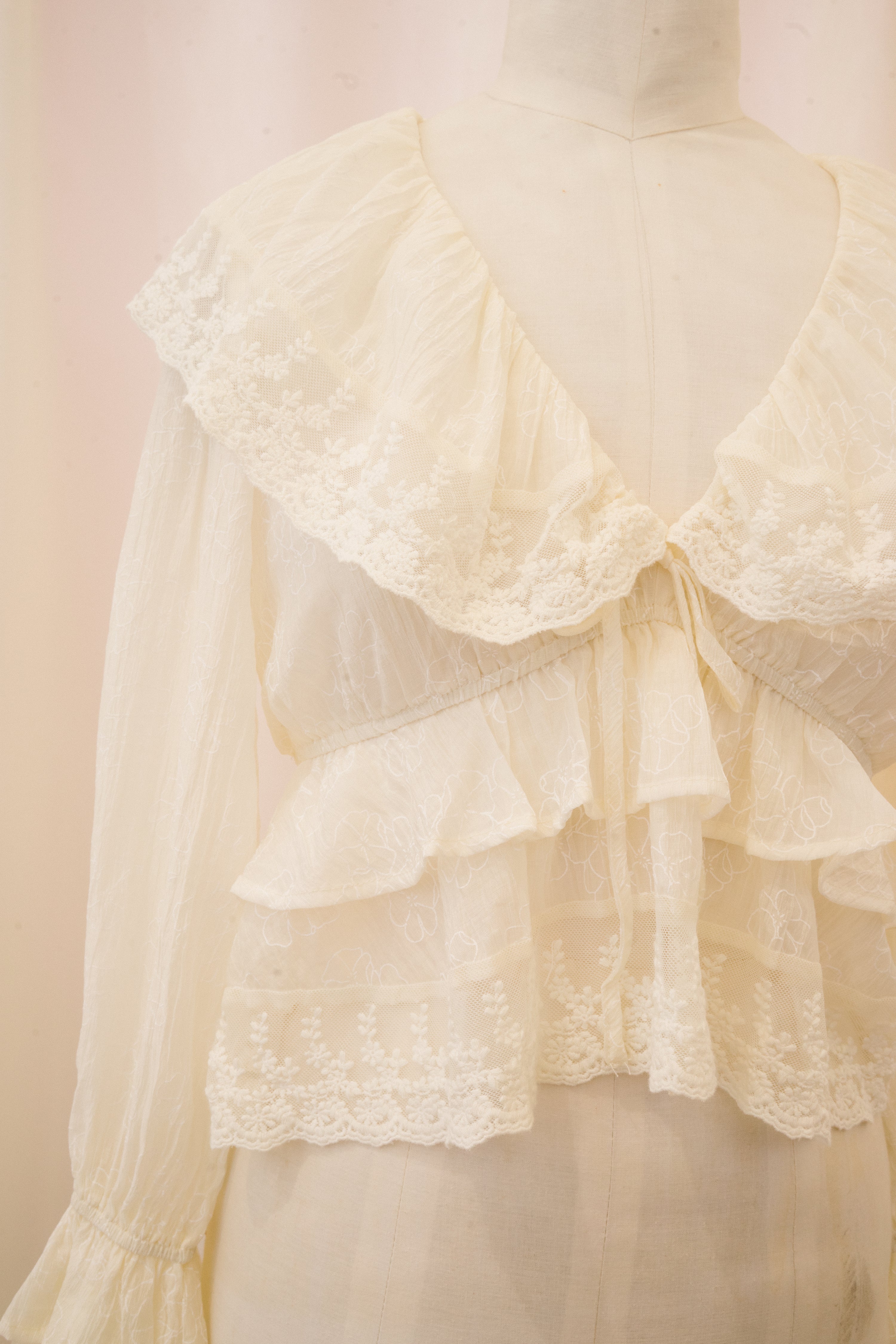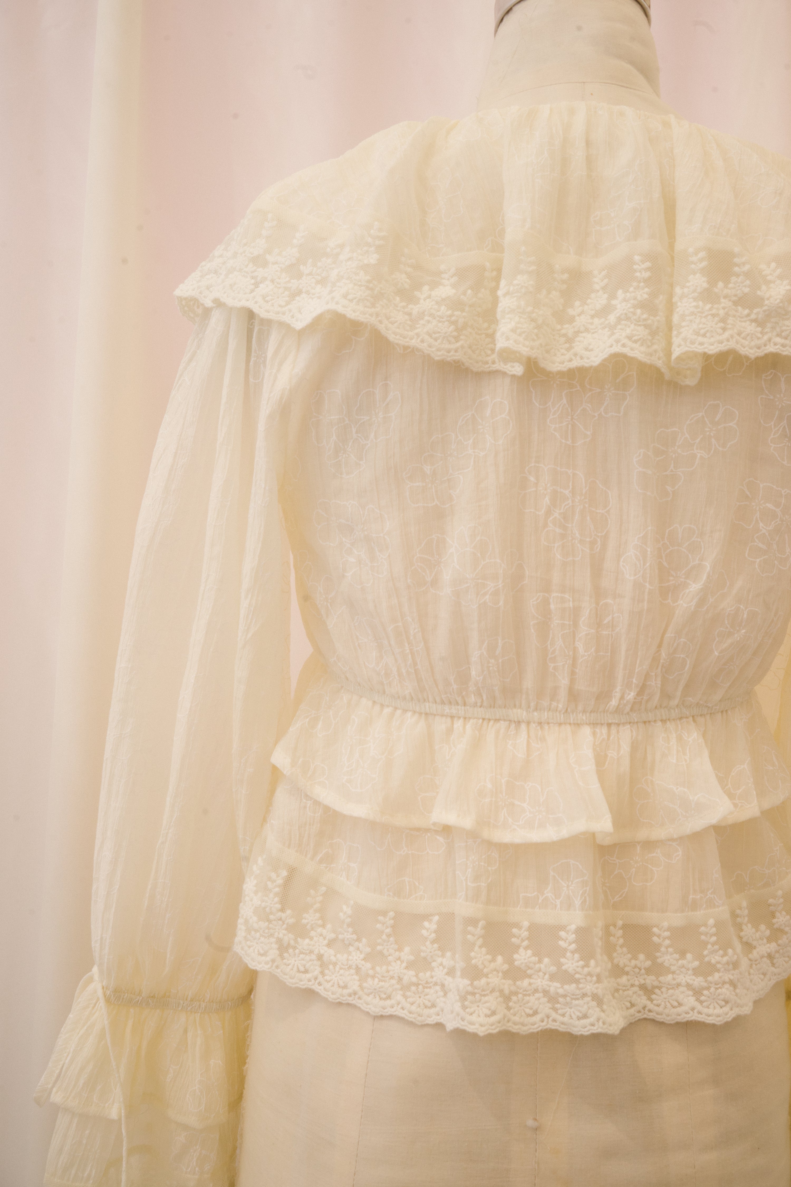 Does it get any more romantic than the Avalon blouse? This flouncy v-neck longsleeve blouse comes in a semi-sheer cream fabric with a subtle white floral pattern throughout. The oversized collar, frilly cuffs, and bottom hem are embroidered with gorgeous broderie anglaise. The long sleeves feature an elastic that gathers at the wrist in a decorative bow. The tiers of the cuff mirror the three tiers of the bodice, which also features a decorative bow-tie at the center bust. Elastic under the bust defines your shape comfortably, while rows of ruffles add whimsy and volume, making the Avalon a dreamy piece ideal for autumnal layering or as a standalone piece.