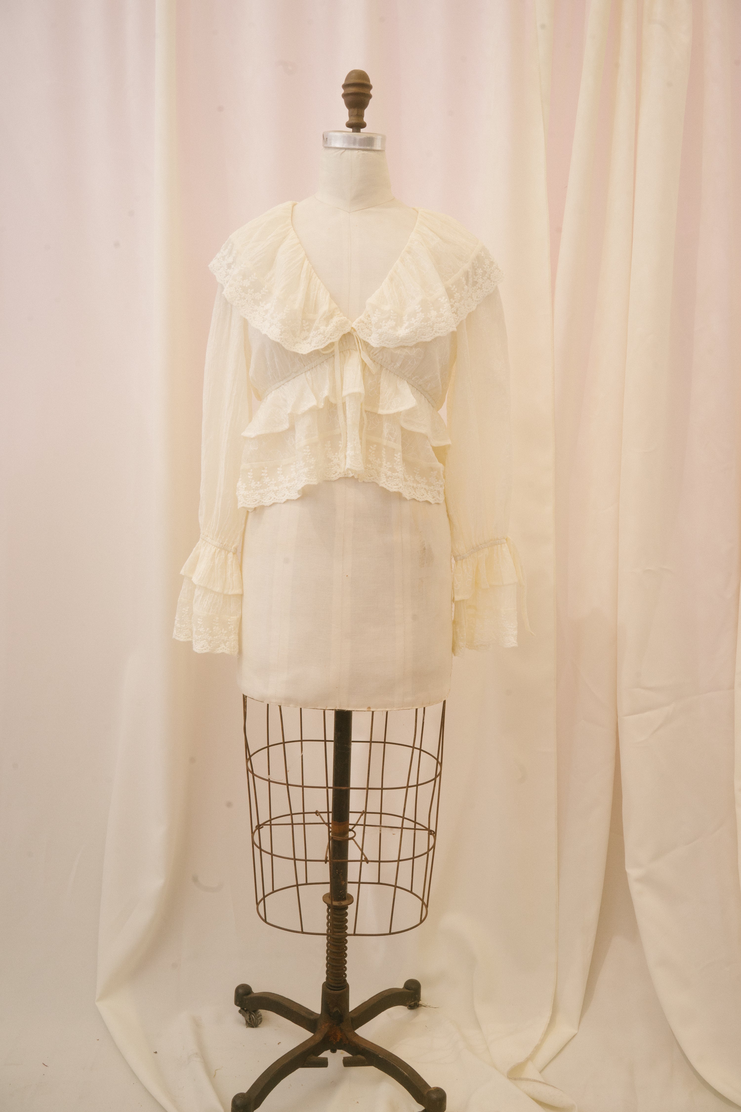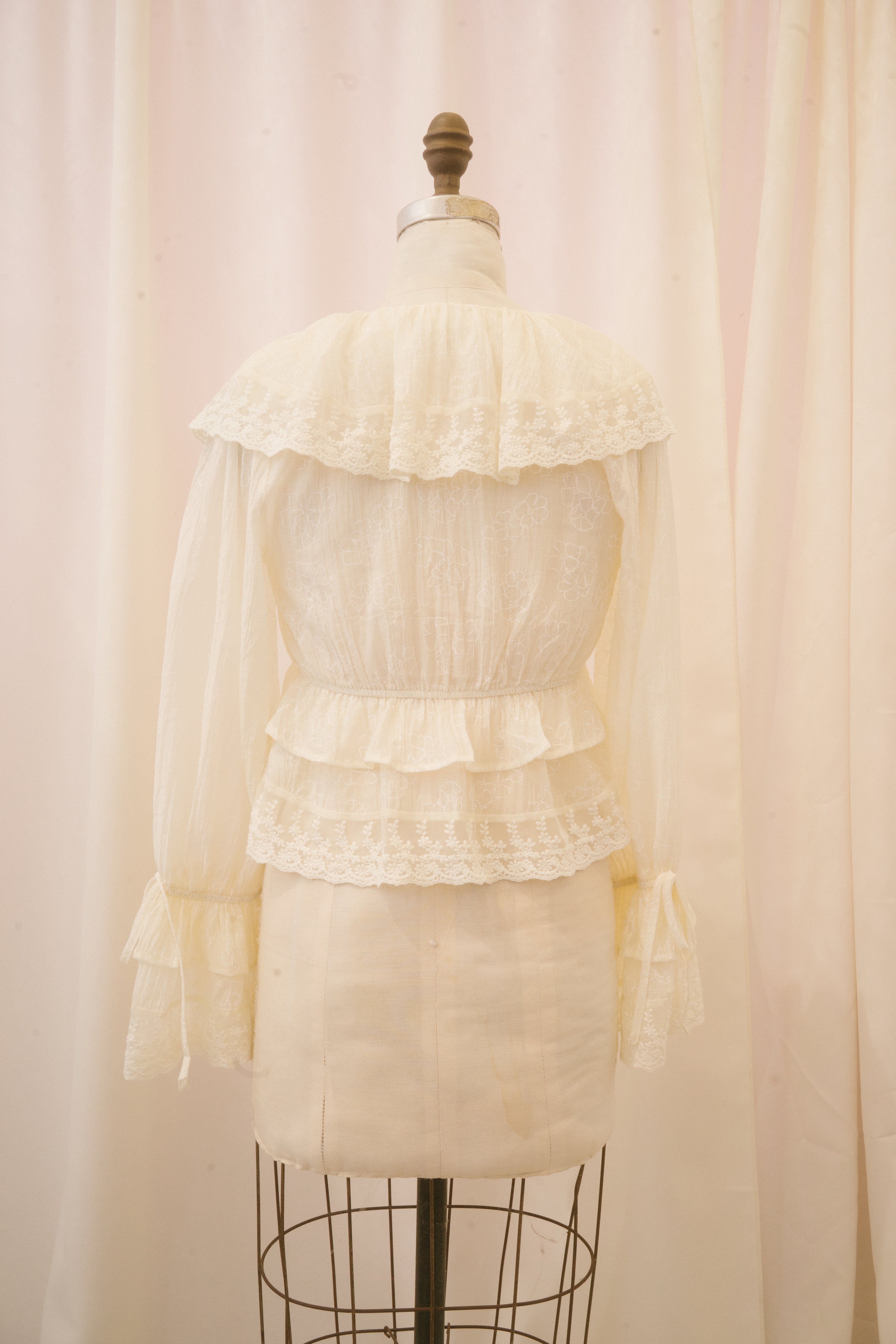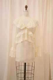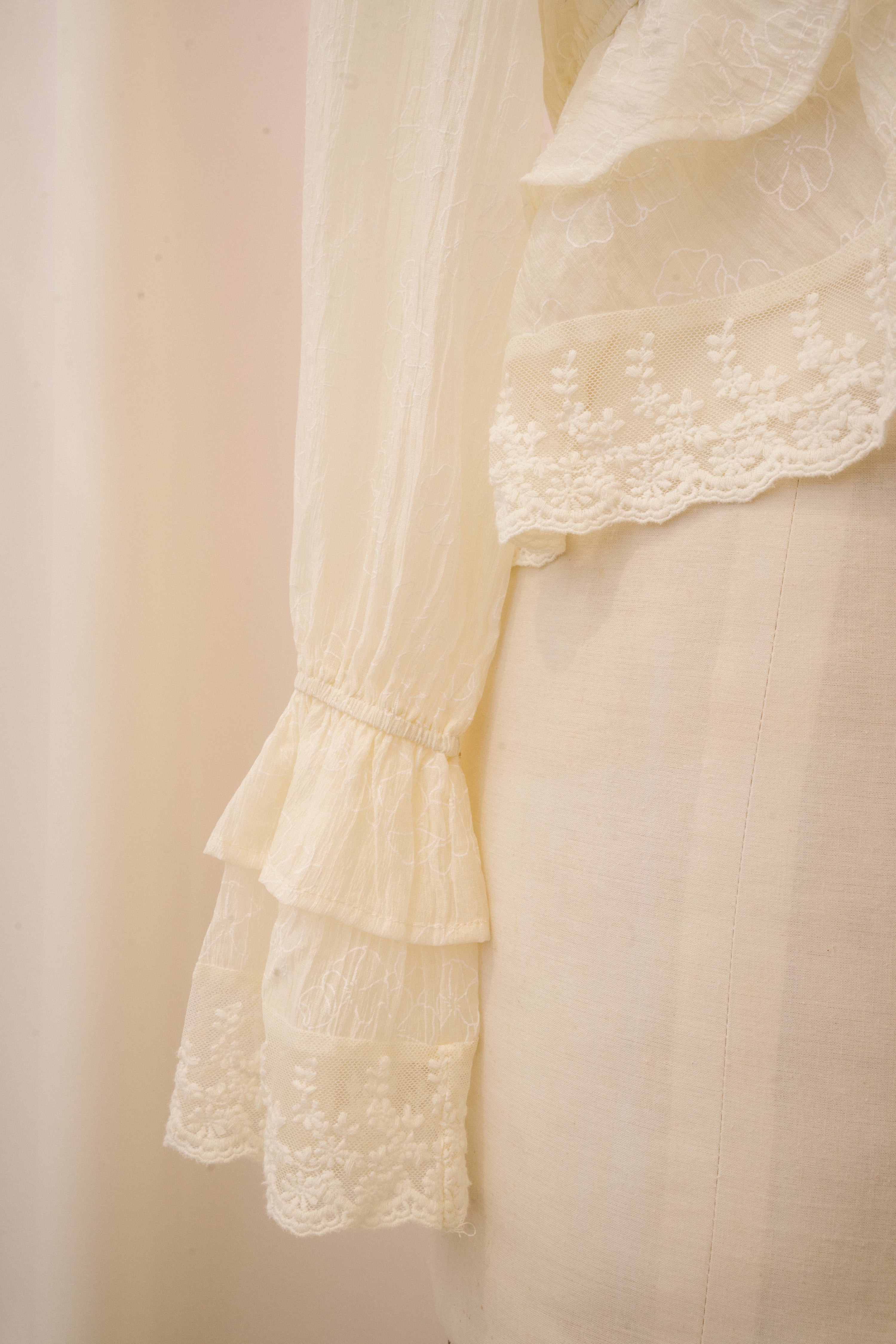 Does it get any more romantic than the Avalon blouse? This flouncy v-neck longsleeve blouse comes in a semi-sheer cream fabric with a subtle white floral pattern throughout. The oversized collar, frilly cuffs, and bottom hem are embroidered with gorgeous broderie anglaise. The long sleeves feature an elastic that gathers at the wrist in a decorative bow. The tiers of the cuff mirror the three tiers of the bodice, which also features a decorative bow-tie at the center bust. Elastic under the bust defines your shape comfortably, while rows of ruffles add whimsy and volume, making the Avalon a dreamy piece ideal for autumnal layering or as a standalone piece.