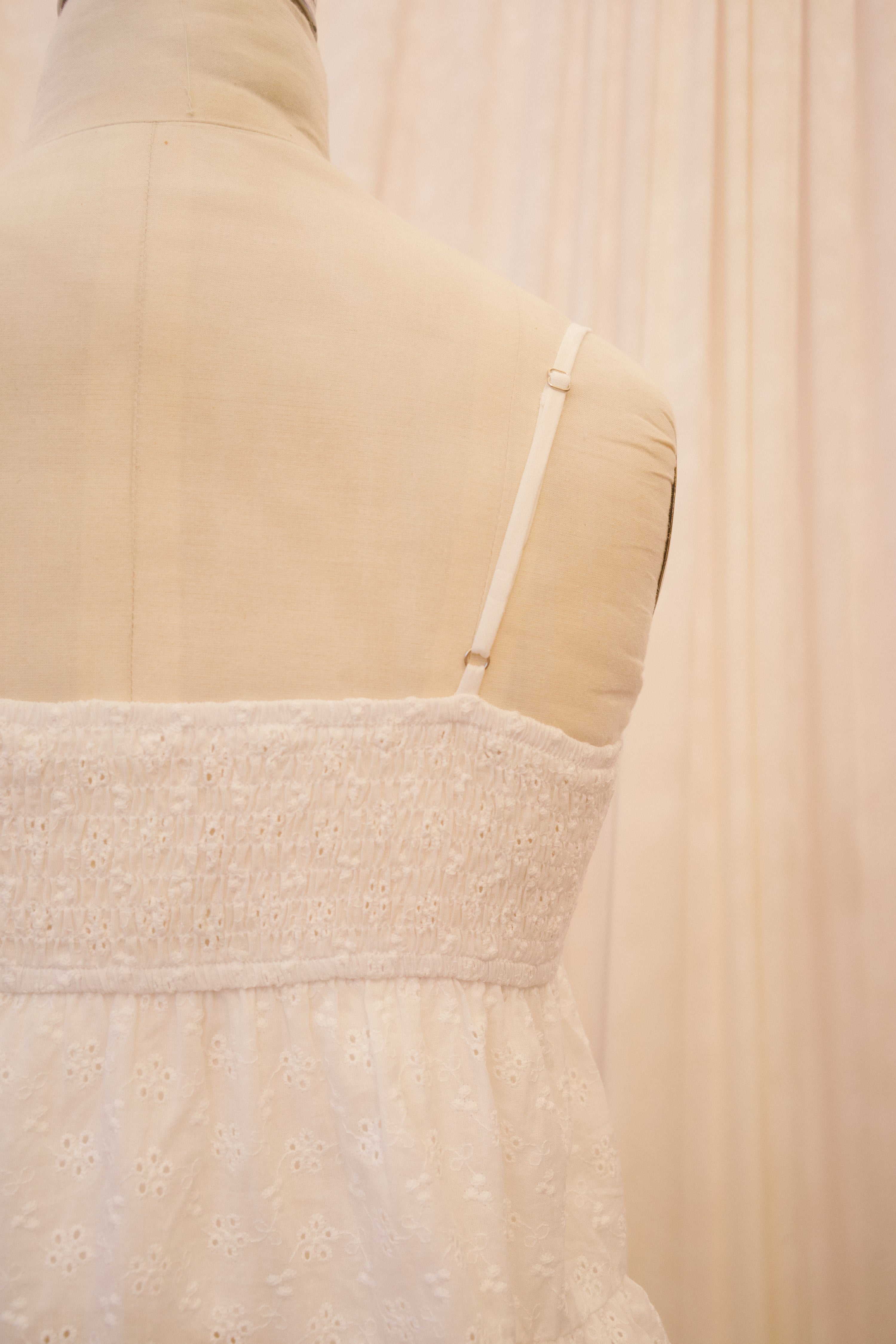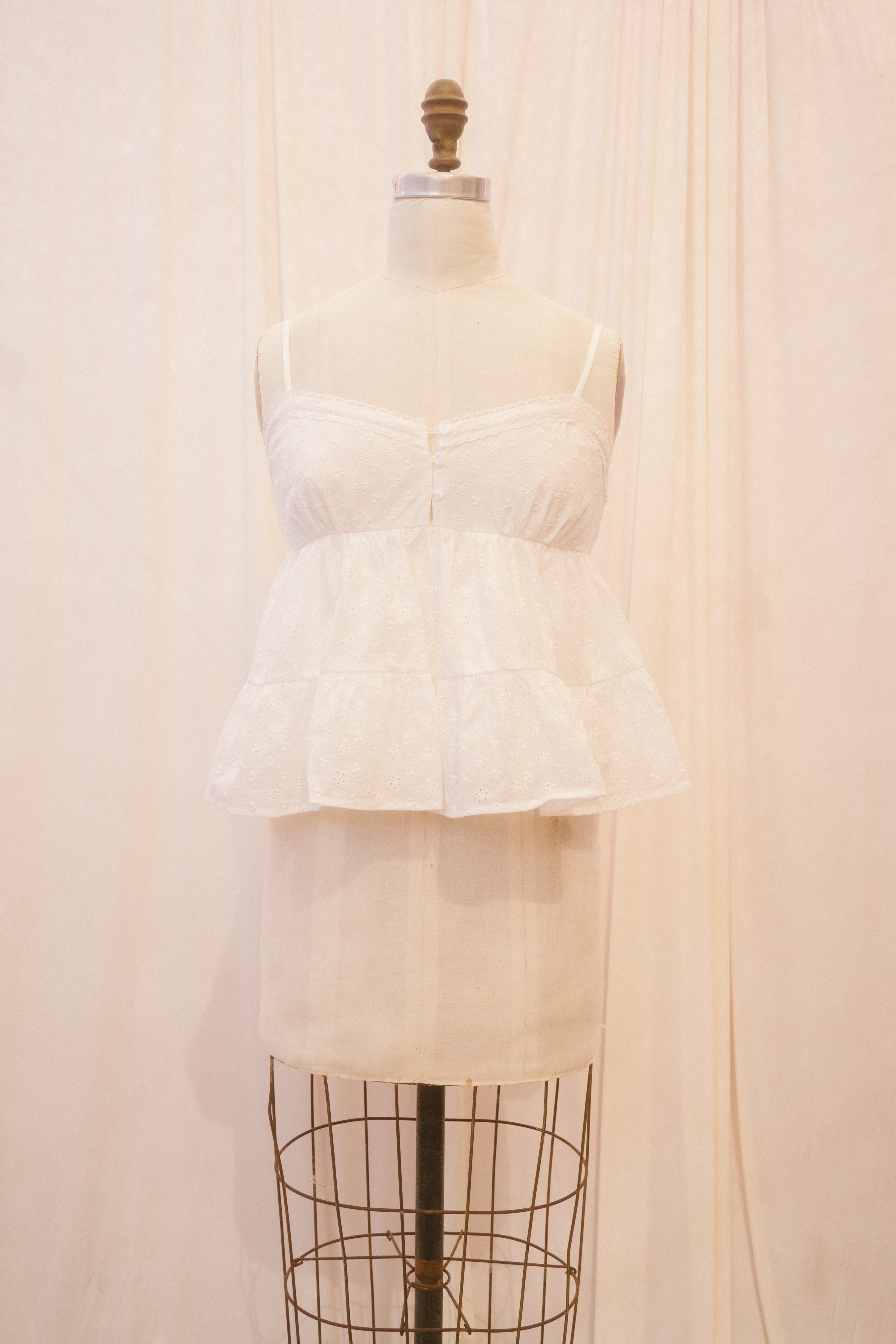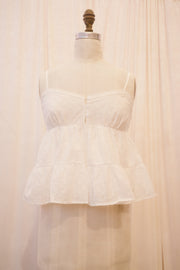 The Brandie blouse is a an easy choice for summer dressing made simple. This solid white spaghetti strap tank top comes in a romantic eyelet cotton. The sublte v-shaped neckline is adorned with delicate dentelle-style lace, and joins in the middle with three functional buttons. The smocked back panel makes for a comfy, custom fit, while two subtle tiers cascade down from under the bust, for a swingy, breezy shape. Remniscient of your favorite beachy y2k mall brands, if you didn't get a chance to wear the Brandie in the early 2000s, now is your time to shine!
