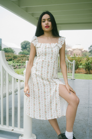 Inspired by the French countryside, the Cecilla Dress comes in a cream hue and is decorated in green, red and golden vertical floral print. This midi sundress has short flutter sleeves, a raised waistline and square neckline. It has an exaggerated ruffle along the neckline, with smocking along the backside. Finished off with an a-line midi length skirt with a slit on the left side, style with a basket bag, a touch of jewelry and a sunhat.