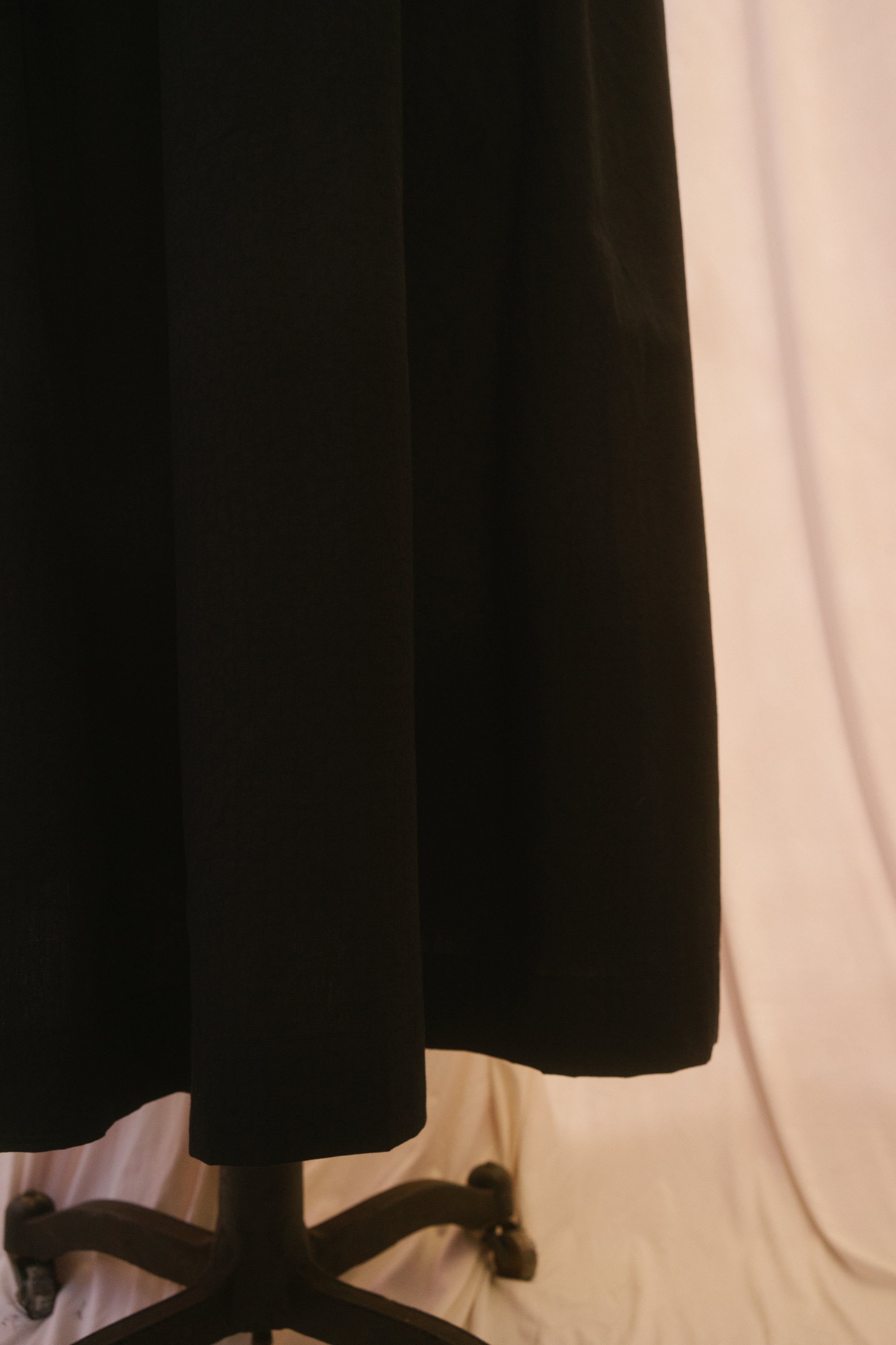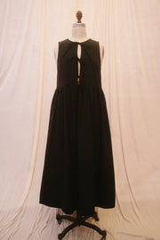Even hip kittens need to stay cool, and the Fernanda dress is just the ticket! This solid black sundress features three functional bow ties up the center of the plunging open bodice for maximum airflow, while the high neckline and wide straps provide just enough coverage. A subtle seersucker threading gives the inky dark fabric texture, and the ample a-line skirt flows out from a subtle drop waist for comfort and movement. Throw on your darkest sunglasses and you're ready to hit the jazz clubs.