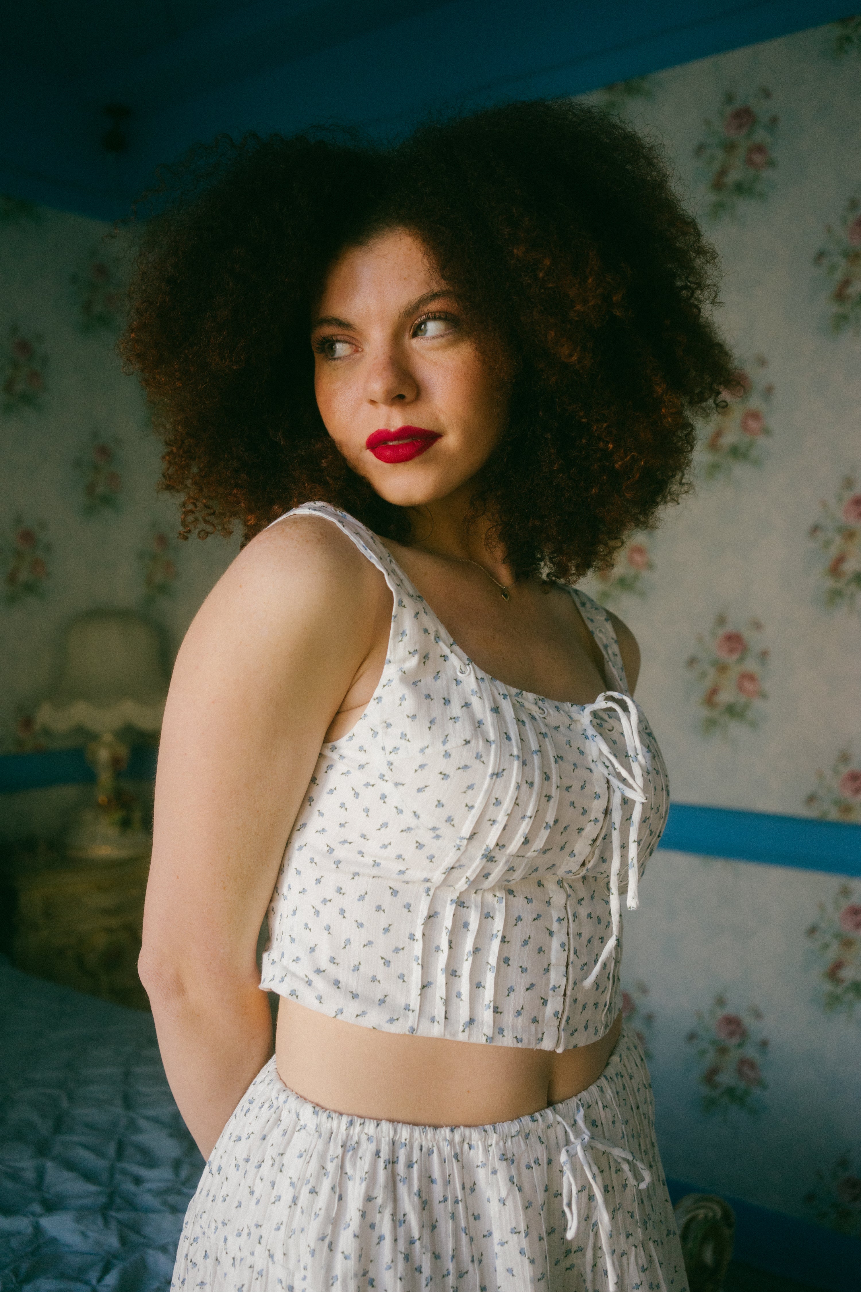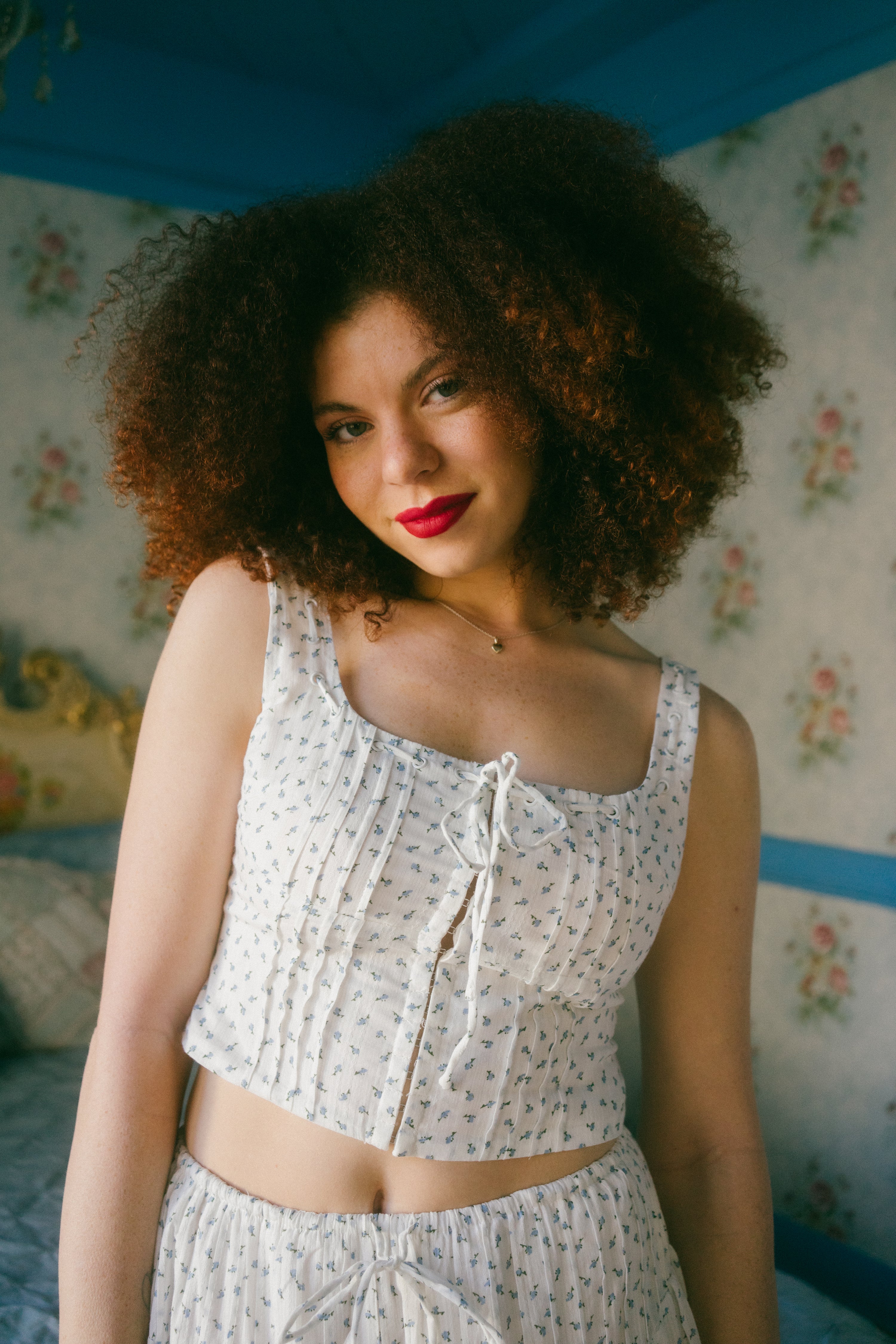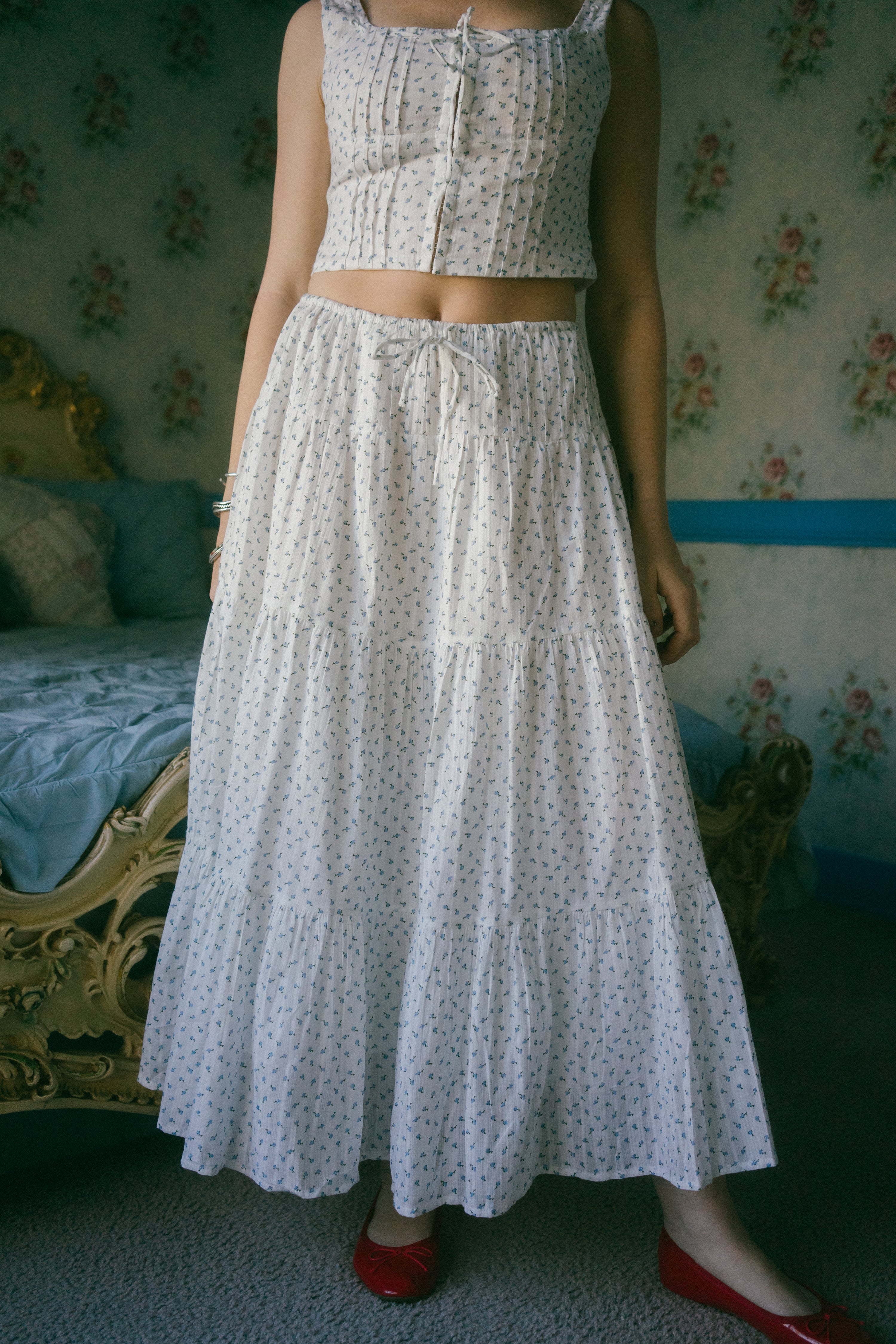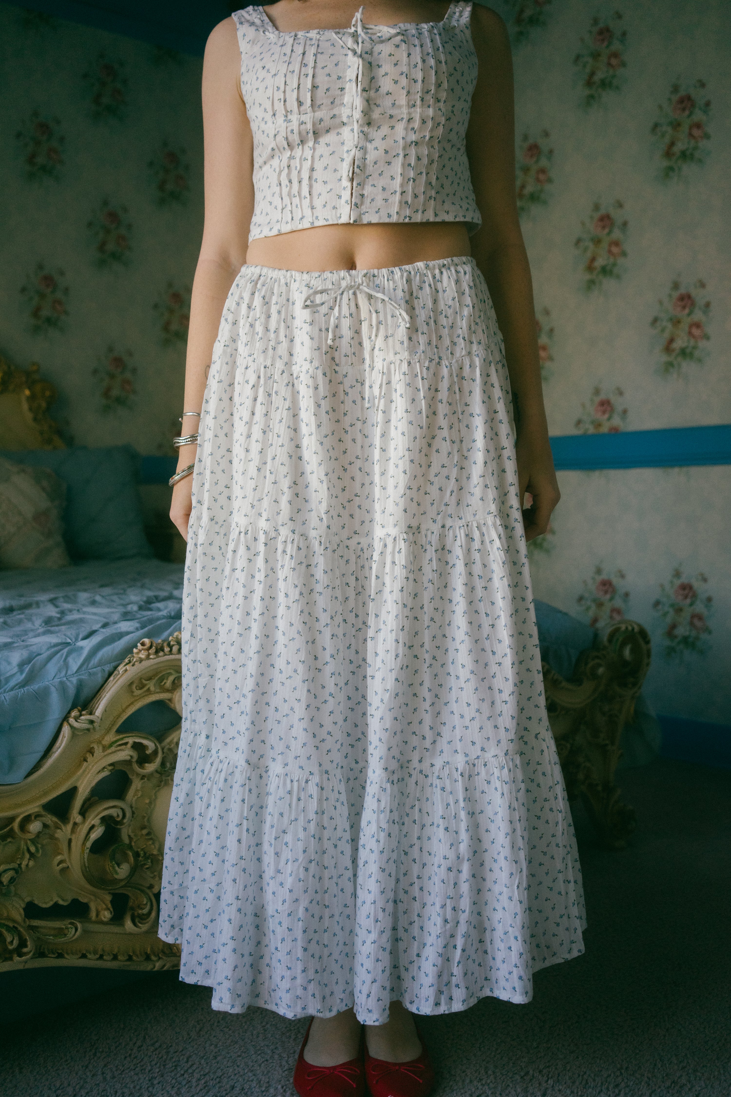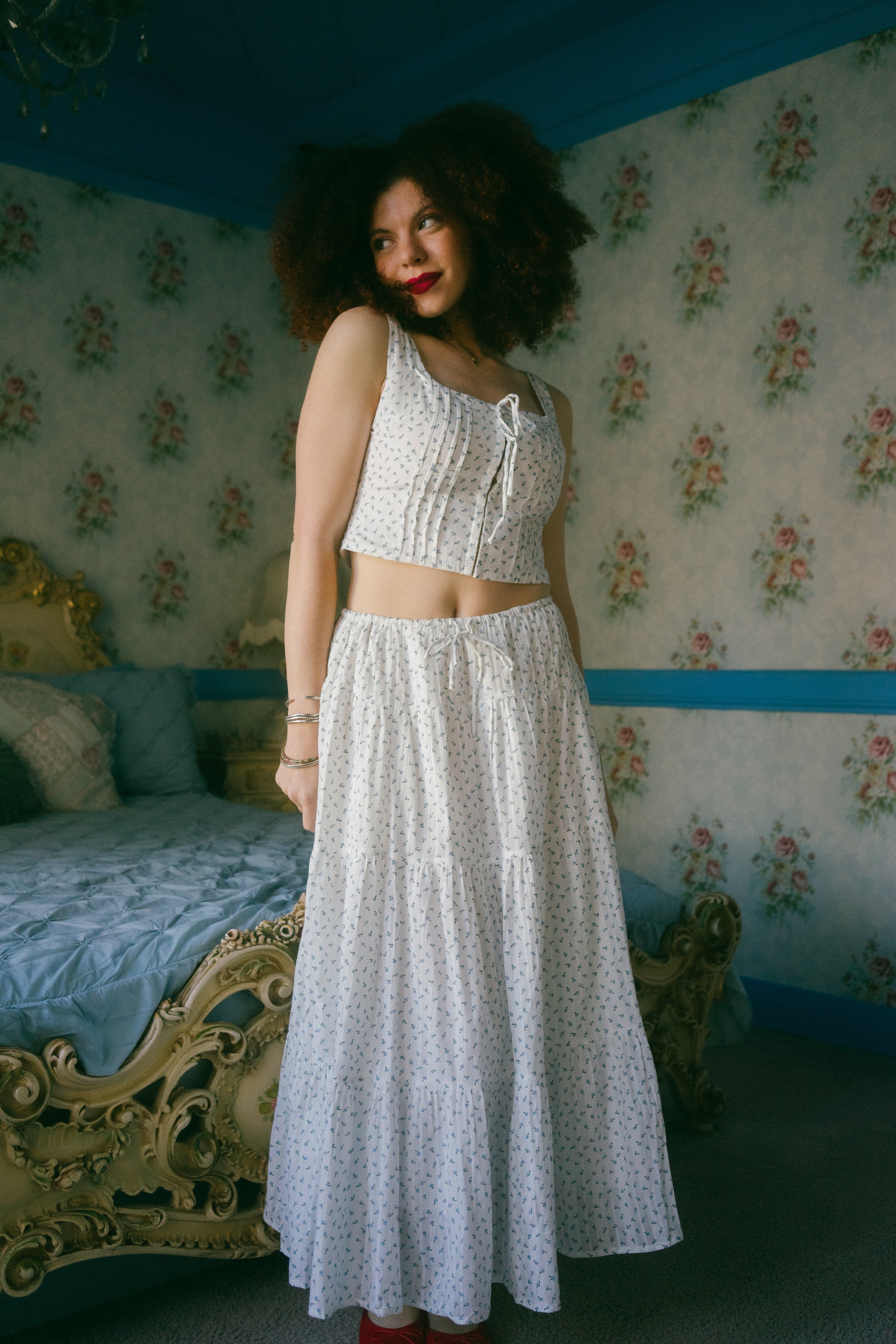 An Astrior favorite, the Hailey Set comes in an off-white hue and is scattered in a soft muted blue and light green ditsy floral print. The piece comes with a semi cropped blouse with a square neckline, thick straps for sleeves and an oversized bow in the center of the neckline that weaves in and out of the top of the design. It has vertical pleated detailing along the bodice with functional clasps down the center of the blouse. The skirt is decorated with fabric gathering details along the waistband and tiers, creating an extra flowly, vintage inspired look. Finished off with an adjustable waist tie that ties together in an oversized bow, style with your go-to slides, an oversized tote and a messy updo for a romantic early spring day look.