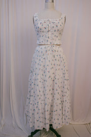 An Astrior favorite, the Hailey Set comes in an off-white hue and is scattered in a soft blue, red and light green ditsy floral print. The piece comes with a semi cropped blouse with a square neckline, thick straps for sleeves and an oversized bow in the center of the neckline that weaves in and out of the top of the design. It has vertical pleated detailing along the bodice with functional clasps down the center of the blouse. The skirt is decorated with fabric gathering details along the waistband and tiers, creating an extra flowy, vintage inspired look. Finished off with an adjustable waist tie that ties together in an oversized bow, style with your go-to slides, an oversized tote and a messy updo for a romantic early spring day look.