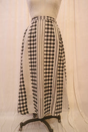 The Ischia skirt puts a contemporary, graphic twist on traditional prints and fabrics. This a-line midi skirt features alternating panels of  gauzy grey and cream vertical stripes interspersed with traditional cream and black gingham. The mid-weight fabric of the gingham has a beautiful rustic texture, but the hidden pockets and elasticized back waist-band are pure, modern comfort.