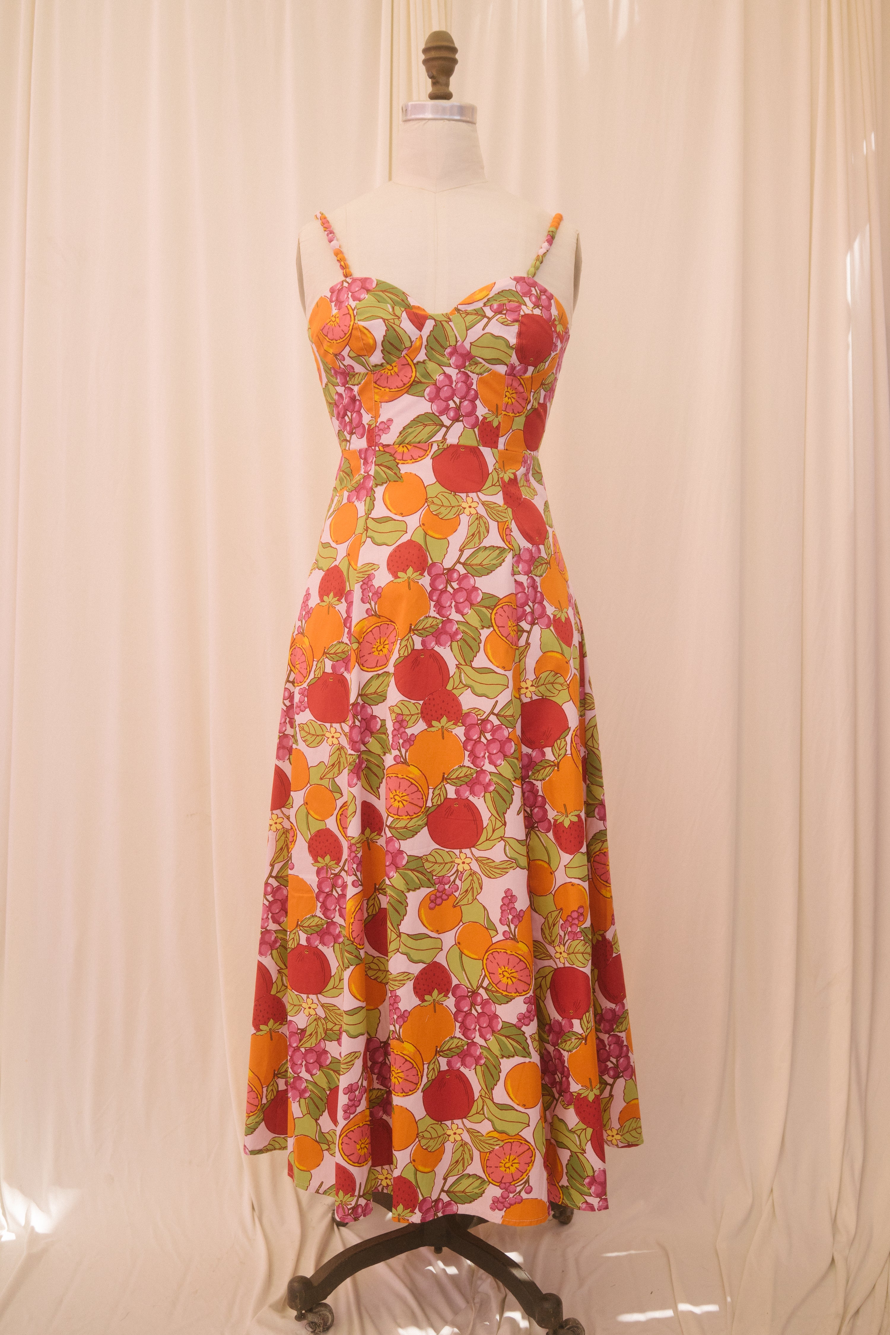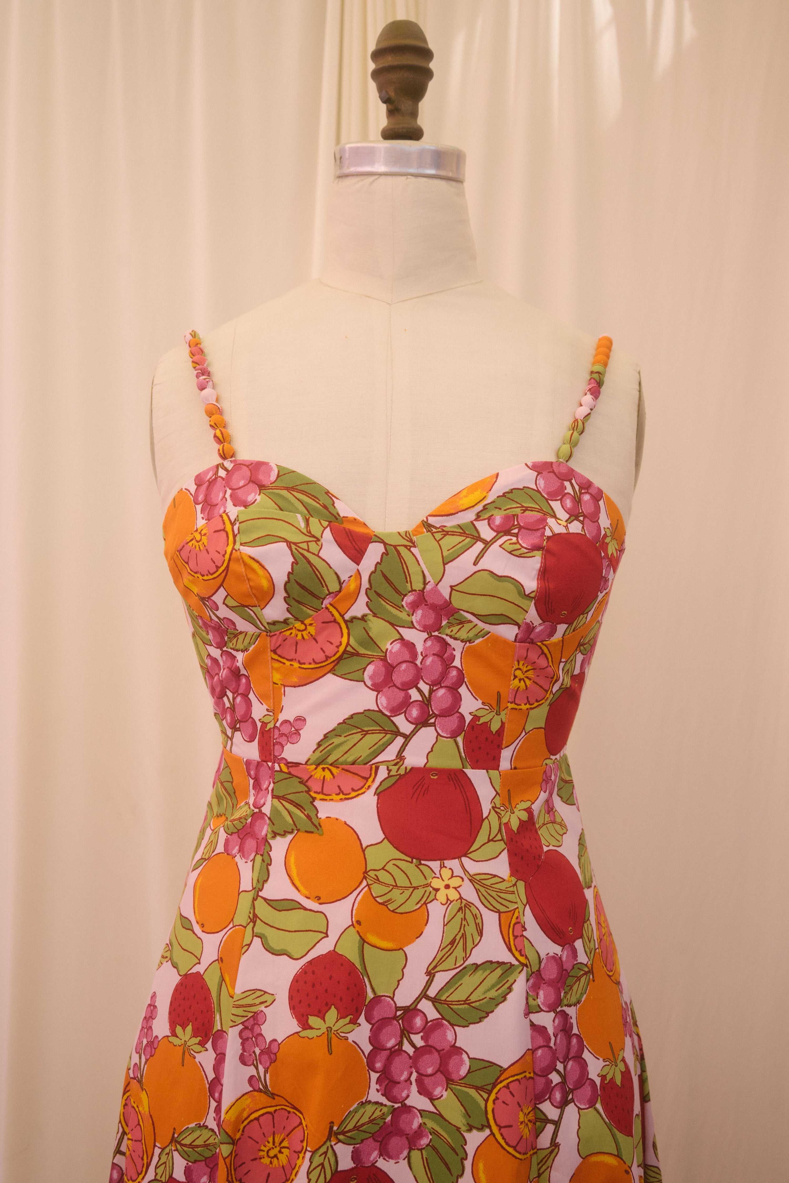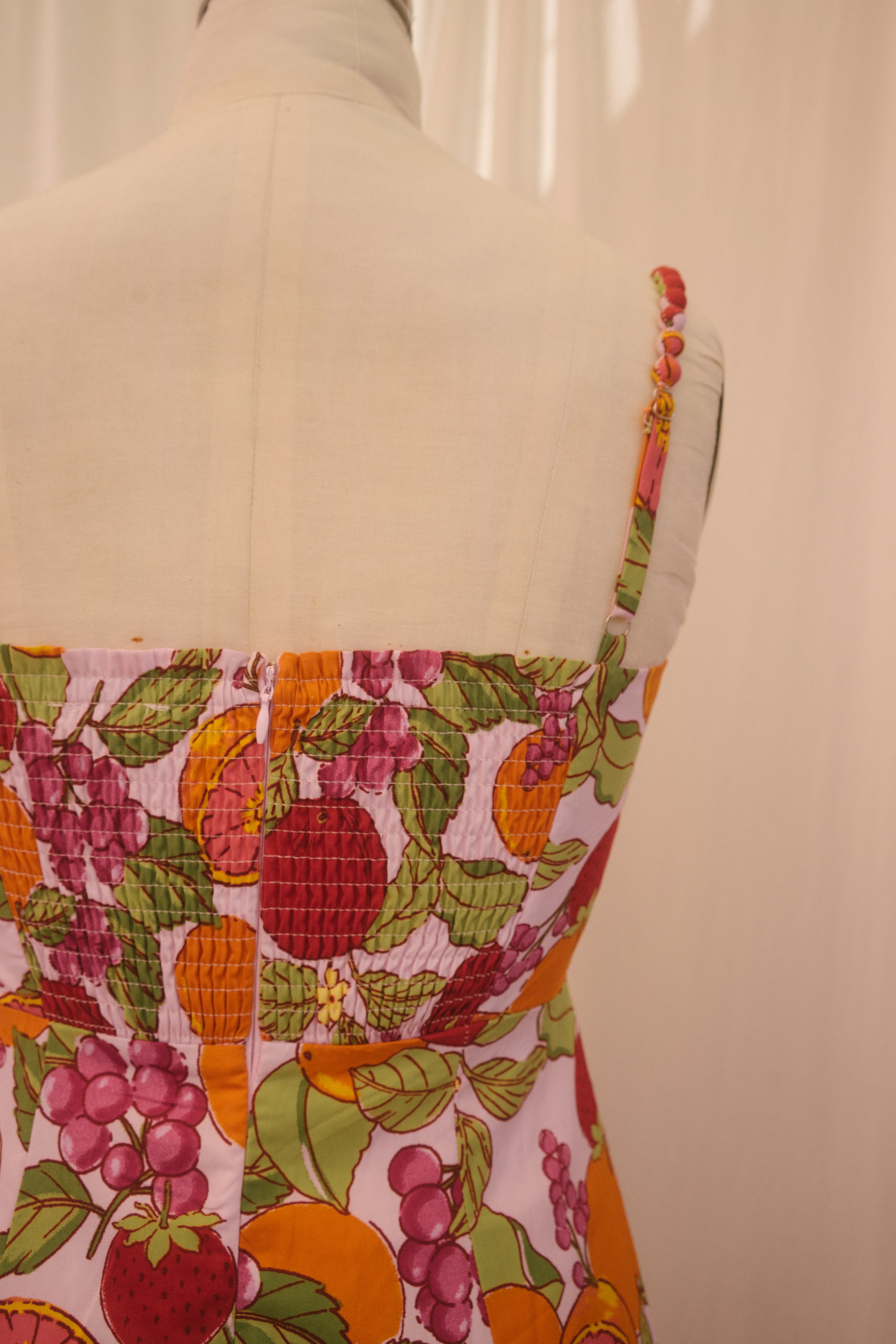 Fit for vacations on foreign beaches, the Joni Dress is a sweet bite of summer. In a pretty pastel pink hue, this midi sundress is covered in an oversized fruit print with oranges, grapes, strawberries, tomatoes and more. This beauty has a raised waistline with a sweetheart bust design and a semi smocked backside. With a fit and flare silhouette, the piece has a tapered waist that flows out into a really pretty a-line midi length skirt. Finished off with adjustable straps that have pretty ball details along the front, style with a dash of lipstick, an oversized beach bag and summer sandals.