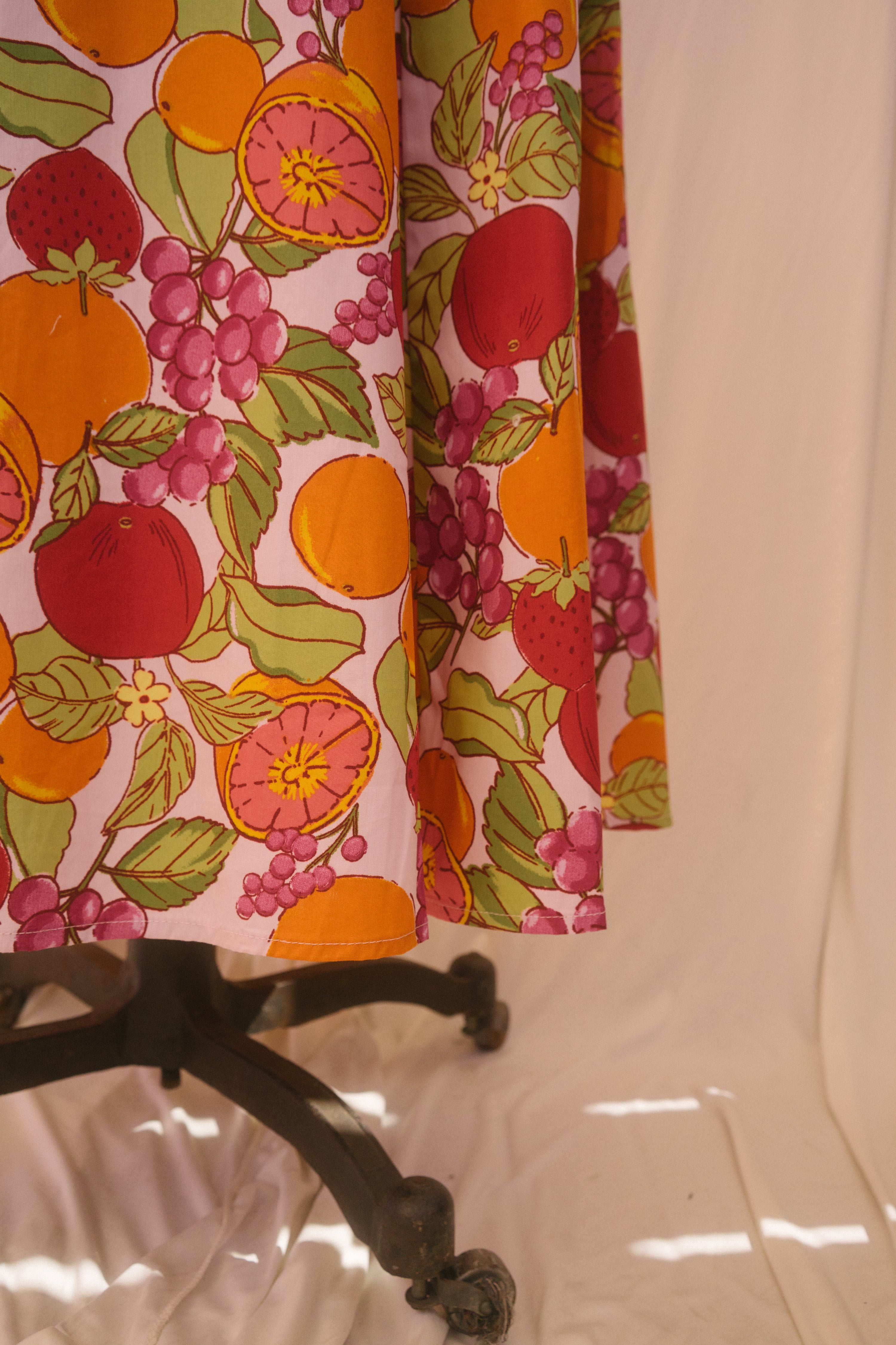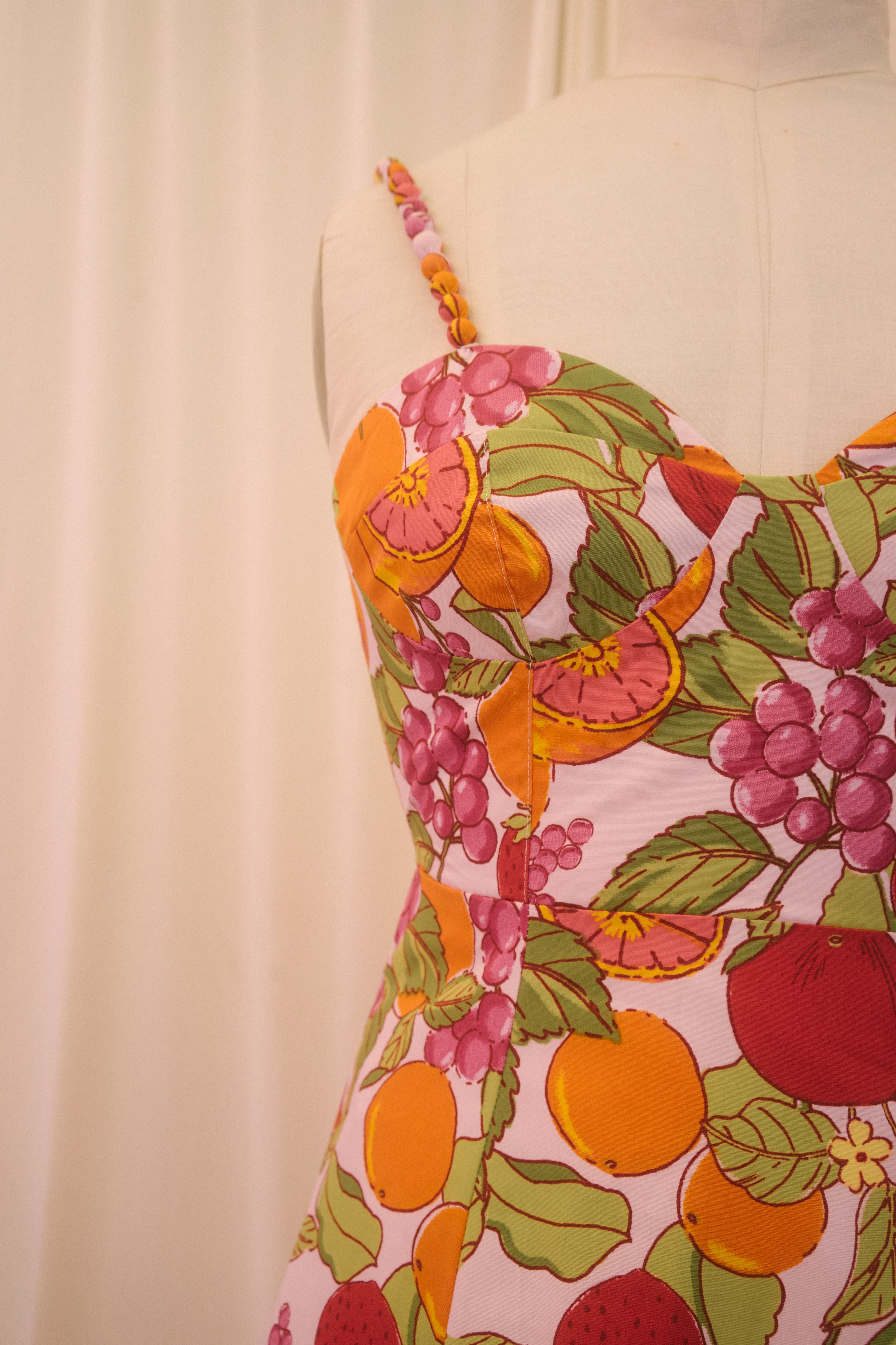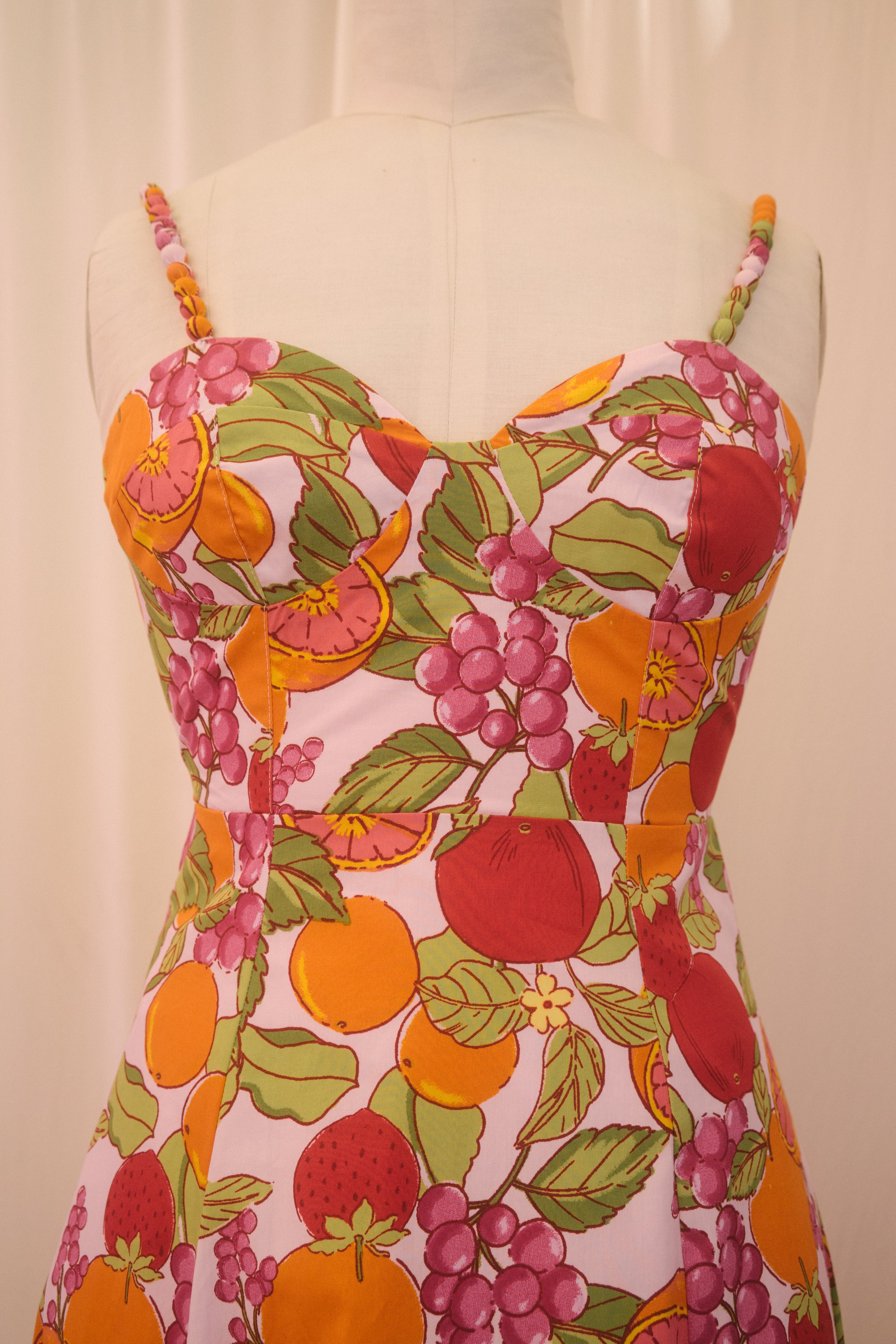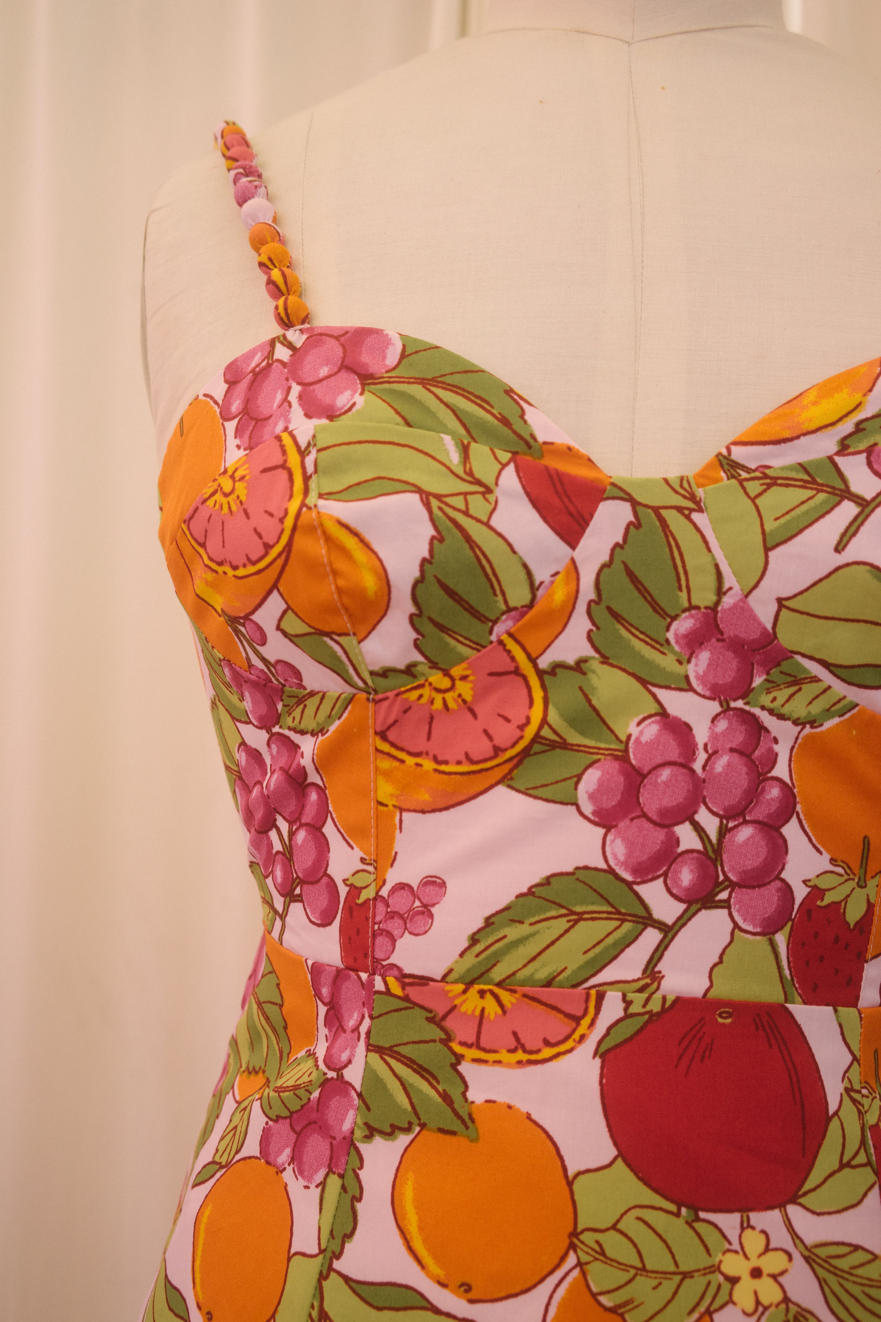 Fit for vacations on foreign beaches, the Joni Dress is a sweet bite of summer. In a pretty pastel pink hue, this midi sundress is covered in an oversized fruit print with oranges, grapes, strawberries, tomatoes and more. This beauty has a raised waistline with a sweetheart bust design and a semi smocked backside. With a fit and flare silhouette, the piece has a tapered waist that flows out into a really pretty a-line midi length skirt. Finished off with adjustable straps that have pretty ball details along the front, style with a dash of lipstick, an oversized beach bag and summer sandals.