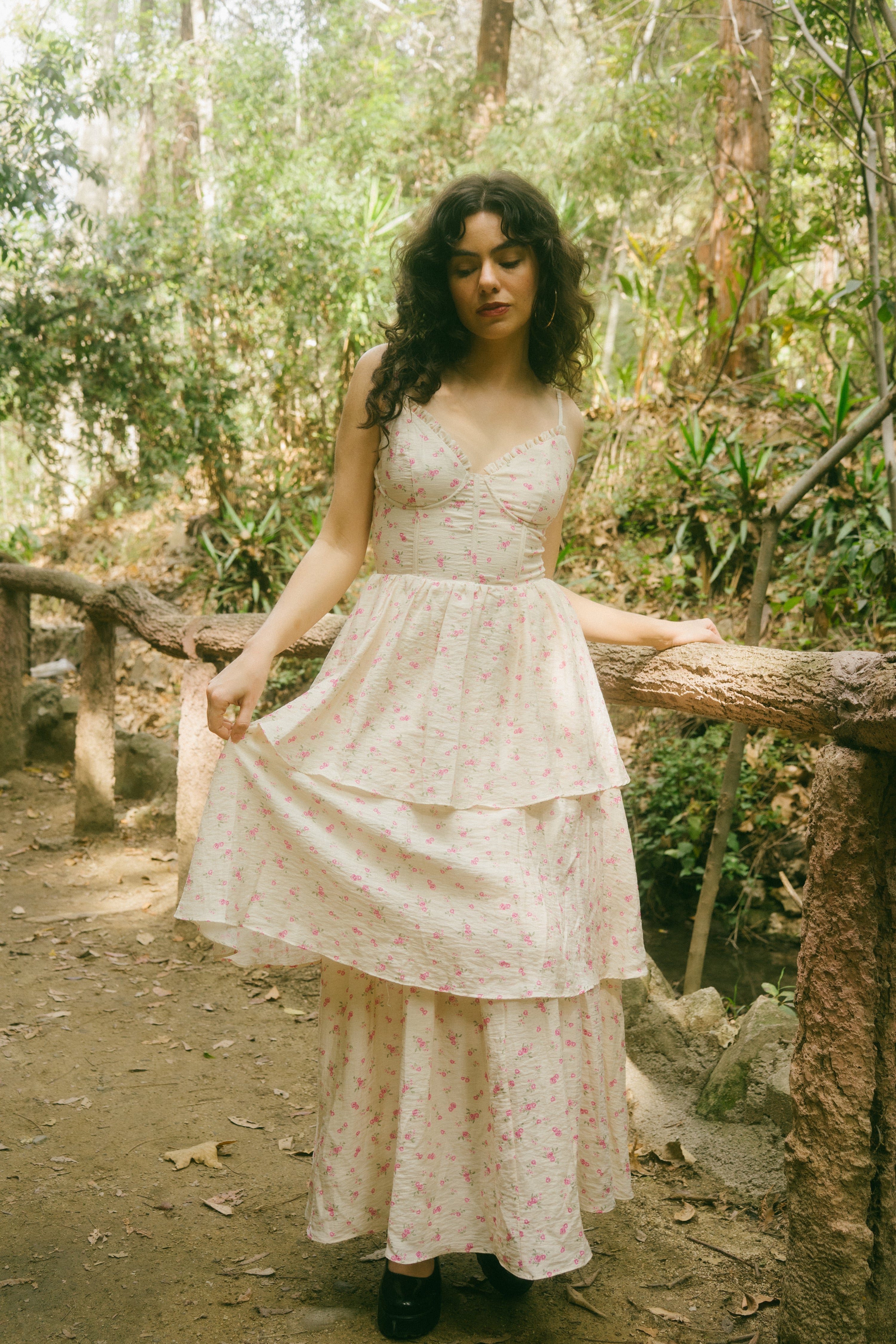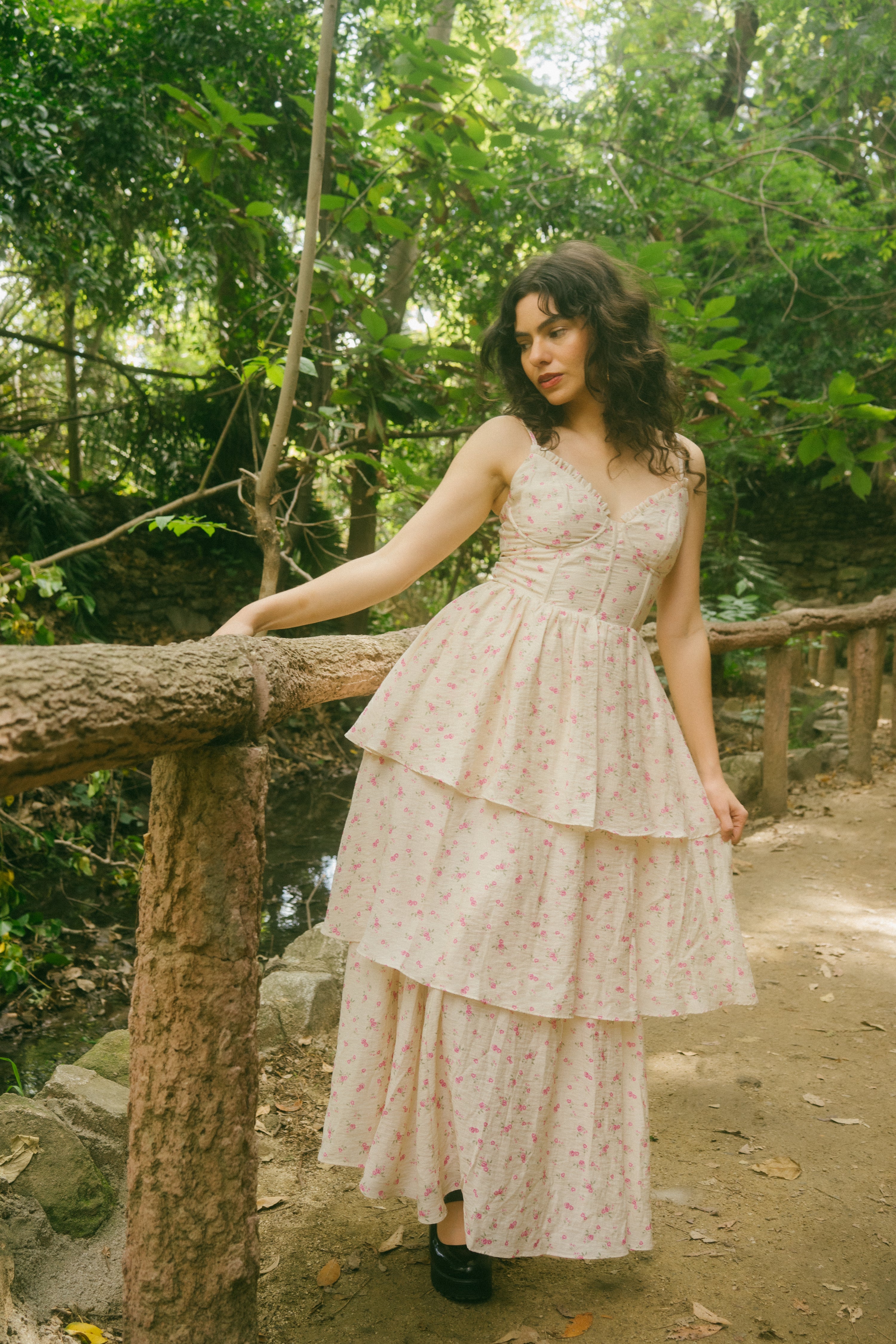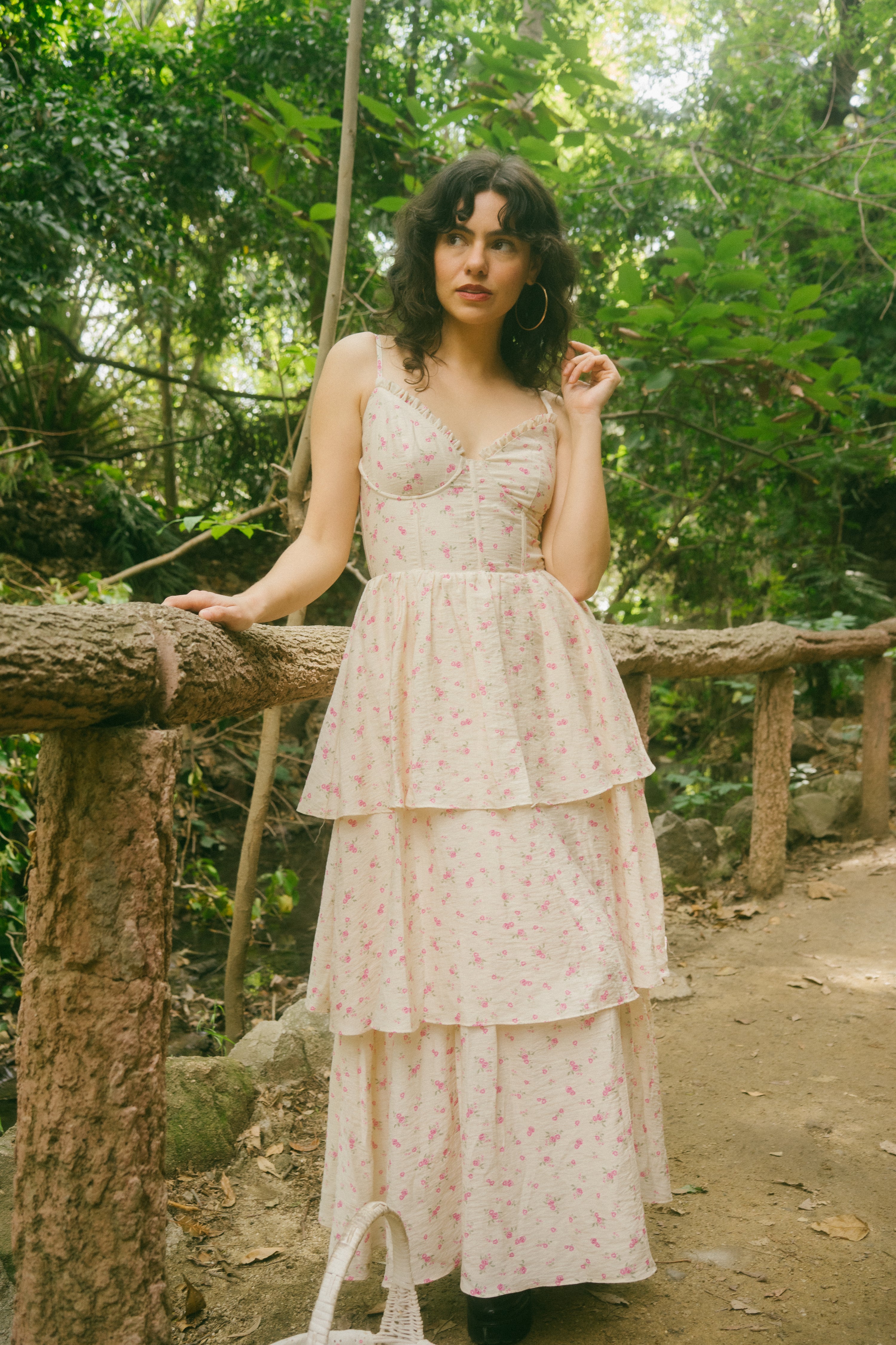 Sweet, dainty and beautiful, the Kerstin Dress comes in a cream hue and is scattered in the prettiest baby pink and soft sage green ditsy floral print. This maxi / midi sundress has a raised waistline with vertical corset boning detail along the bodice. It has adjustable buckled straps, with a v-nekcline thats decorated in an exaggerated ruffle detail. The piece has underwiring below the bust, creating a very vintage inspired bust look. Finished off with a ruffle detailing three tiered midi length fully lined skirt, style this dreamy piece with spring sandals, a dash of blush and a basket bag.