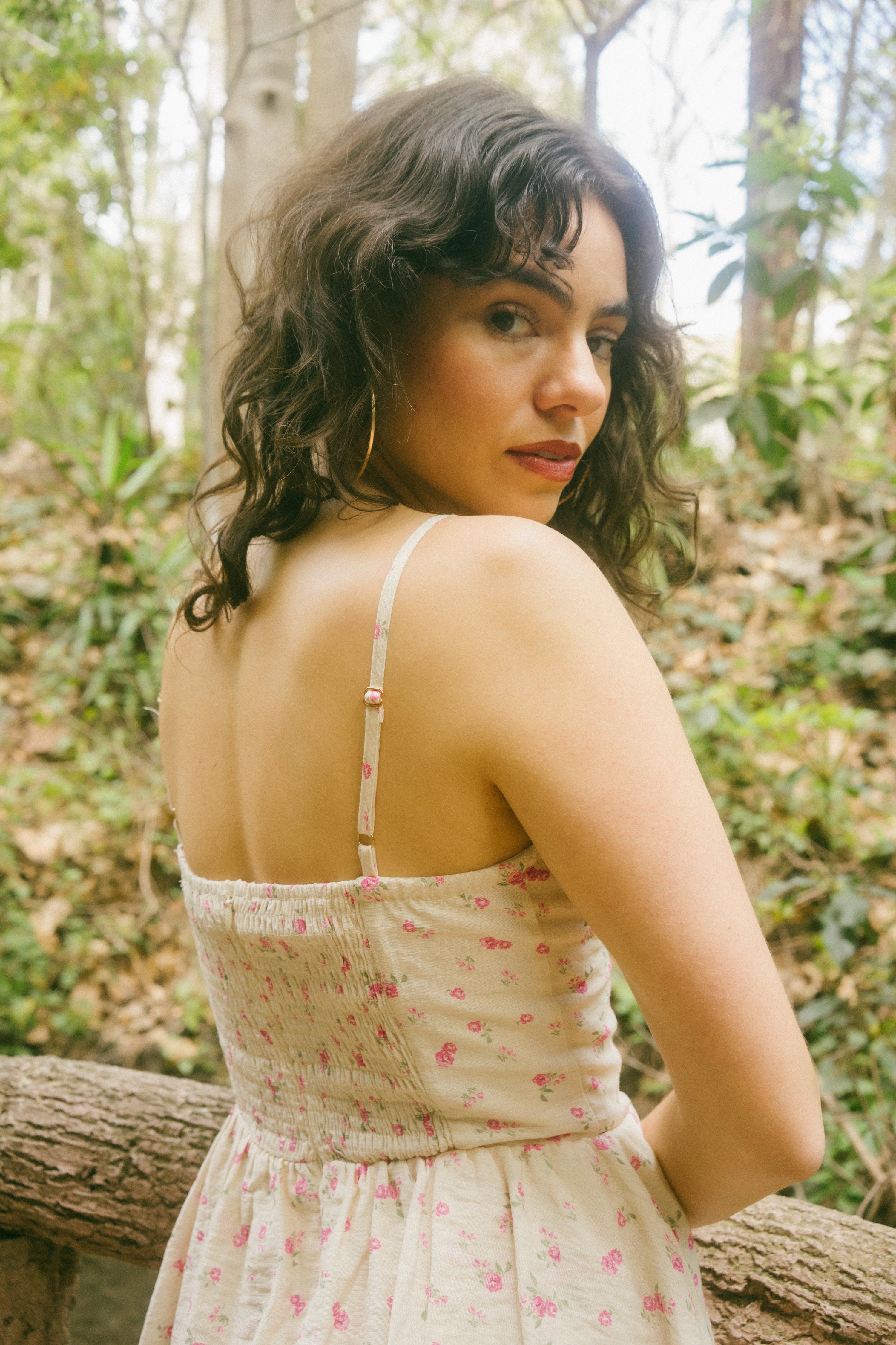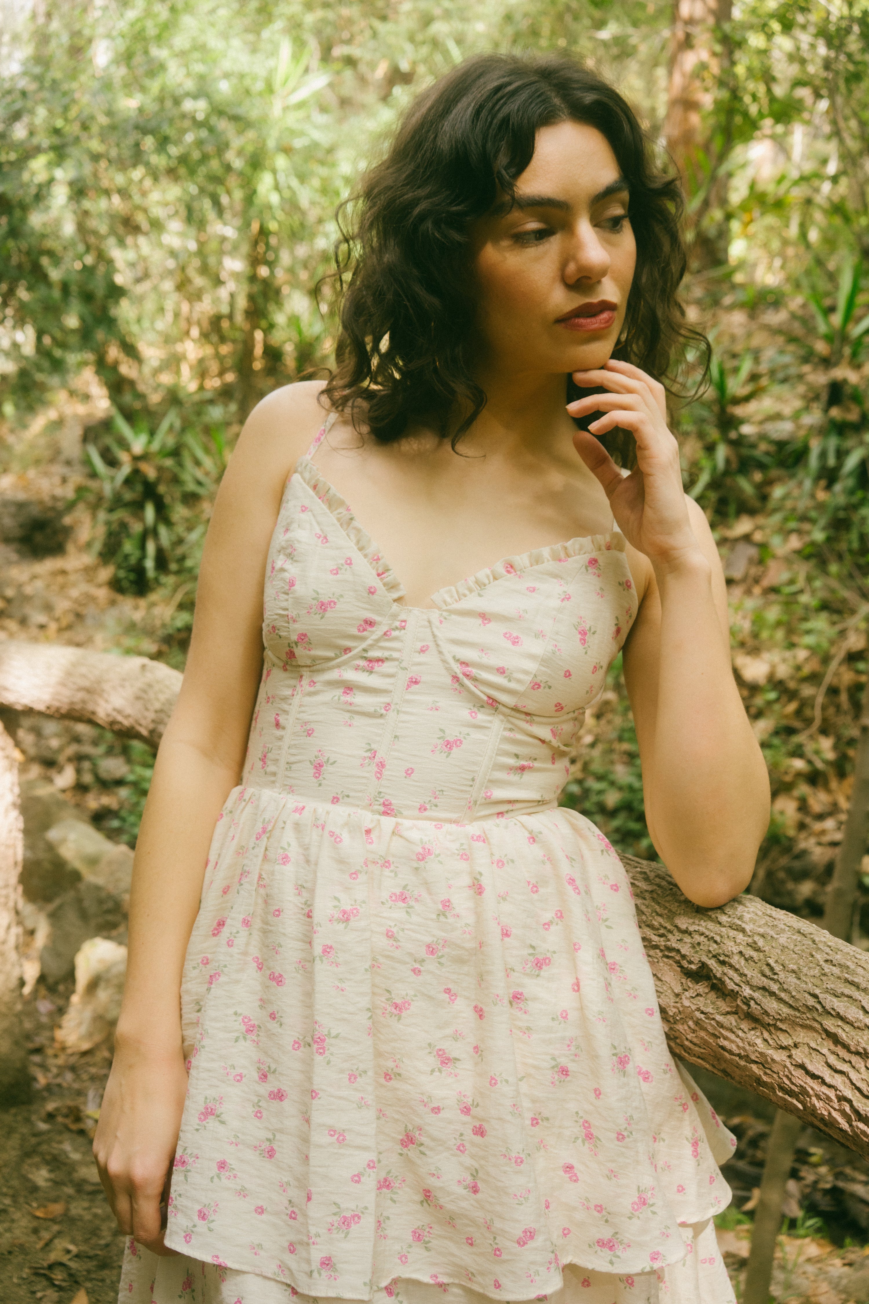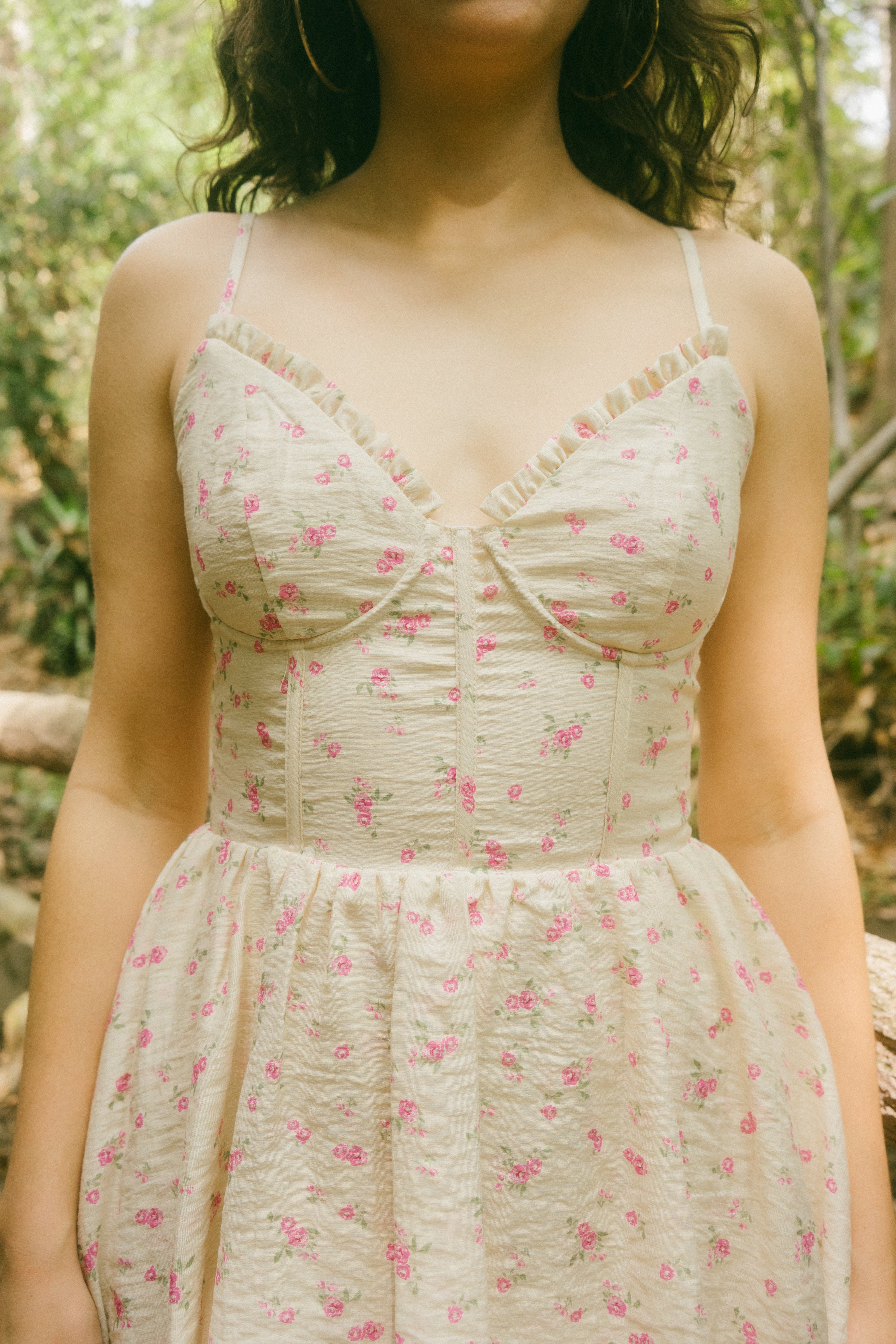 Sweet, dainty and beautiful, the Kerstin Dress comes in a cream hue and is scattered in the prettiest baby pink and soft sage green ditsy floral print. This maxi / midi sundress has a raised waistline with vertical corset boning detail along the bodice. It has adjustable buckled straps, with a v-nekcline thats decorated in an exaggerated ruffle detail. The piece has underwiring below the bust, creating a very vintage inspired bust look. Finished off with a ruffle detailing three tiered midi length fully lined skirt, style this dreamy piece with spring sandals, a dash of blush and a basket bag.