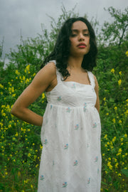 An Astrior favorite, the Mable Dress comes in a white hue and is scattered in a pastel pink, blue and green embroidered floral print. This babydoll mini sundress has a pretty argyle lace / eyelet print with an empire waistline and thick straps for sleeves. This beauty is fully lined with a square neckline and pretty mermaid midi length hemline. Finished off with a scoop open back that ties together in an oversized bow. Spend your spring in the Mable Dress!