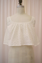 Step into summer with this romantic easy to wear cropped tank. In a solid off-white hue, the Malva Blouse has a scoop neckline, short thick strapped sleeves and a babydoll silhouette with a fitted neckline and oversized flowly bodice. The piece is decorated in a solid floral eyelet print with a romantic semi-open backside with three oversized vertical bows tieing the two sides together. Style this blouse with high waisted vintage mom jeans, an oversized tote bag and a messy updo for the perfect running errands summer look.