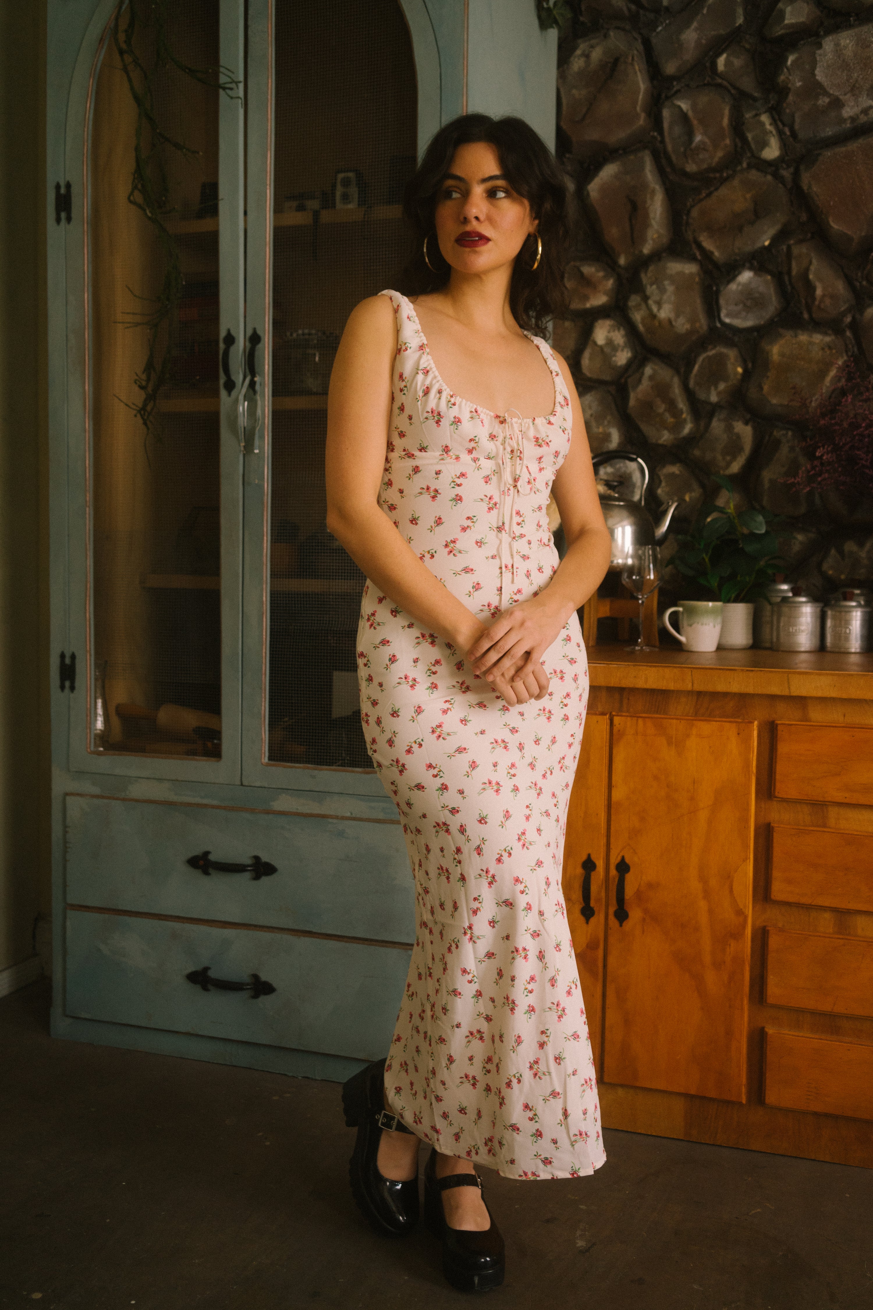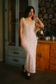 A dreamy winter to spring transition piece, the Mandie Dress comes in a darling off-white hue and is scattered in a pink, green and cream ditsy floral print. This maxi sundress has an empire waistline, with a square neckline and fabric gathering details along the bust. It has a bow that weaves through the top that makes it more adjustsble and roomy along the top. The piece has a straight fitting, slip dress silhouette with a fitted waist and hip that flows out at the hemline. Style with an oversized knit, Mary Jane slides and an oversized basket bag.