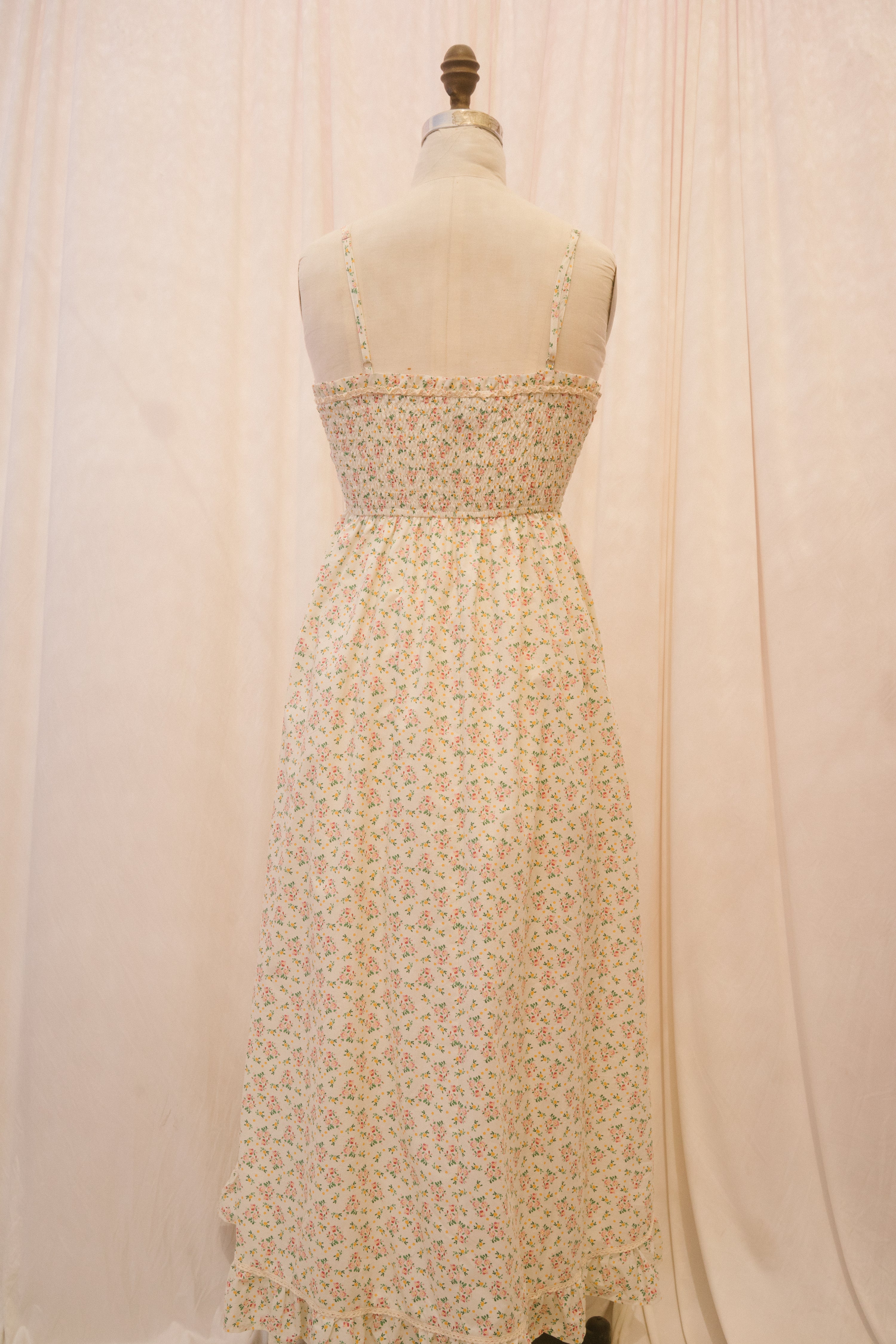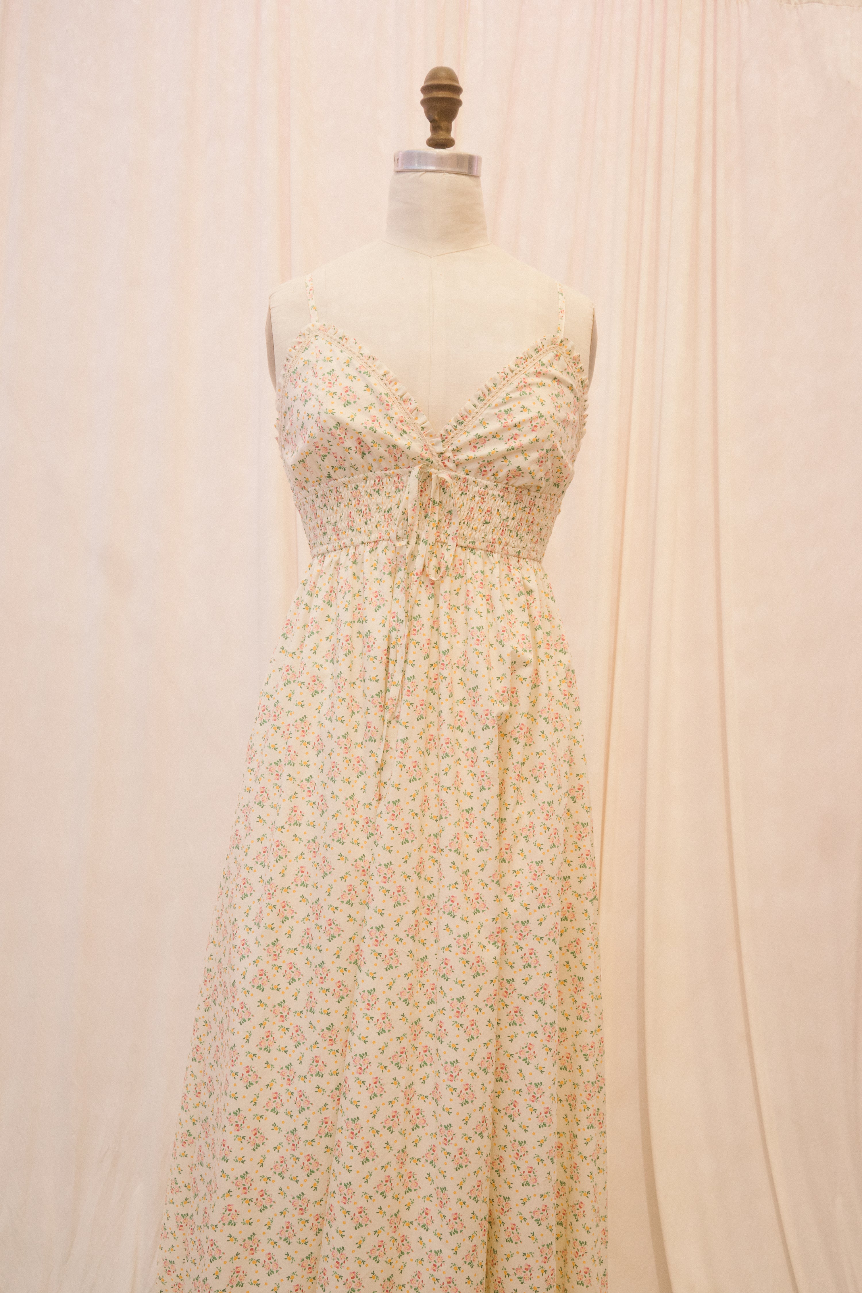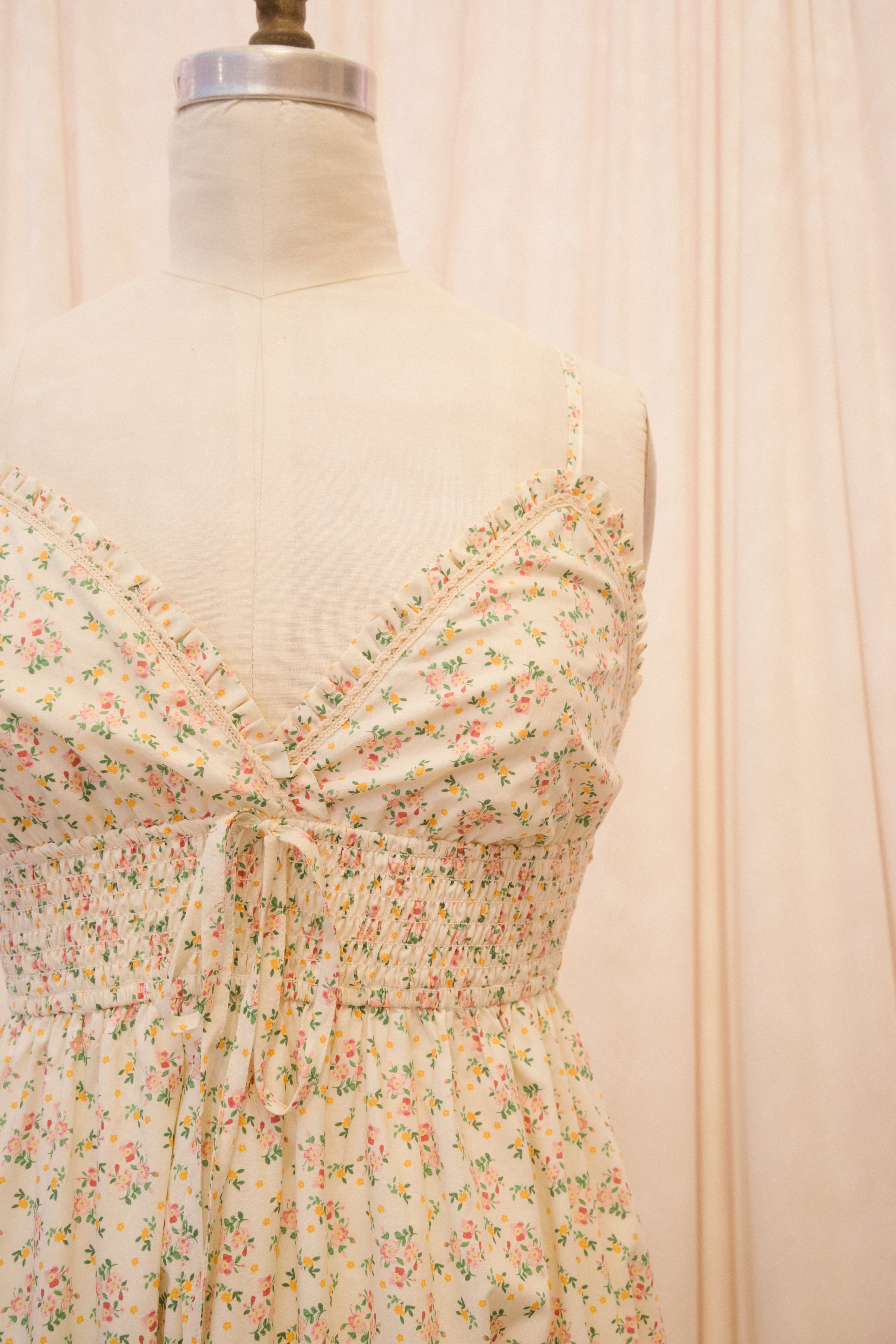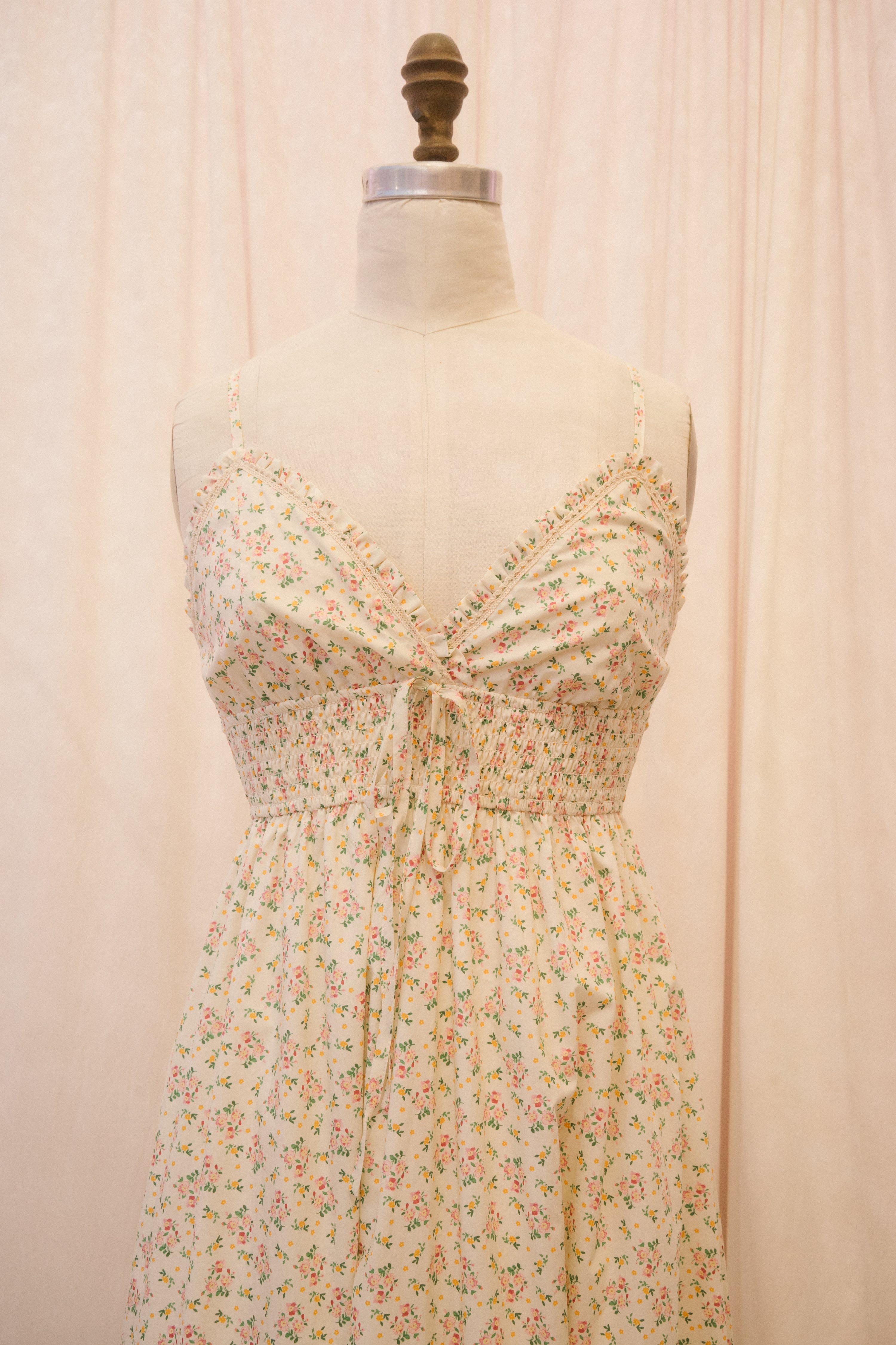 Named after the boho style icons of the early 2000s, this romantic v-neck midi sundress comes a in a warm, creamy fabric flecked in a delicate ditsy floral print with mustard, rose, and green blooms. The fully smocked bodice and adjustable spaghetti straps make for maximum comfort, while the delicate frilled neckline, bow-tie bust, and dentelle style embroidery on the bodice and bottom of the skirt add visual interest. Throw on a pair of granny sunglasses that are 5x bigger than your face and a floppy hat and you're ready to face the flash of the paparazzi!