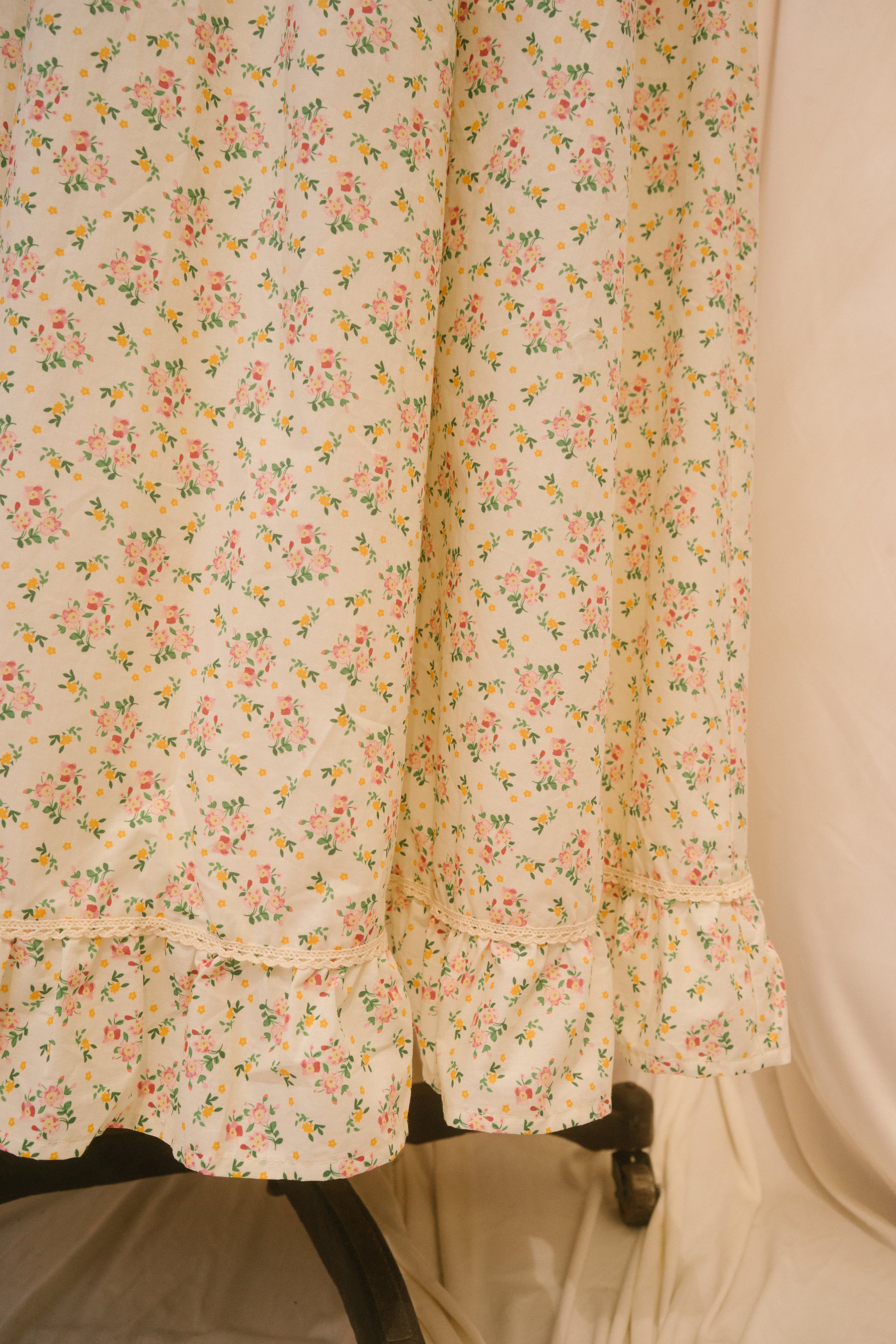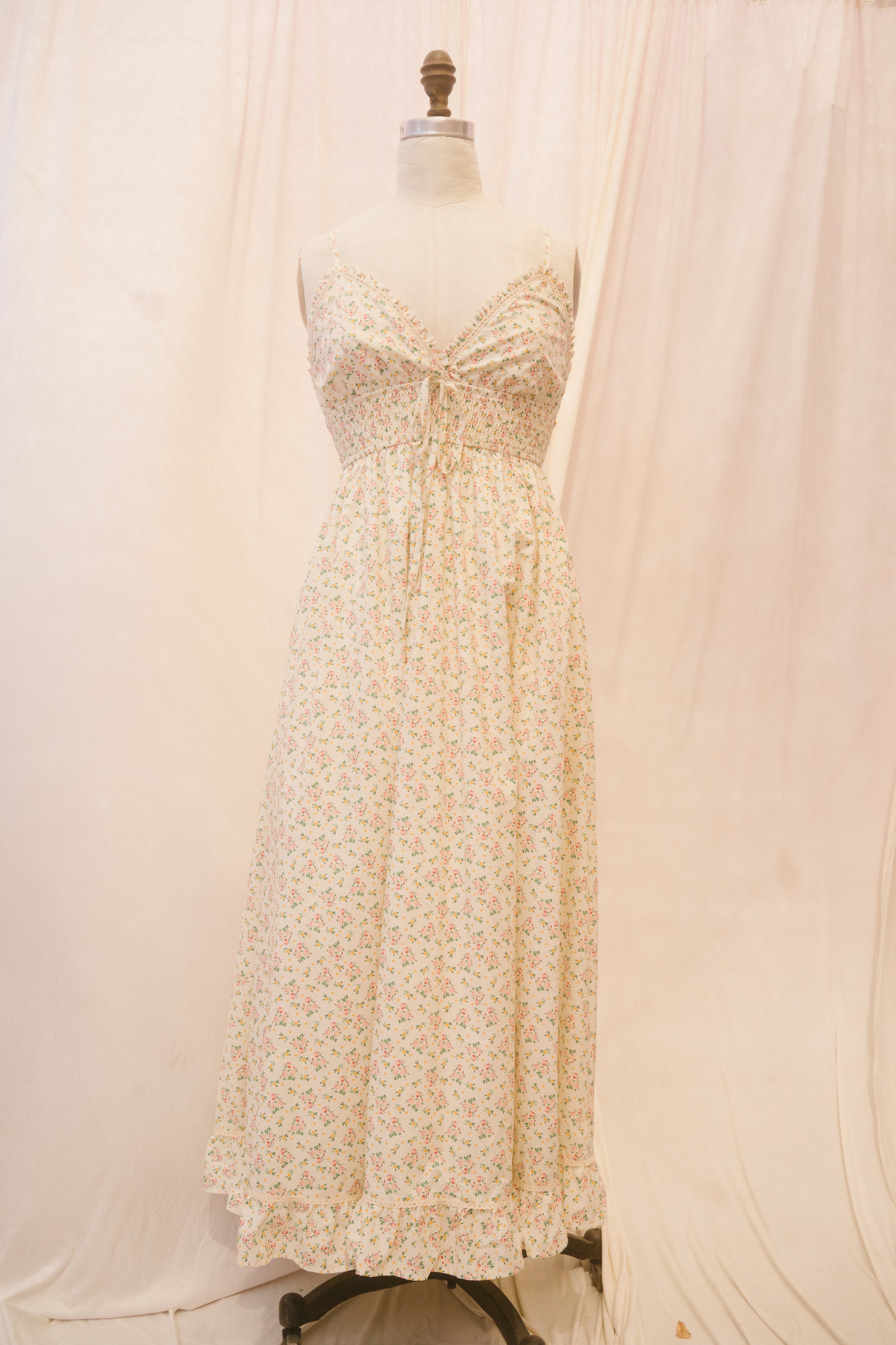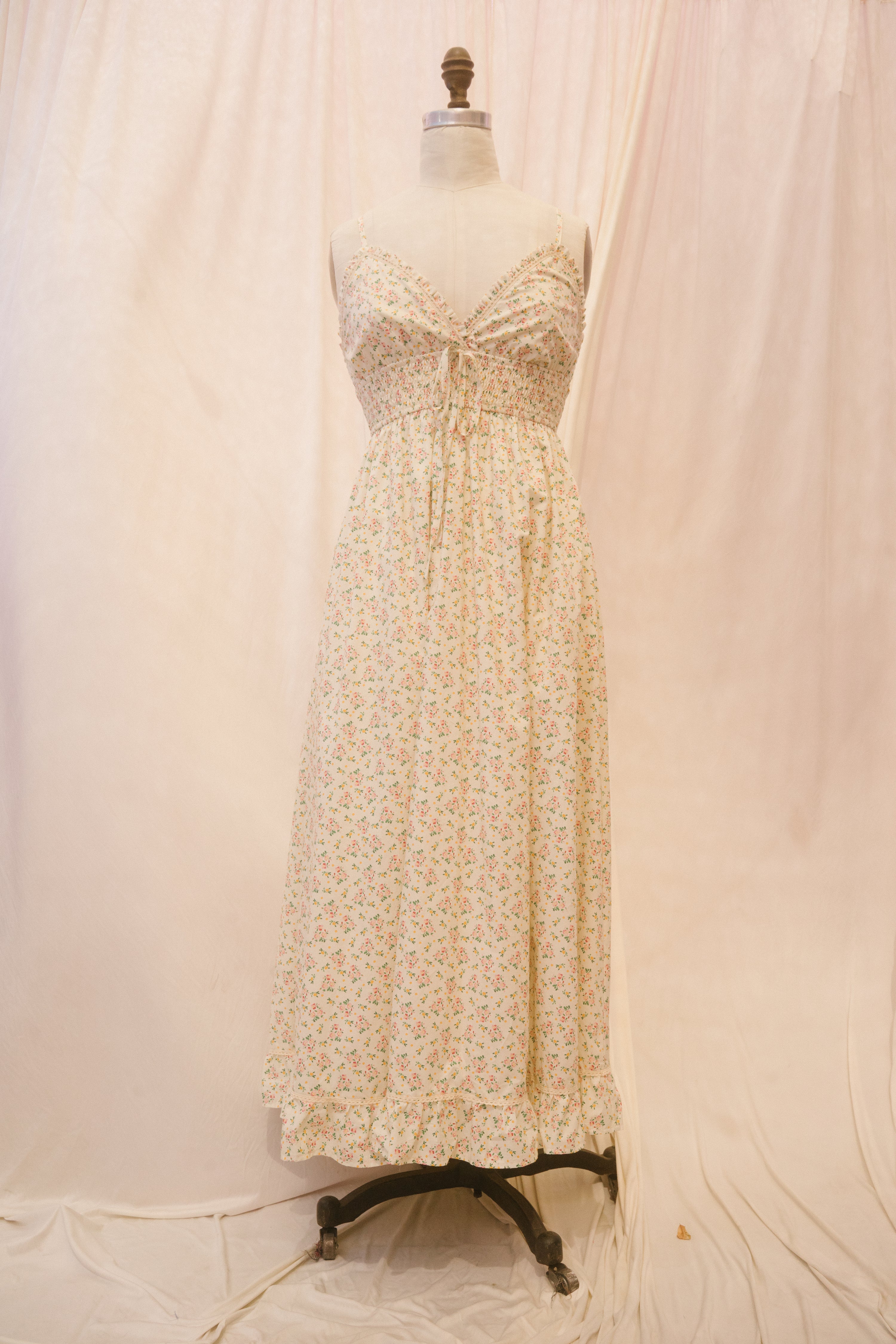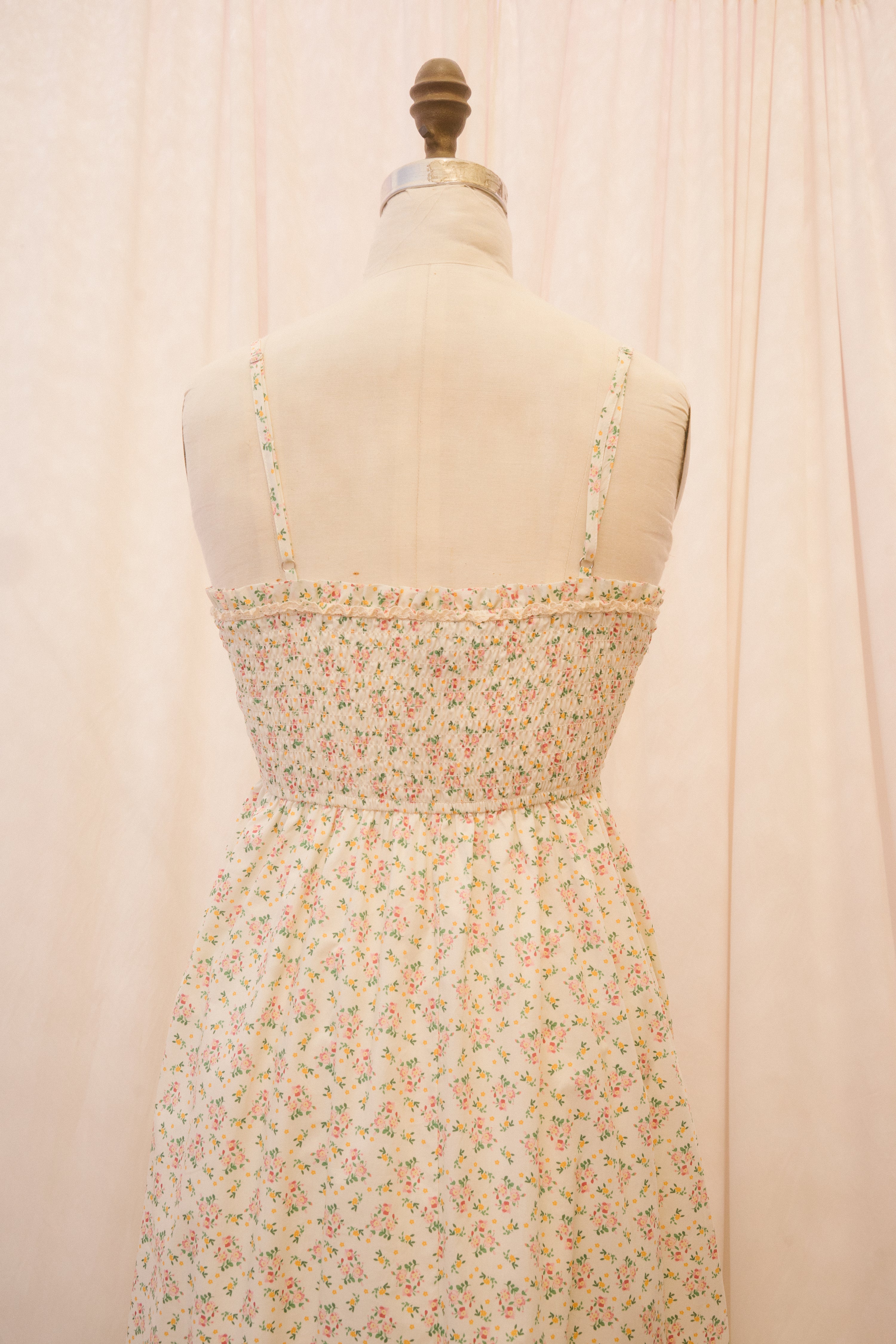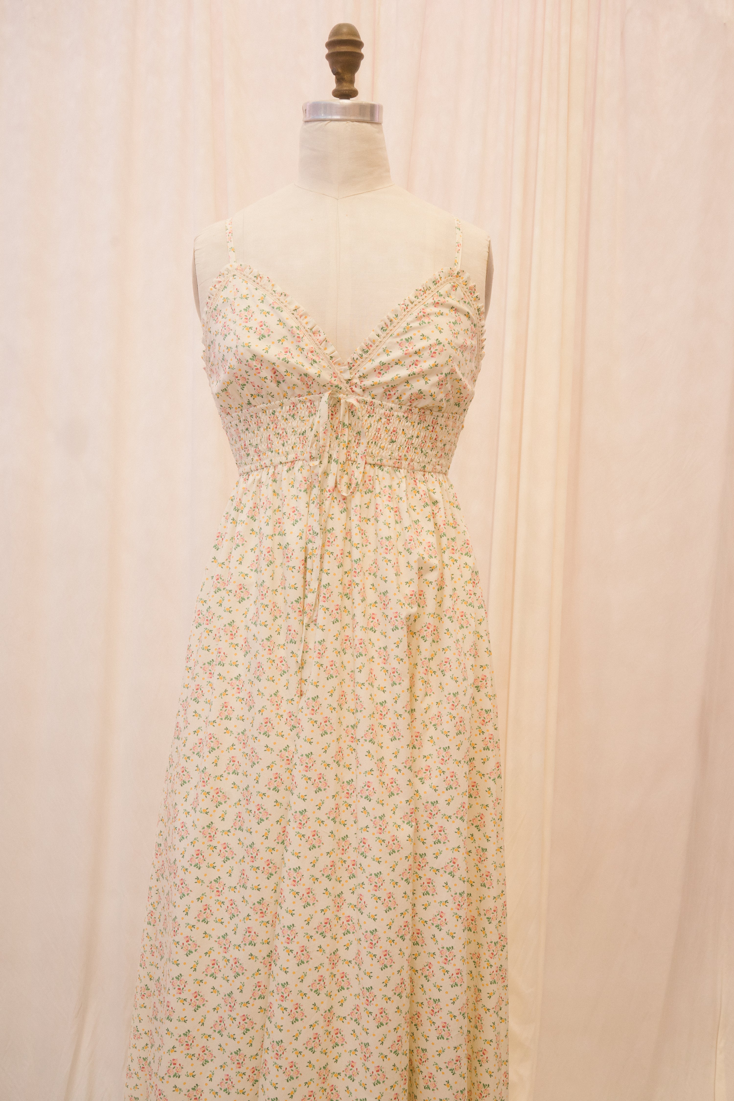 Named after the boho style icons of the early 2000s, this romantic v-neck midi sundress comes a in a warm, creamy fabric flecked in a delicate ditsy floral print with mustard, rose, and green blooms. The fully smocked bodice and adjustable spaghetti straps make for maximum comfort, while the delicate frilled neckline, bow-tie bust, and dentelle style embroidery on the bodice and bottom of the skirt add visual interest. Throw on a pair of granny sunglasses that are 5x bigger than your face and a floppy hat and you're ready to face the flash of the paparazzi!
