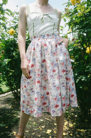 Inspired by sweet fantasy paintings, the Monet Skirt comes in a cream, muted red, blue and sage green watercolor floral print. This beautiful midi skirt has an elasticated waistband, and a flowy midi length skirt. Did we mention it has pockets too? Style with a beautiful eyelet blouse, vintage slides and a messy updo for a timeless vintage inspired look.