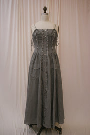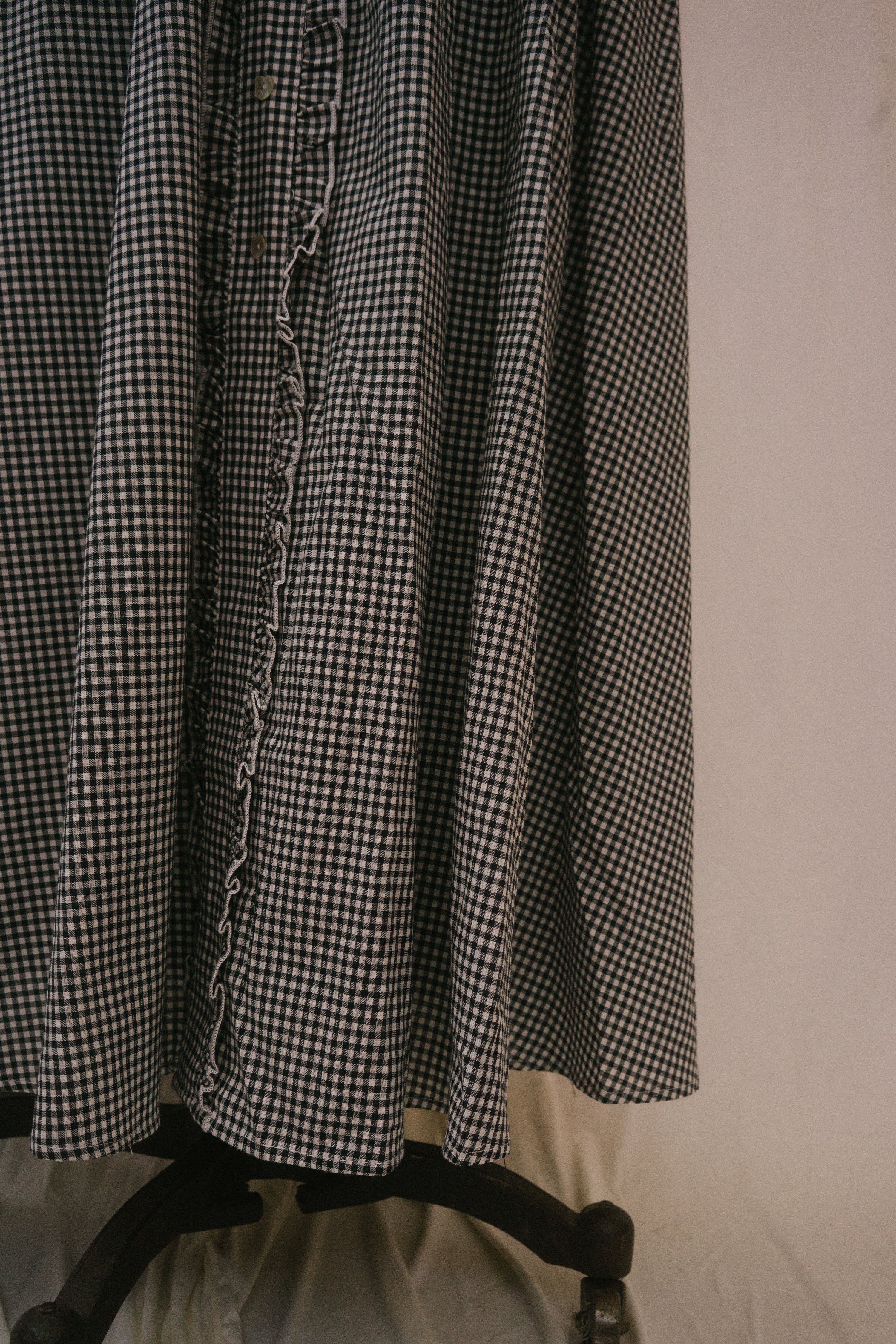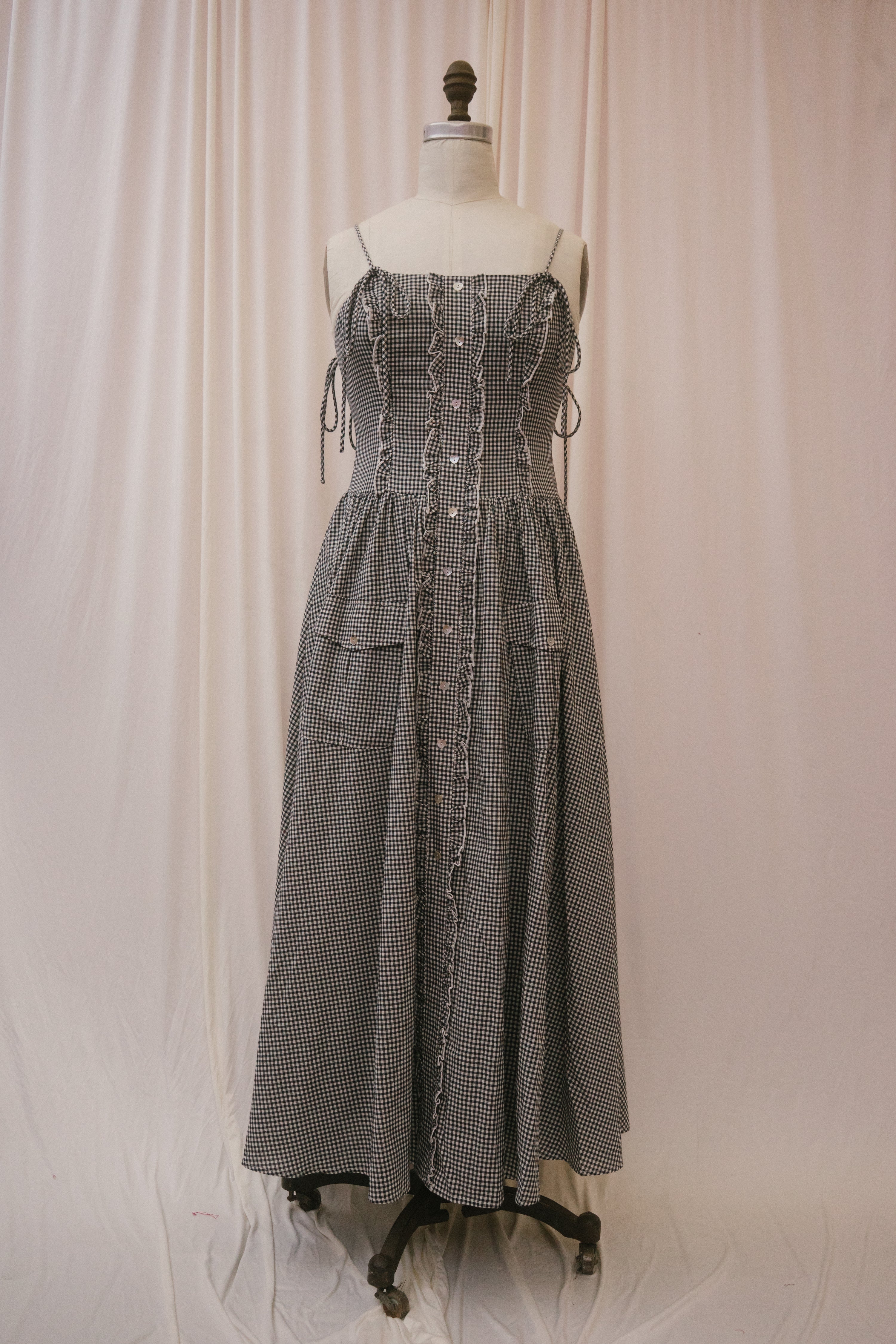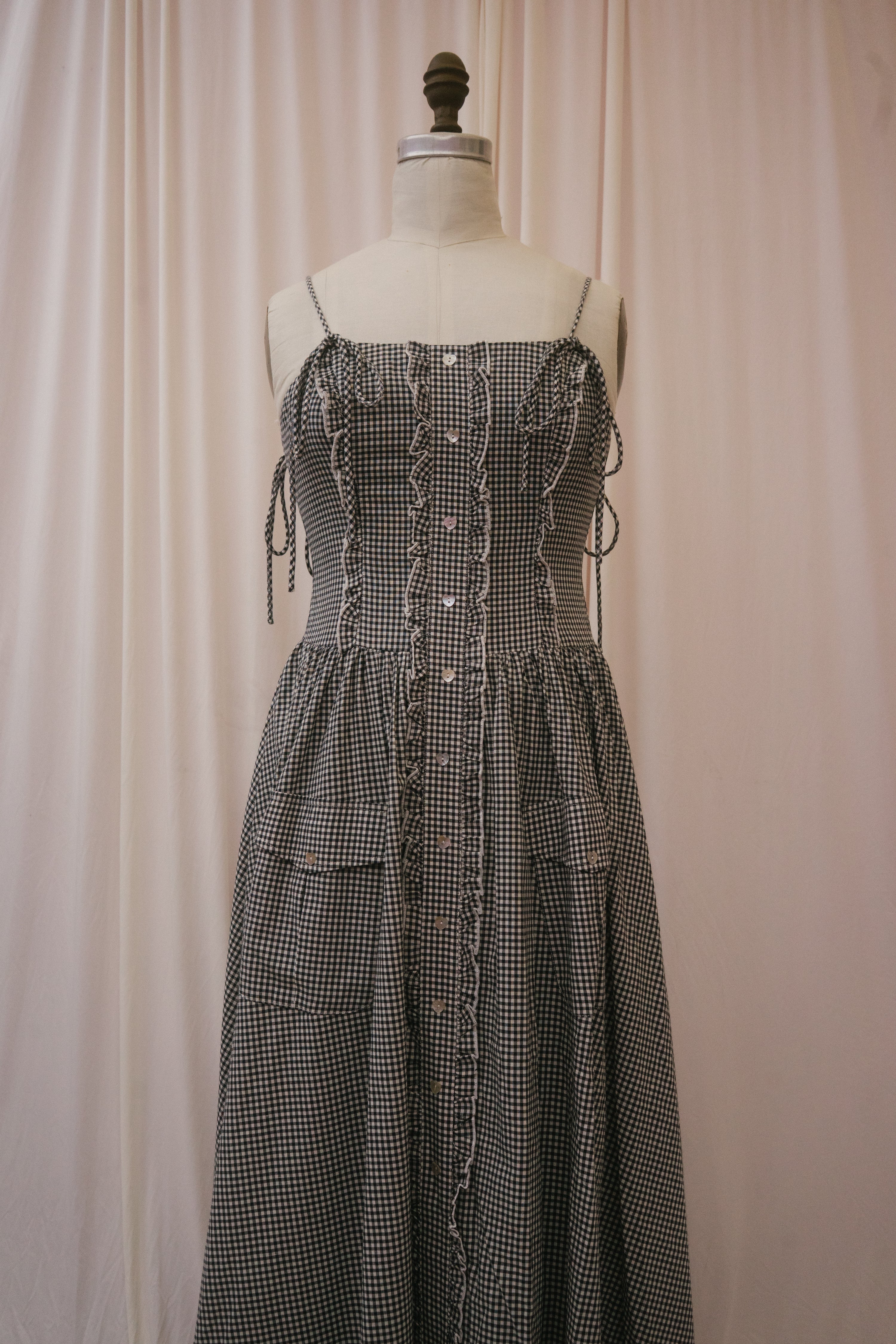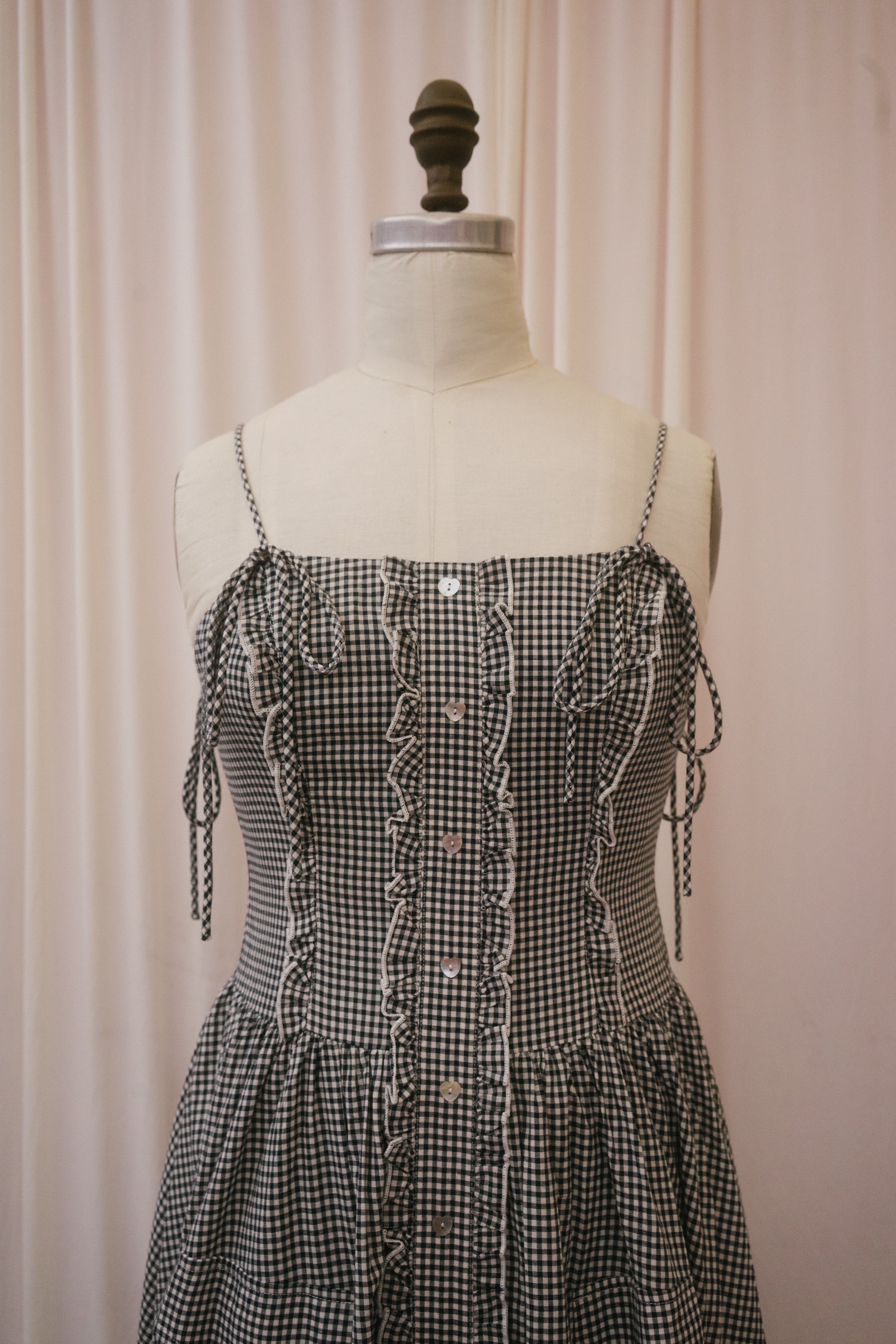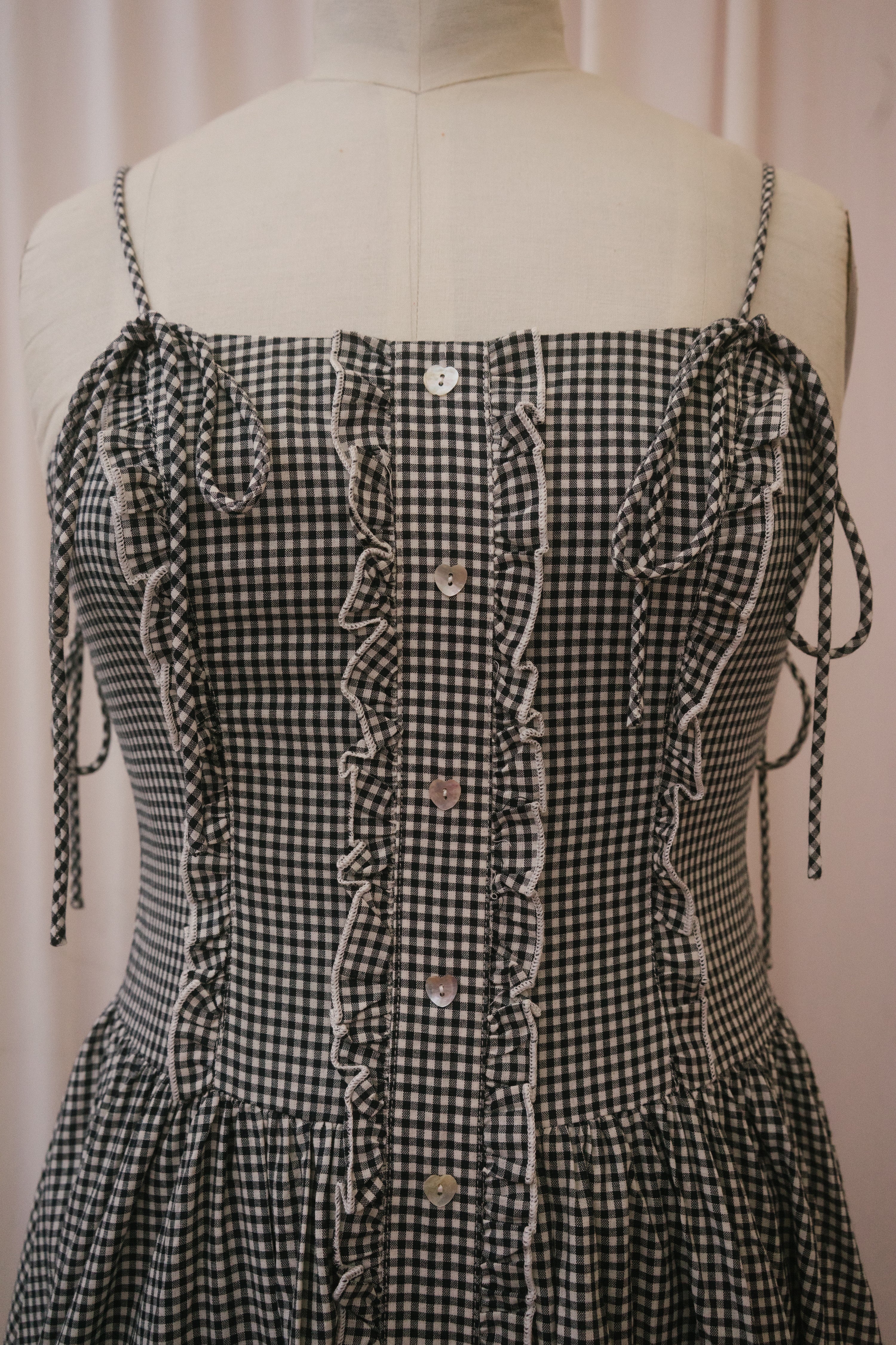 Every inch of the Nina dress is just darling! This maxi length black and white gingham sundress features delicate spaghetti straps decorated with dainty bows at both the front and back of the bodice. Functional heart-shaped mother-of-pearl buttons sit atop an ample middle ruffle that runs from top to bottom of the dress, and the square neck bodice is flanked with frills on either side. The two functional flap pockets at the front of the skirt are large enough for your phone, and finished with buttons so you can leave your purse at home. The a-line skirt falls from the natural waist with just the right amount of volume. The back is fully adjustable, with a central zipper, elasticated waist, and smocked bodice.