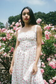 A sweet ode to Victorian Day dresses with a modern twist, the Nora Dress comes in a cream hue and it's scattered in a pink, red, gold and green rosy floral print. This midi sundress has adjustable straps, fabric gathering along the bust and lace trimming detail along the neckline. The piece has functional buttons along the bust and decorative buttons down the center of the silhouette. It has a vintage inspired basque waistline with a darling functional corset back. Style this dress with a dash of lipstick, vintage slides and an oversized sunhat for the most romantic summers day attire.