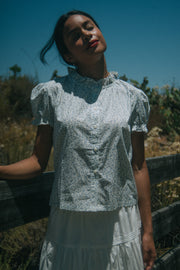 Inspired by the English countryside, the Oona Blouse comes in a pretty off-white hue and is scattered in a soft baby blue ditsy floral print with functional buttons along the front of the front of the bodice. This beauty has short puff sleeves with exaggerated ruffle detailing along the sleeves and along the high neck collar. A timeless piece, style with your favorite midi skirt or jeans, an oversized basket bag and summer slides.