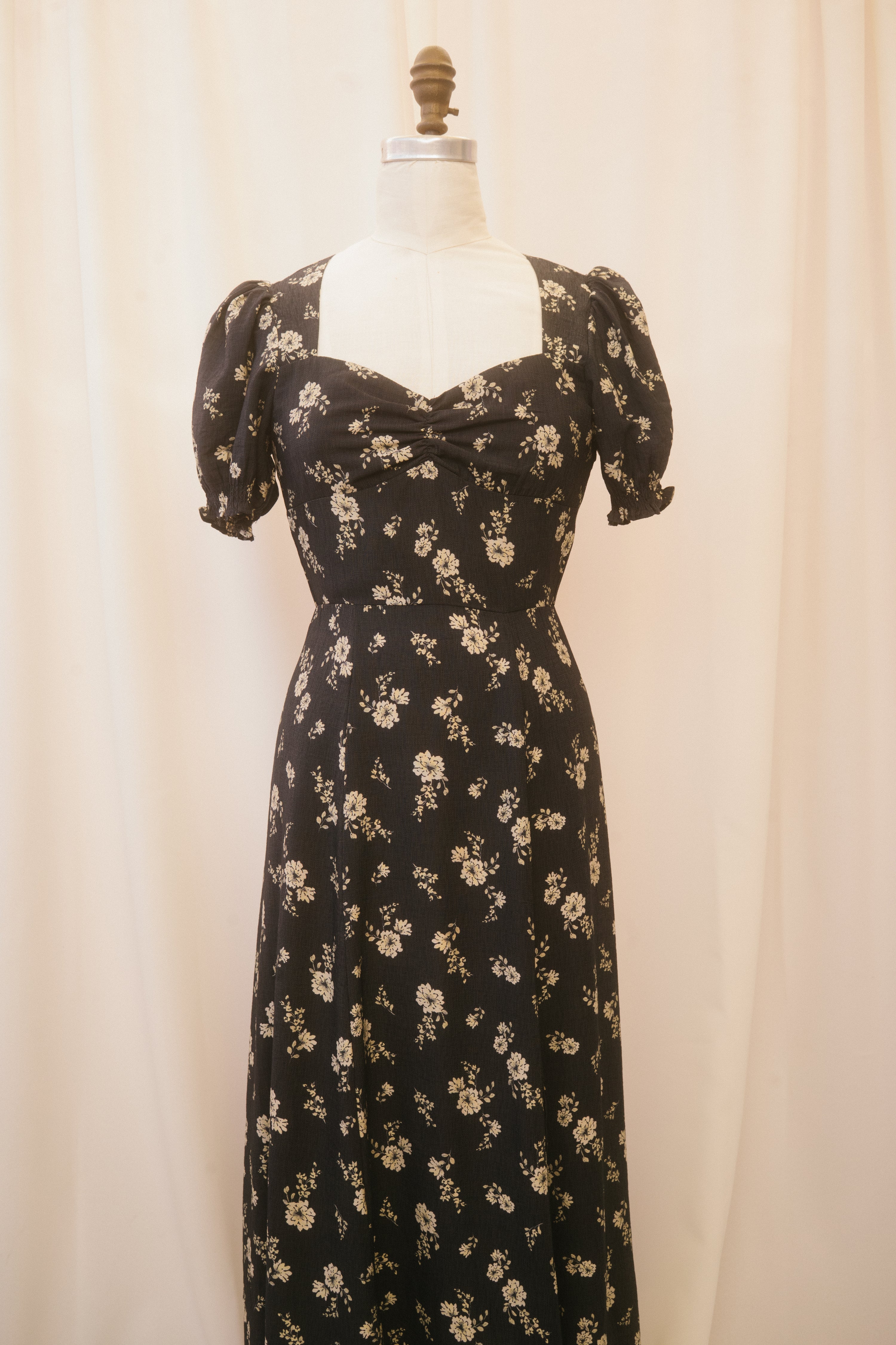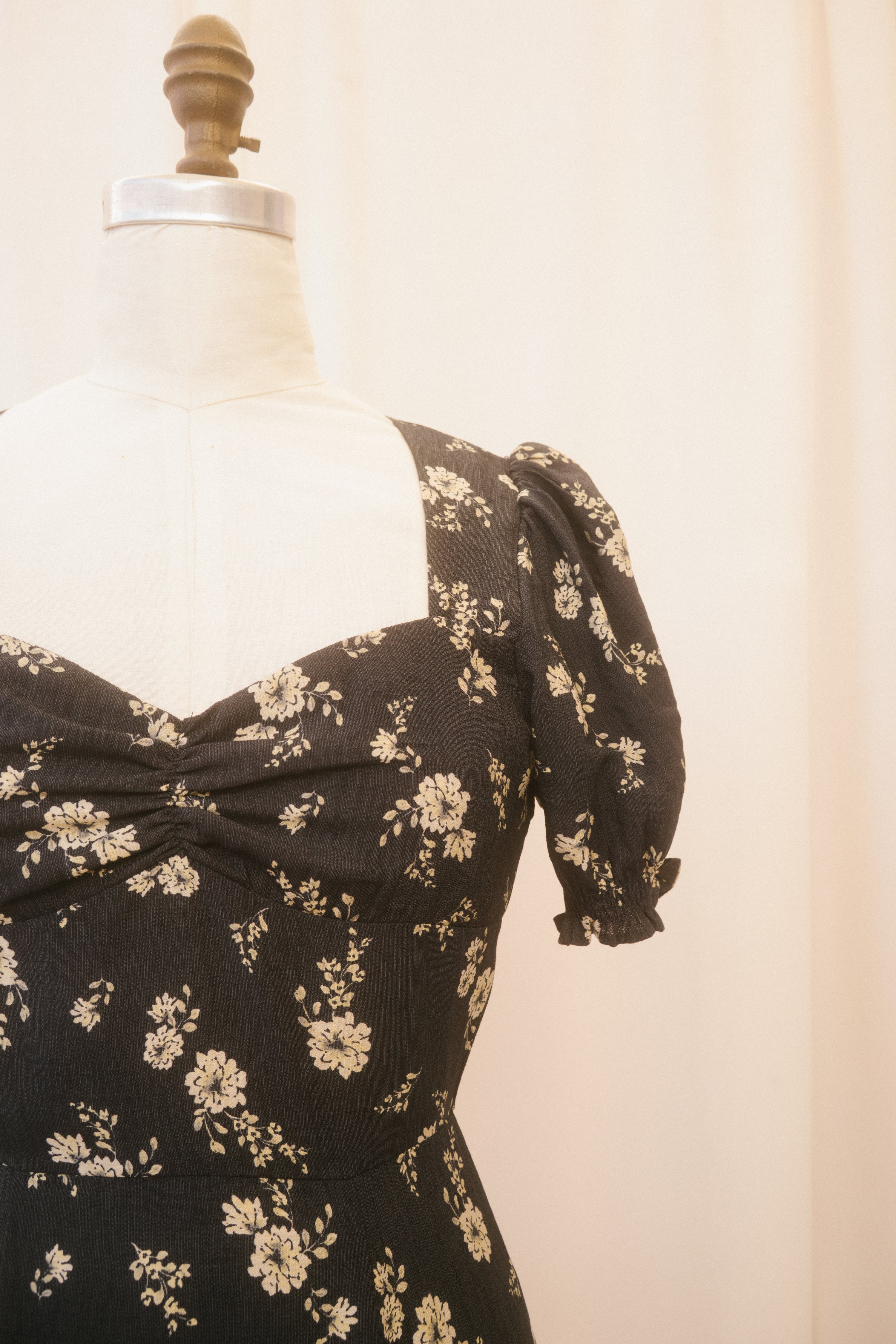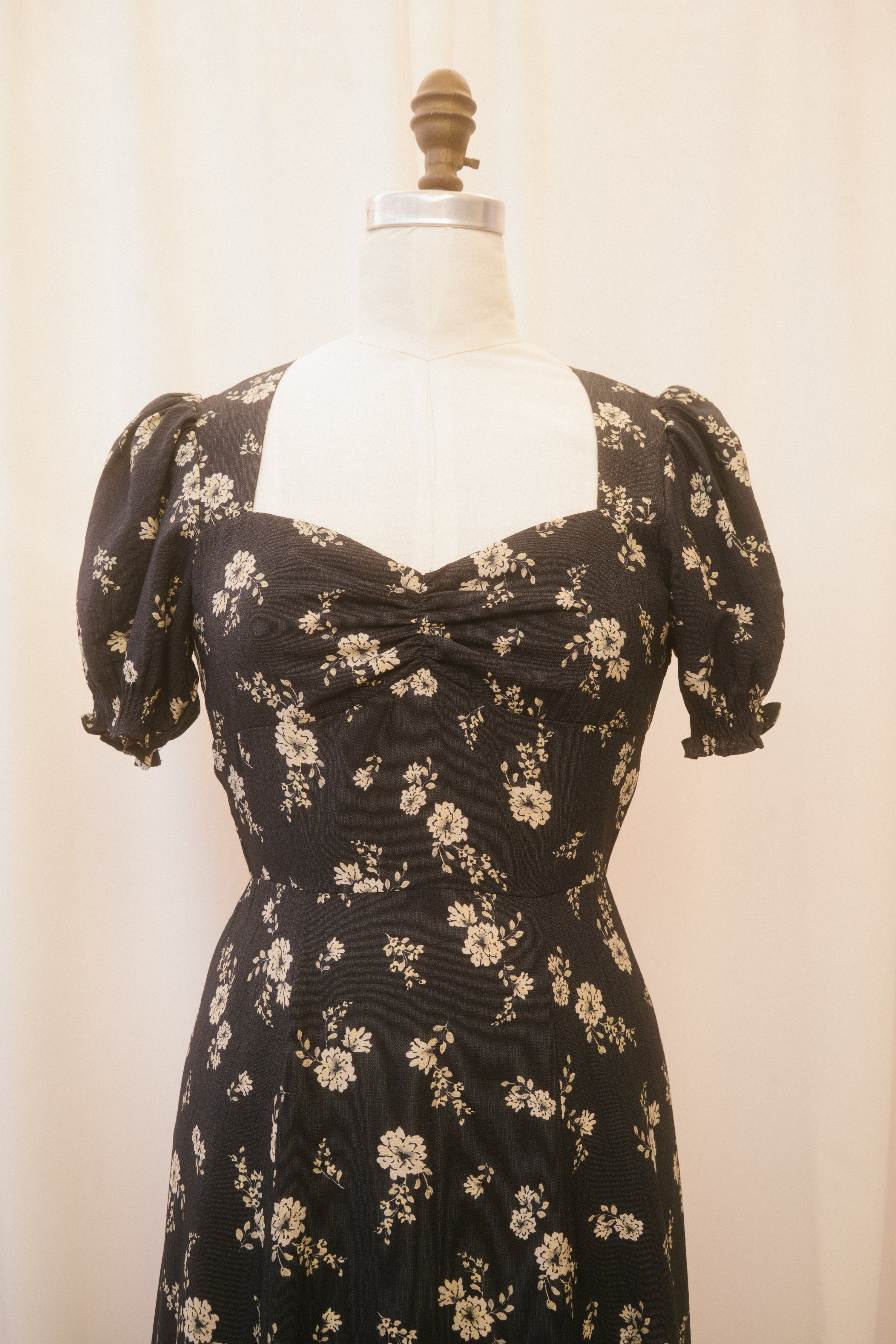The Pamela dress is truly versatile -- the sweet silhouette is perfect for day, but the slinky fabric is evening-ready! This deep navy midi dress features a creamy gold floral print throughout, with short puff sleeves, a sweetheart neckline, and empire waist. The pockets and elastic waist make the Pamela perfect for day-to-night comfort, style, and function.