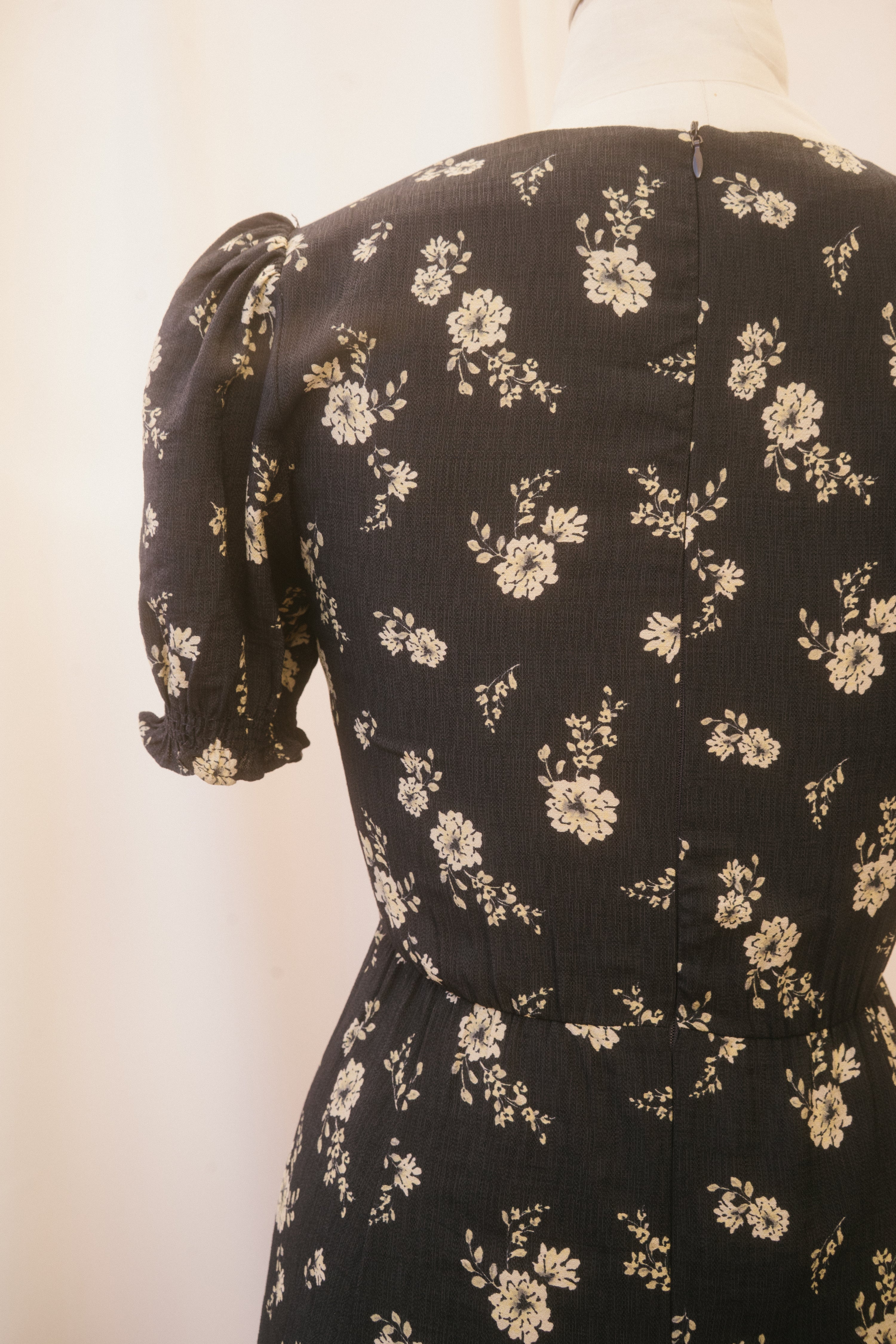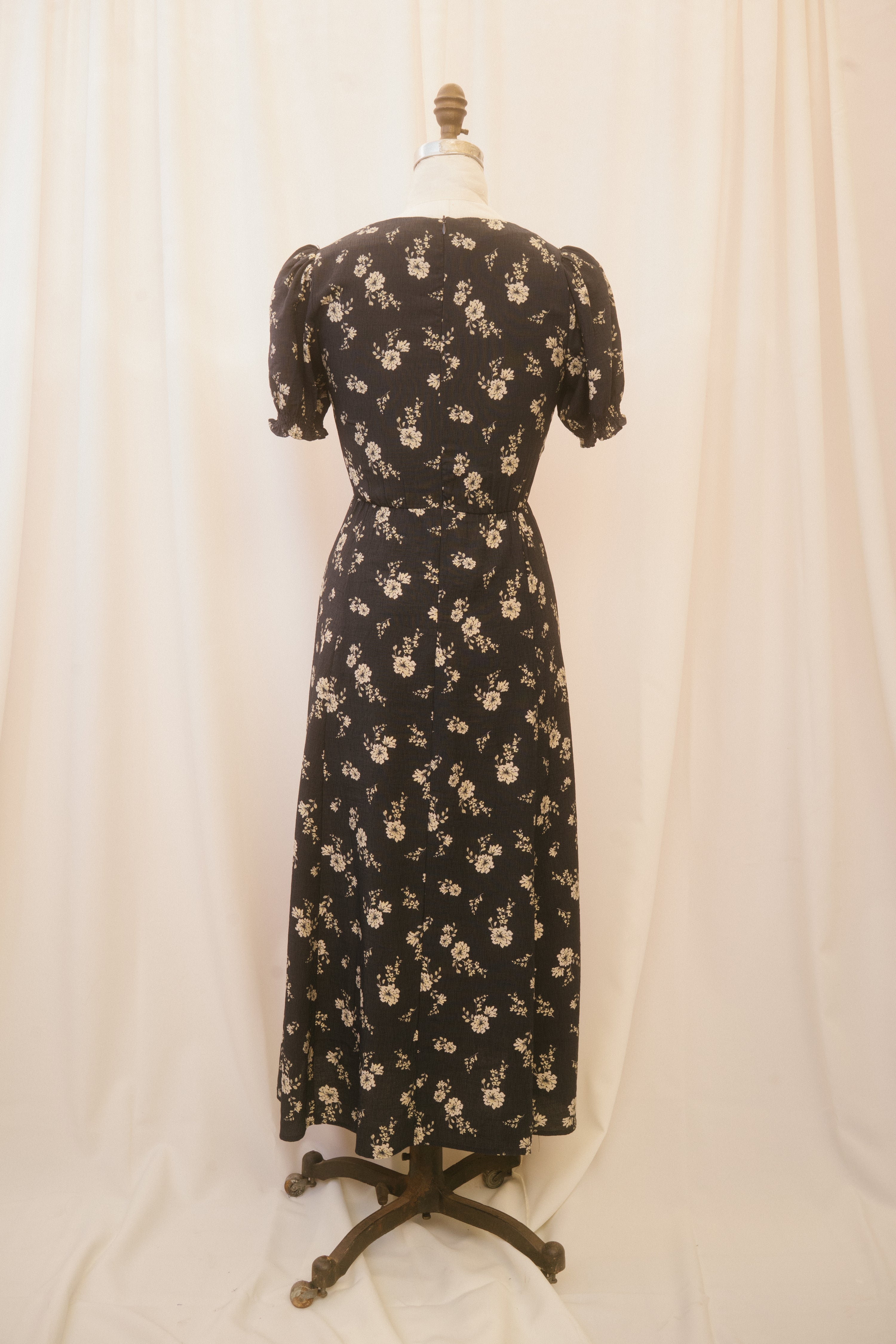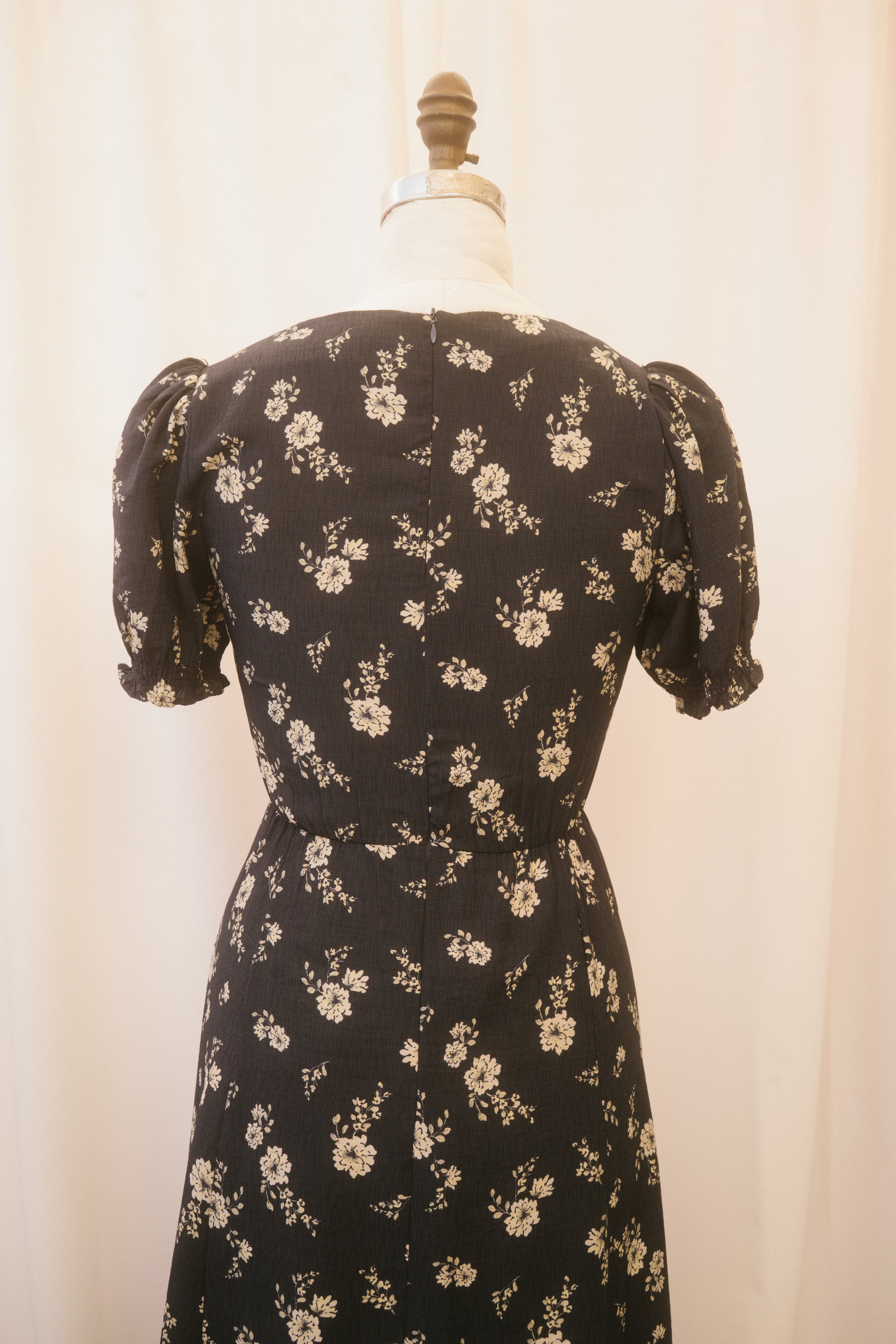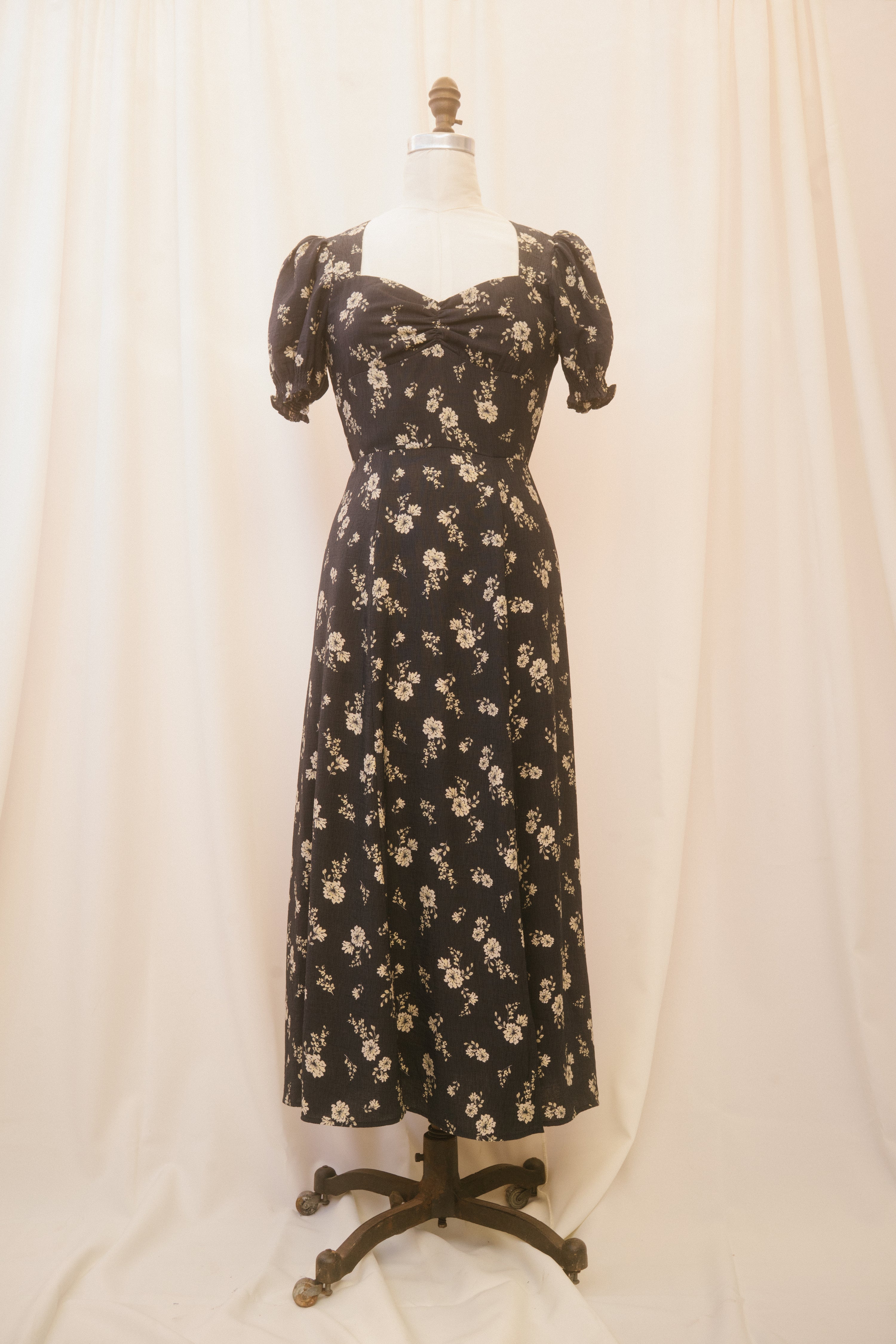 The Pamela dress is truly versatile -- the sweet silhouette is perfect for day, but the slinky fabric is evening-ready! This deep navy midi dress features a creamy gold floral print throughout, with short puff sleeves, a sweetheart neckline, and empire waist. The pockets and elastic waist make the Pamela perfect for day-to-night comfort, style, and function.
