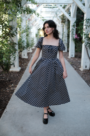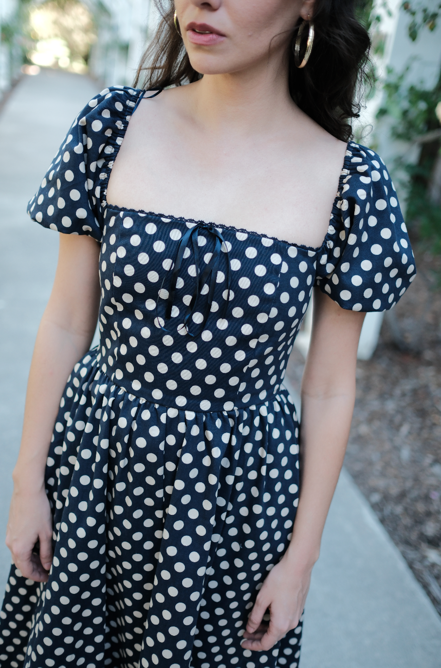 Inspired by 1950's house dresses, the Payton Dress comes in a dreamy navy blue hue and is scattered in a darling off-white oversized polka dot print. This midi dress has a raised waistline with short exaggerated puff sleeves and a vintage inspired square neckline. The piece has a fitted bust and waist with smocking along the backside for extra stretch and move. It has fabric gathering detail along the waistline that flowly out into a romantic a-line midi length skirt. Finished off with a darling navy blue bow in the center of the neckline, this vintage inspired piece is perfect styled with Mary Janes, a dash of lipstick and an oversized basket bag.