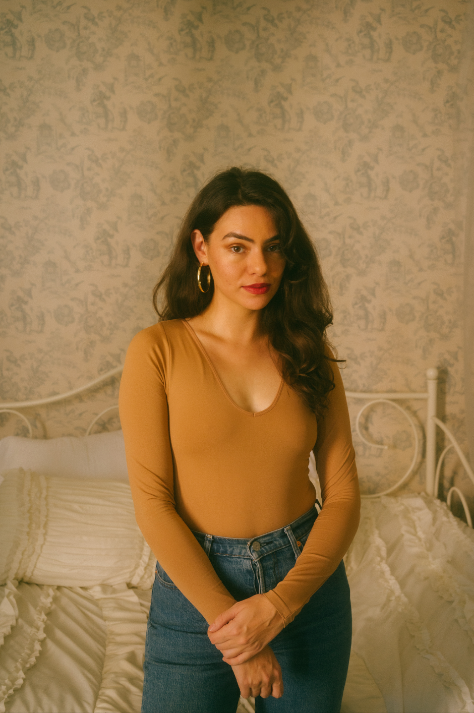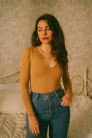A wardrobe staple, the Percy Bodysuit comes in a solid light brown hue with a romantic scoop neckline and long sleeves. In a super soft sweet material, this piece has a feminine built in bra on the inside making it an extremely versatile and easy to wear piece. Style with a high waisted midi skirt, jeans or just about anything, this piece is the perfect timeless beauty that you'll find yourself gravitating towards season after season.