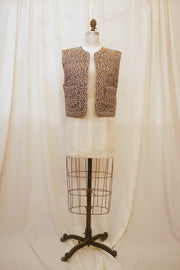 The Pergrin Vest is a perfectly structured take on the quilted vests of the 1960s and 1970s. This open-front vest comes in a rich brown quilted fabric speckled with delicate purple, blue, and golden ditsy floral print. Two generous front pockets are perfect for stashing snacks for later. Each hem is perfectly finished with a crisp exposed French seam. The medium-light weight of the fabric makes the Pergrin the perfect summer layering piece.
