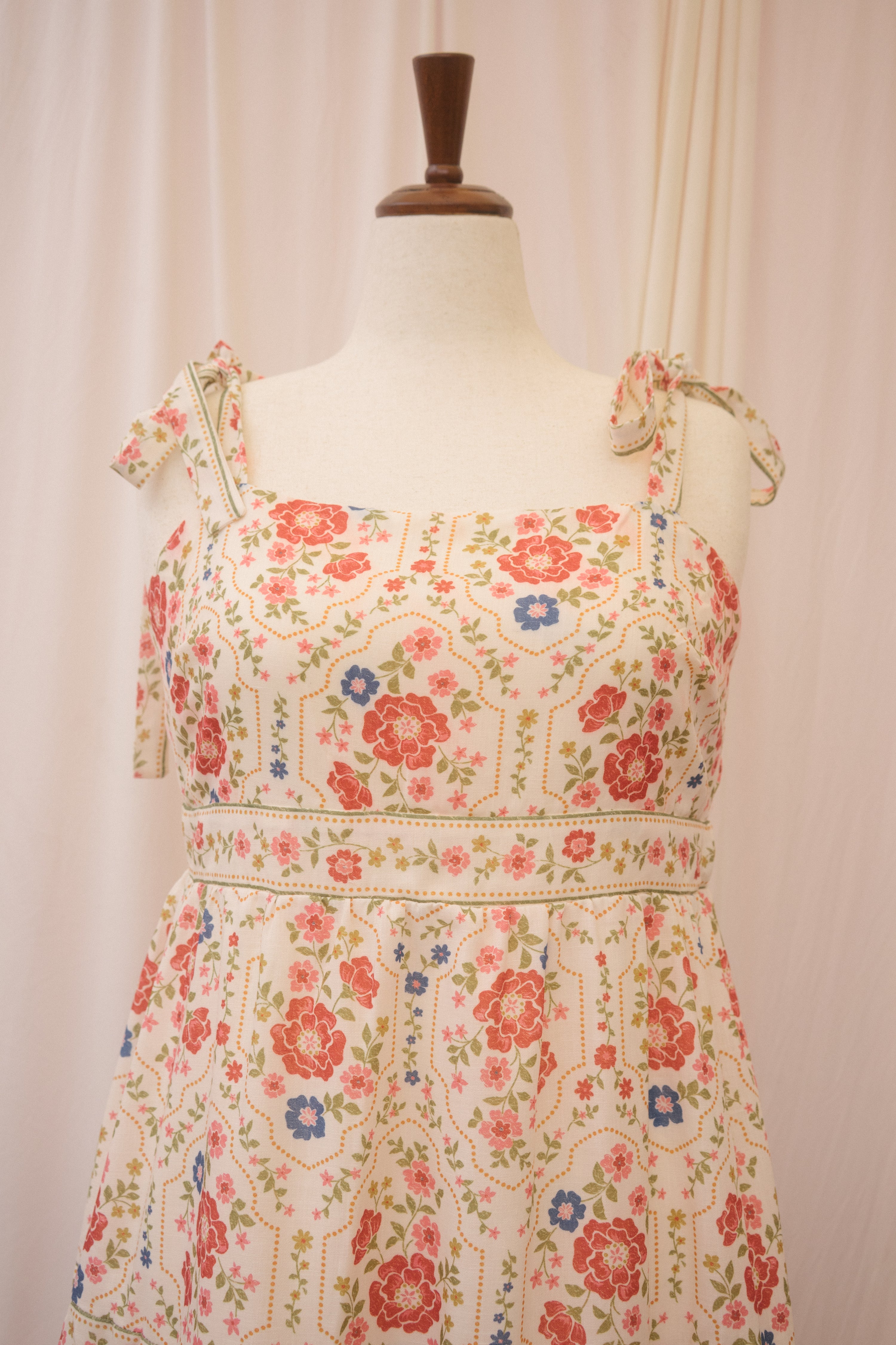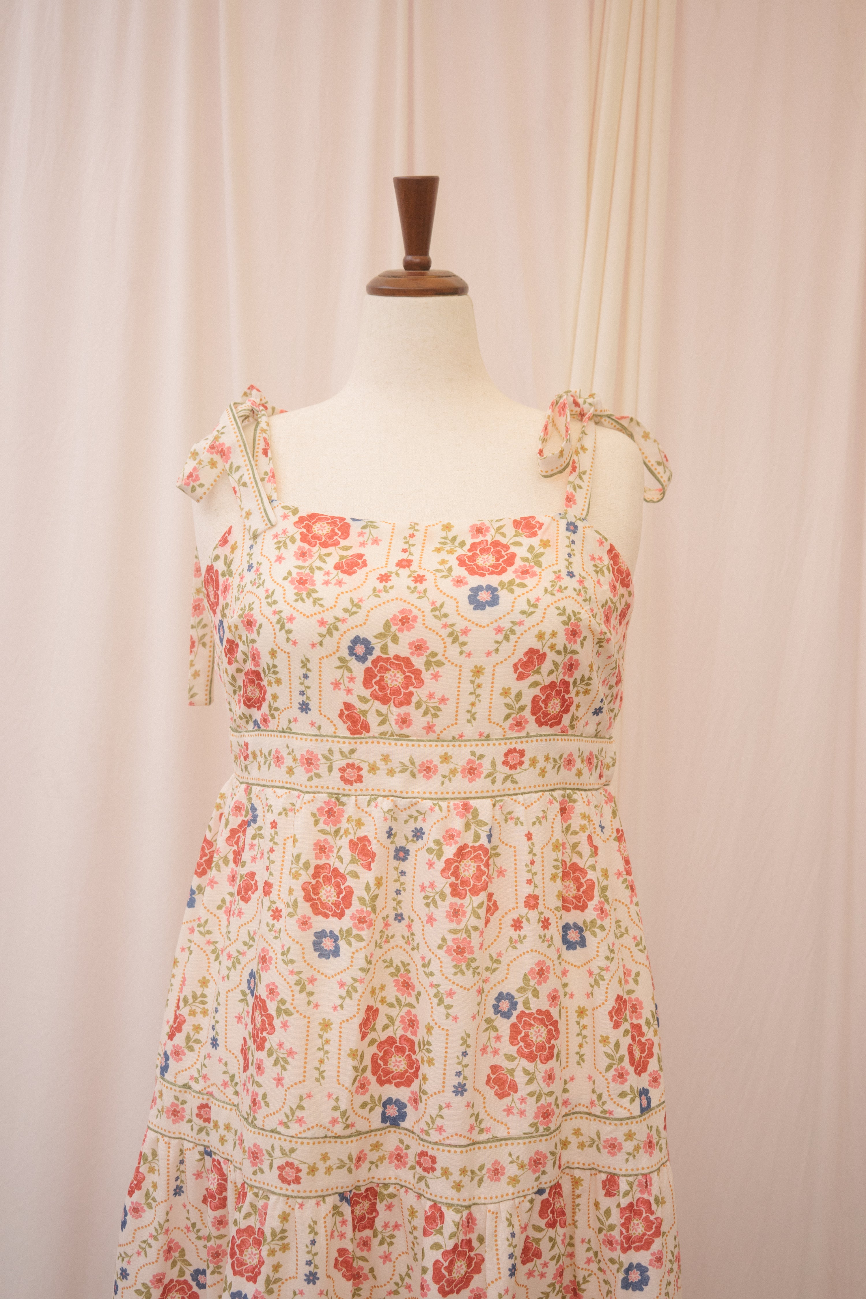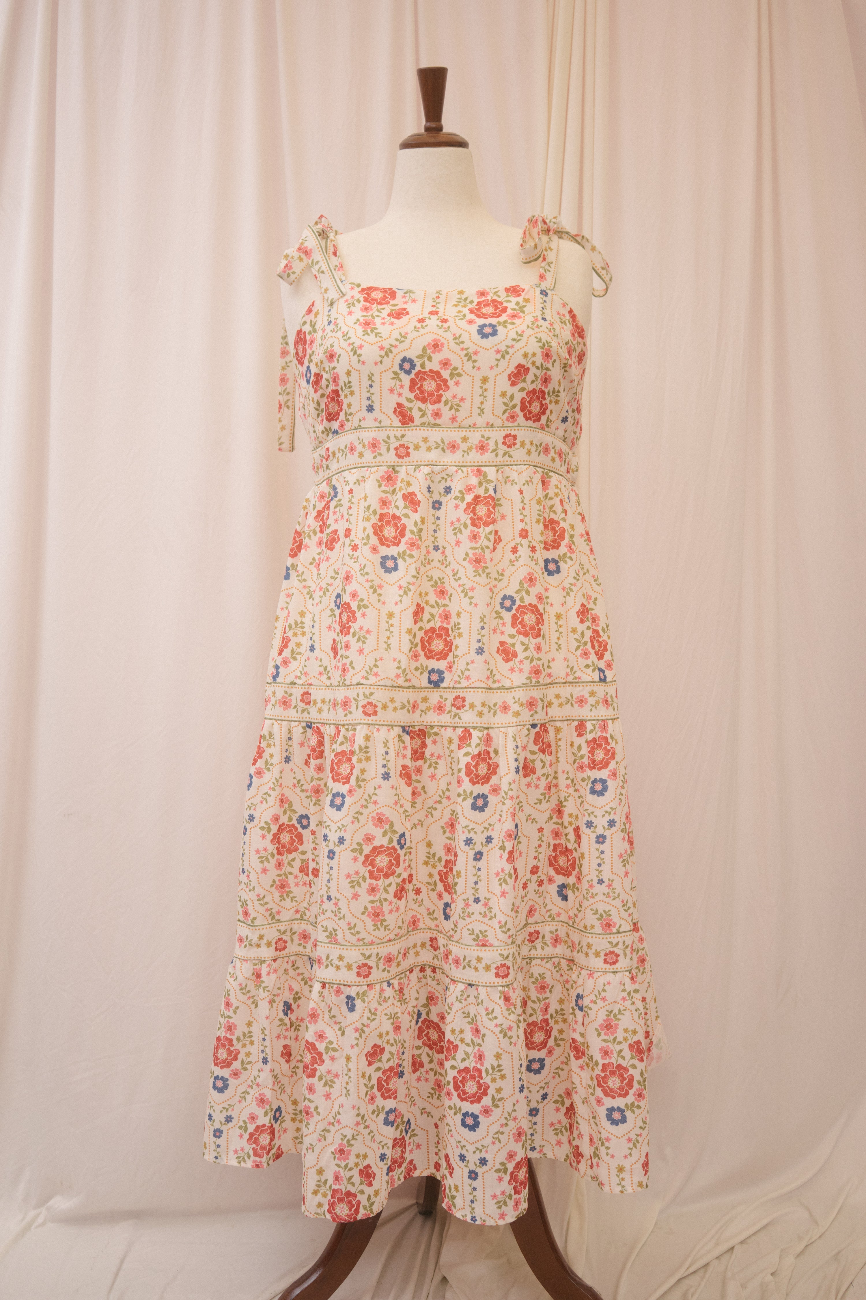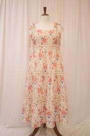 Catch their eye in the Positano dress. This midi length sundress features a red, blue, green, and umber floral pattern that recalls glossy 70s ceramics. It has a square neckline and thicker straps that tie at the shoulder in a big, flouncy bow. Elastic on the back of the bodice and under the bust moves with you for a cute, custom fit, while the tiered skirt keeps you breezy and cool. Slick your hair into a bun, tie with a red bow, and finish with a red lip for the full effect.