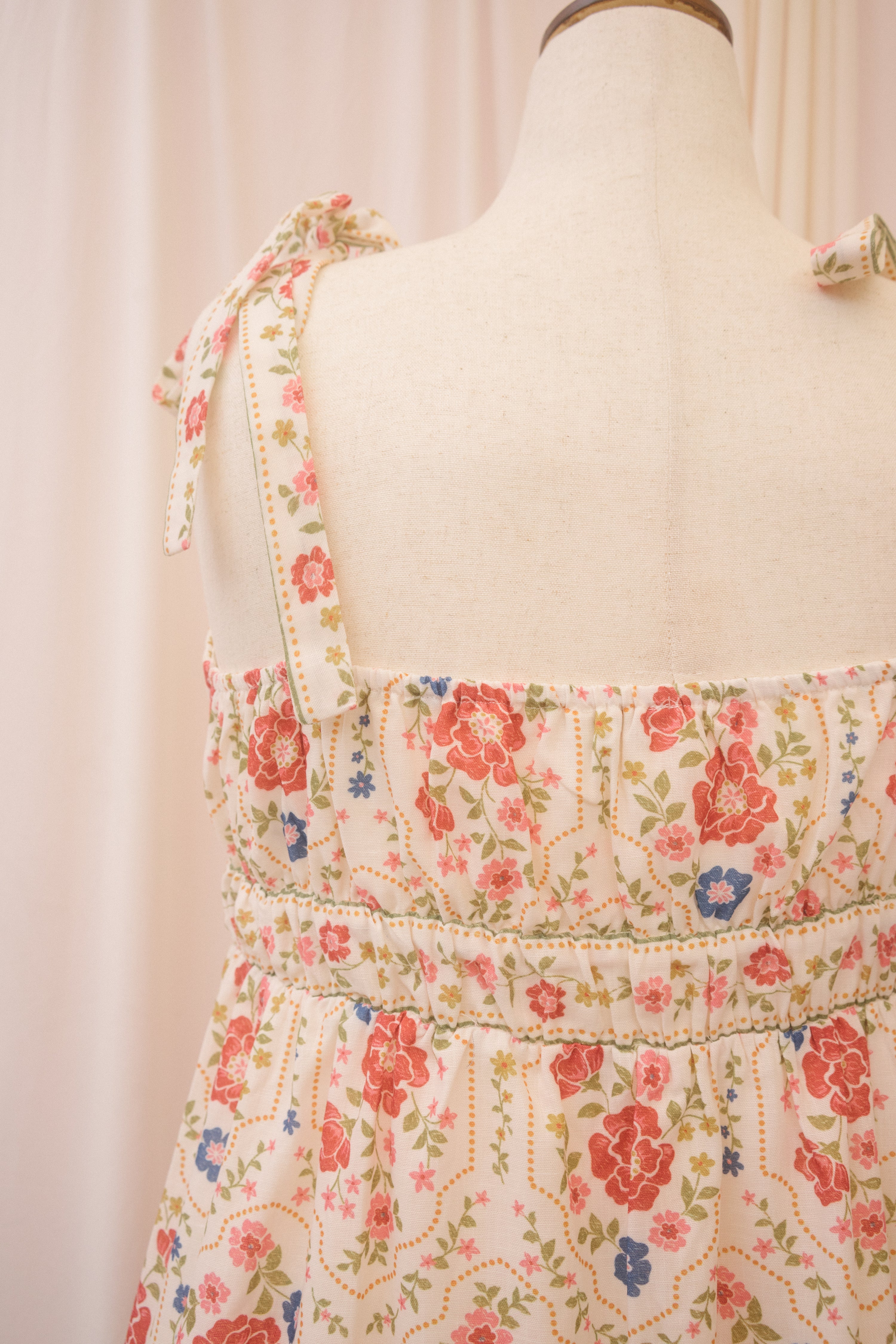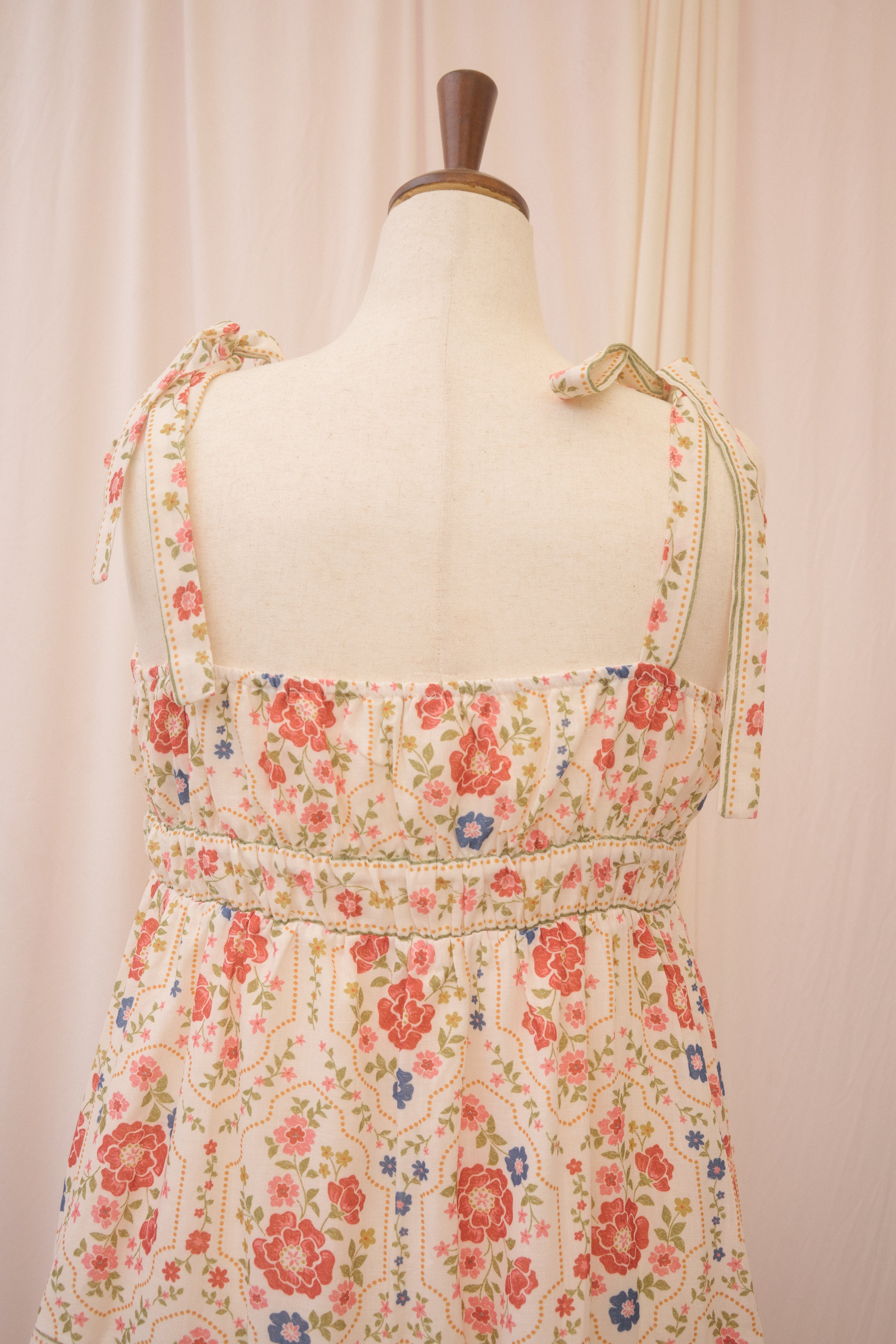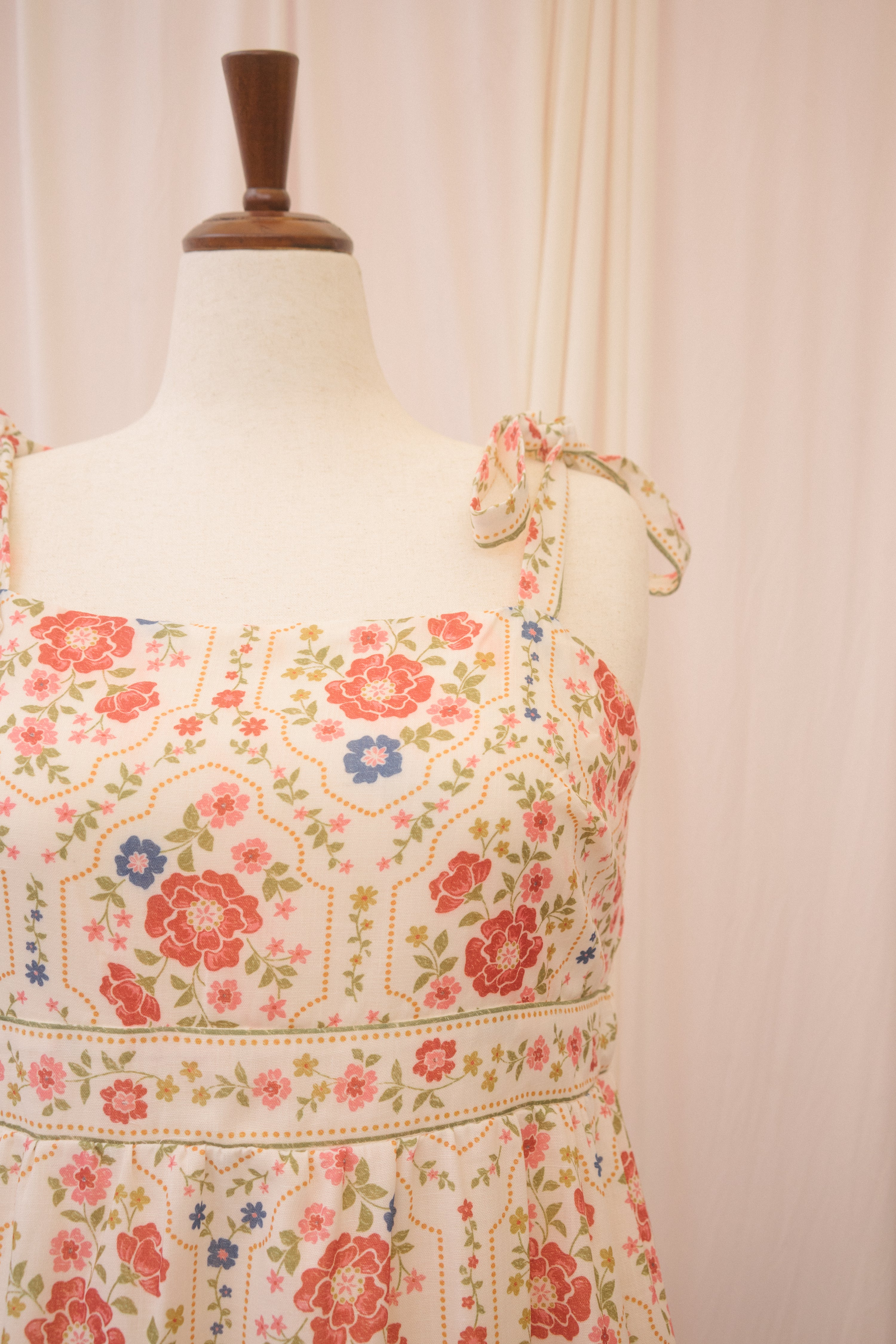 Catch their eye in the Positano dress. This midi length sundress features a red, blue, green, and umber floral pattern that recalls glossy 70s ceramics. It has a square neckline and thicker straps that tie at the shoulder in a big, flouncy bow. Elastic on the back of the bodice and under the bust moves with you for a cute, custom fit, while the tiered skirt keeps you breezy and cool. Slick your hair into a bun, tie with a red bow, and finish with a red lip for the full effect.