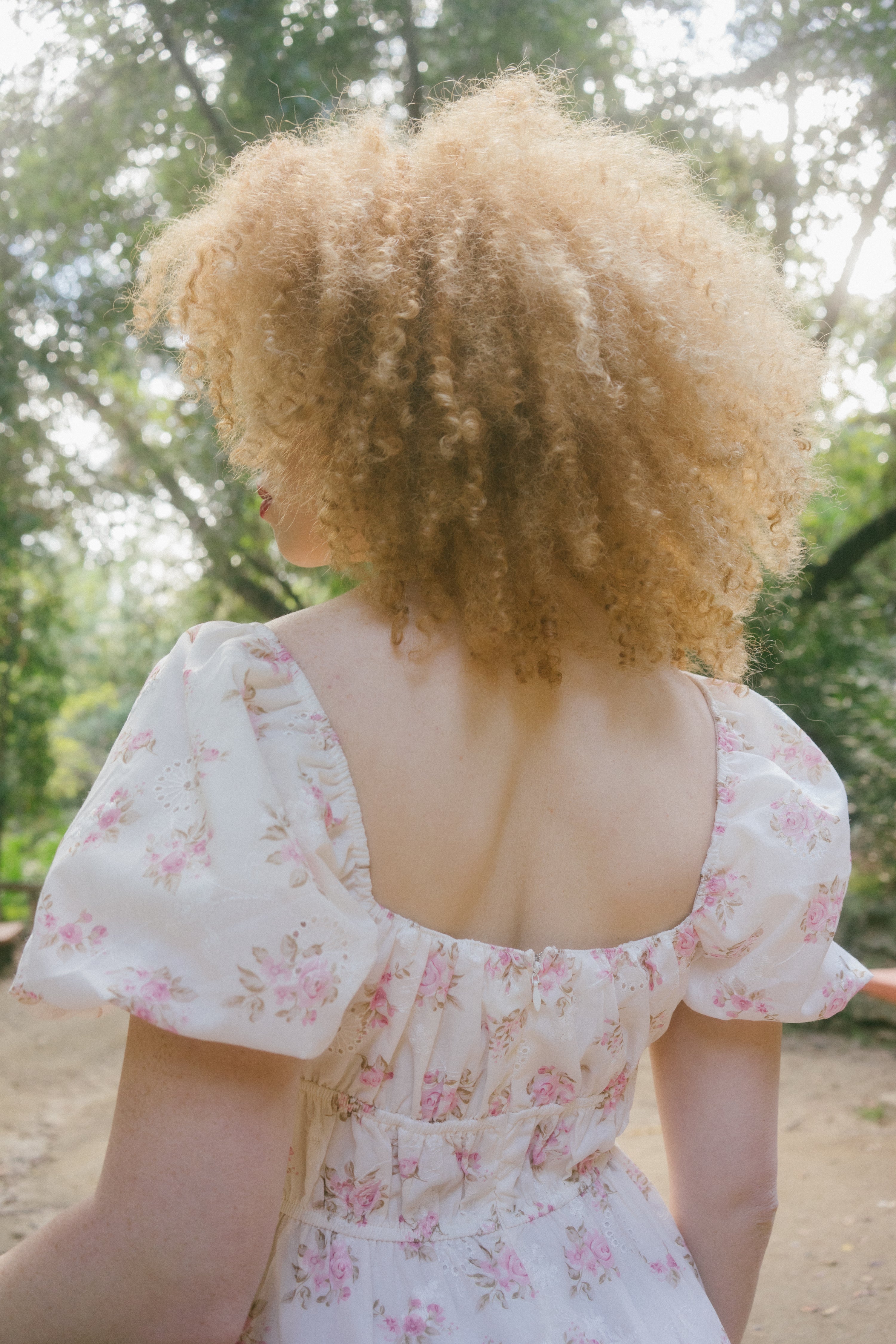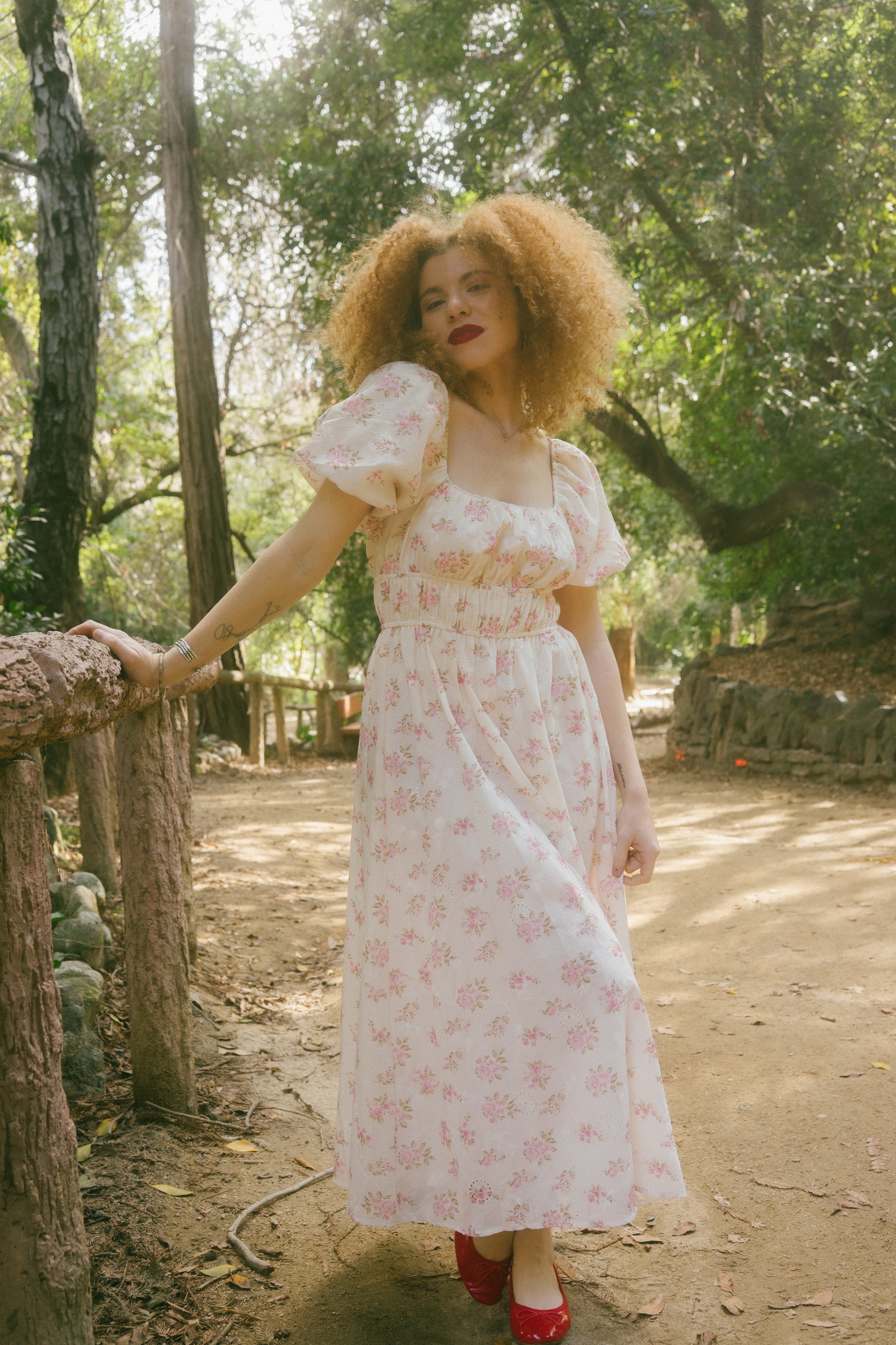 A sweet dreamy spring piece, the Primrose Dress comes in a romantic off-white / cream hue and is scattered in the daintiest baby pink and soft green ditsy floral print. This midi dress has short exaggerated puff sleeves, a square neckline and a raised waistline with a fully smocked center. The piece is decorated in a subtle cream eyelet print, with fabric gathering along the waist that flows out into a romantic fully lined midi length skirt. Finished off with pretty scalloped detailing along the neckline, style with a dash of blush, an oversized basket bag and vintage slides.