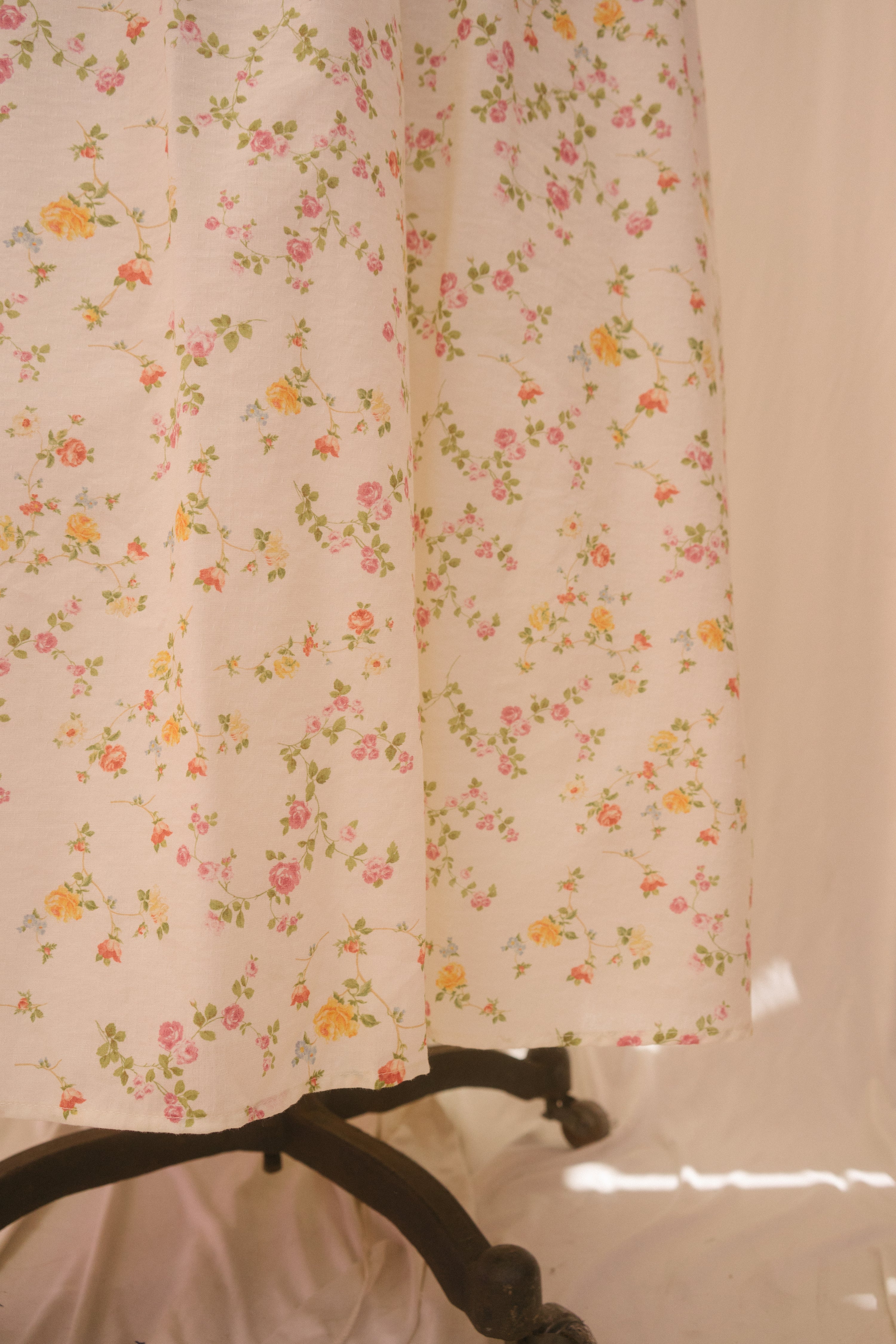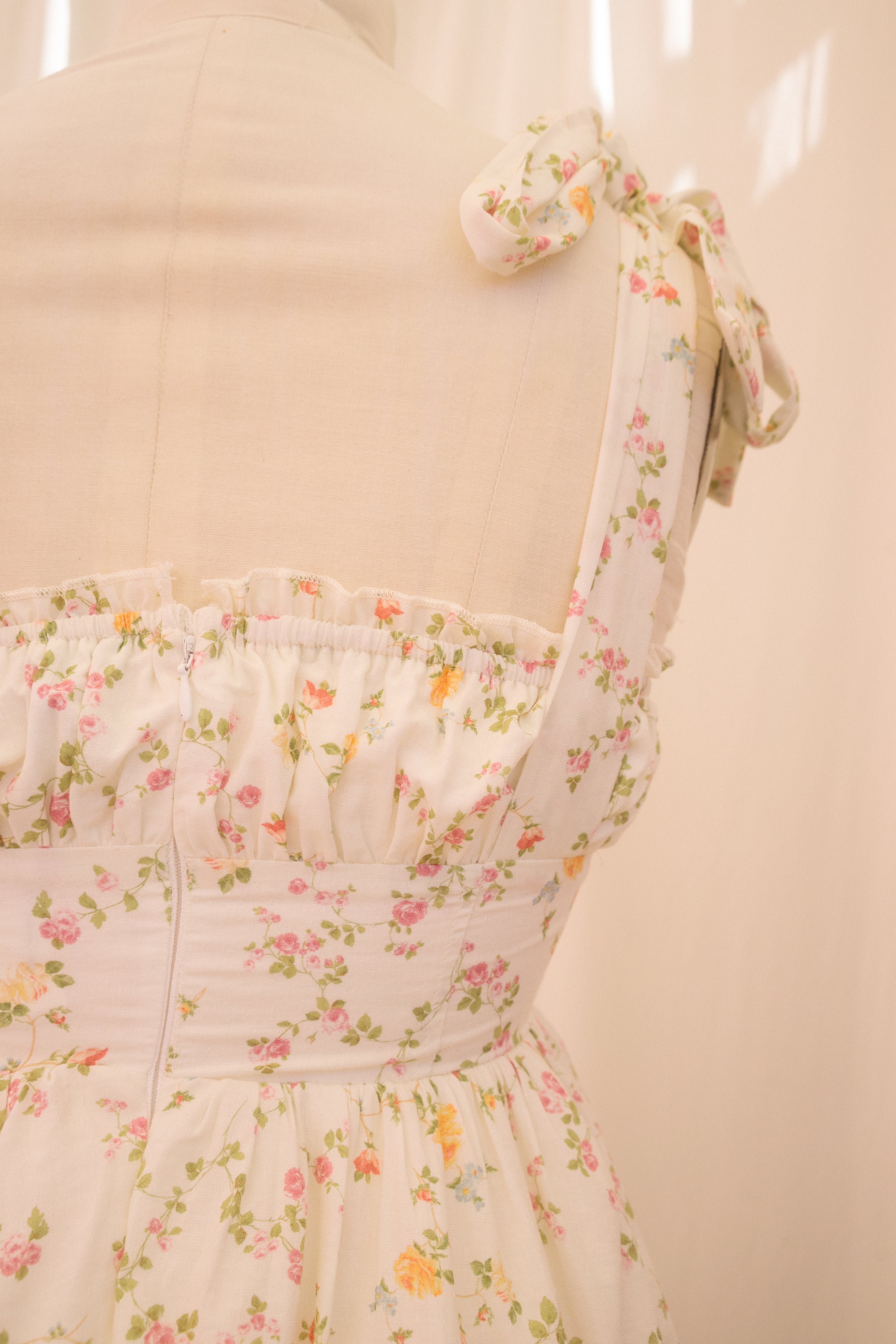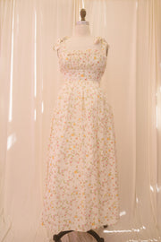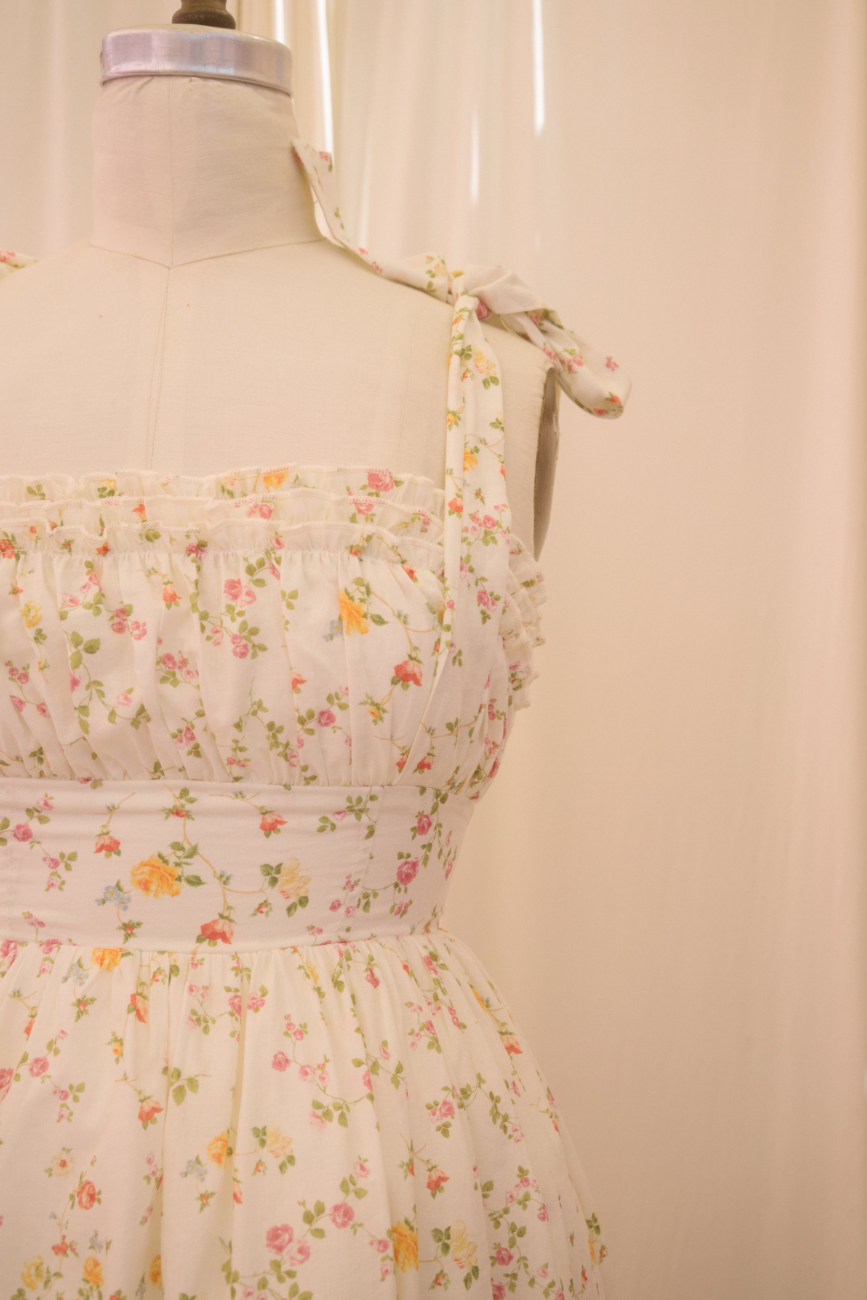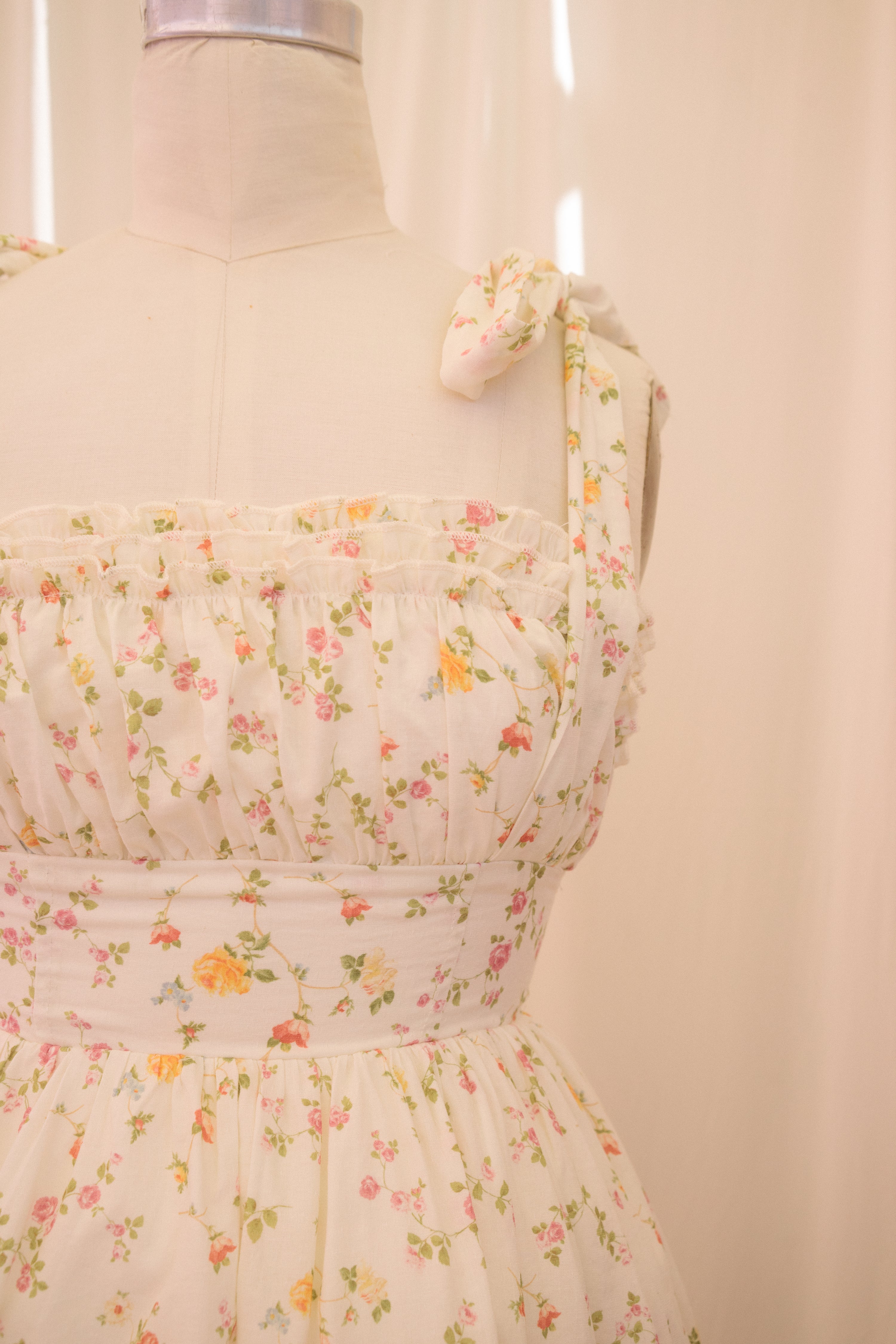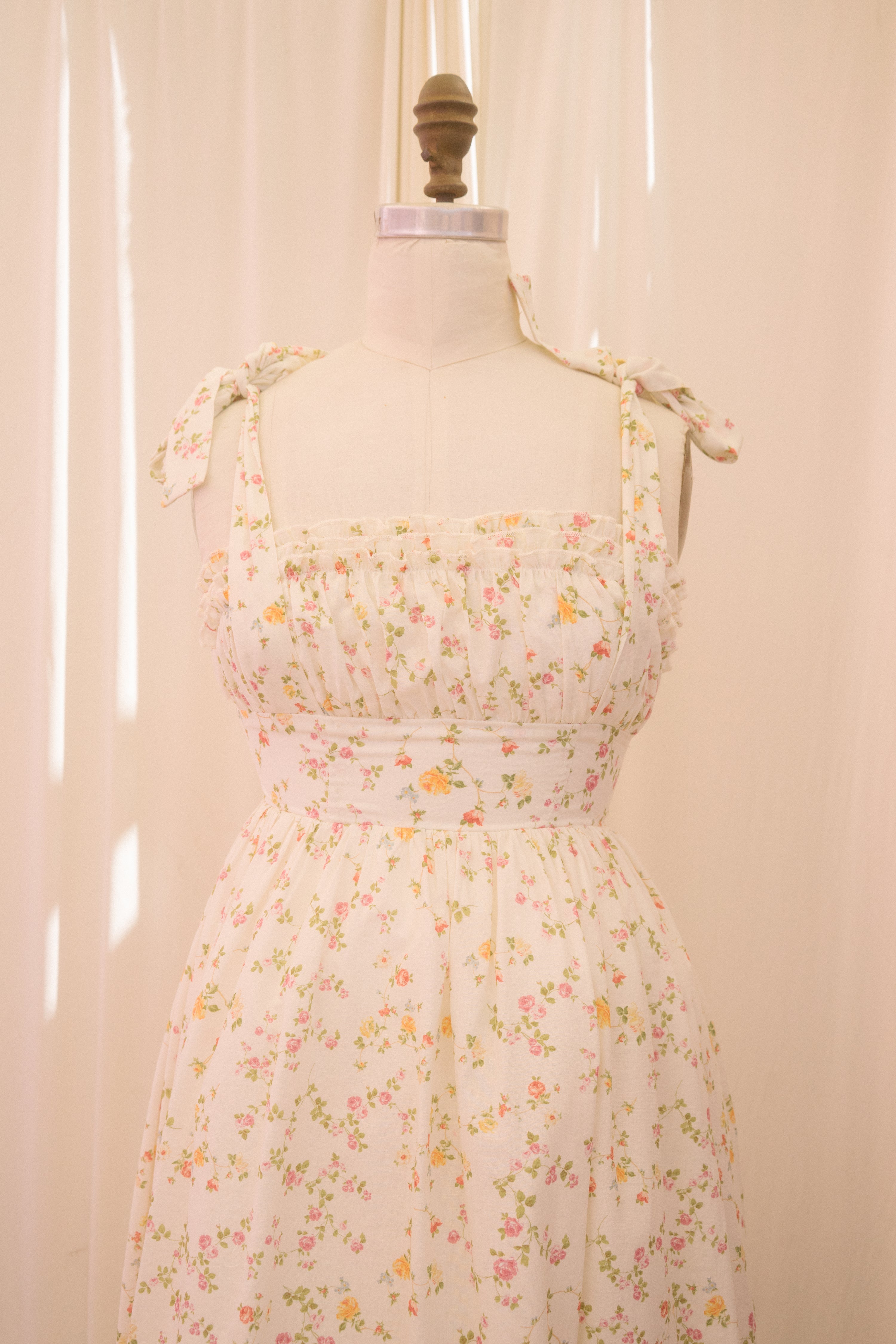 The garden party dress of your dreams, the Primrose Dress comes in a darling muted cream hue and is covered in the most beautiful blue, green, pink, and yellow disty floral print. This apron style maxi sundress has an empire waistline, square necklien with exaggerated ruffle details along the top. It has a fitted waist with an oversized midi length skirt that is fully lined with a tulle accent underneath, giving you that extra romantic, edwardian inspired silhouette. Style with a dash of lipstick, summer slides and an oversized sunhat.