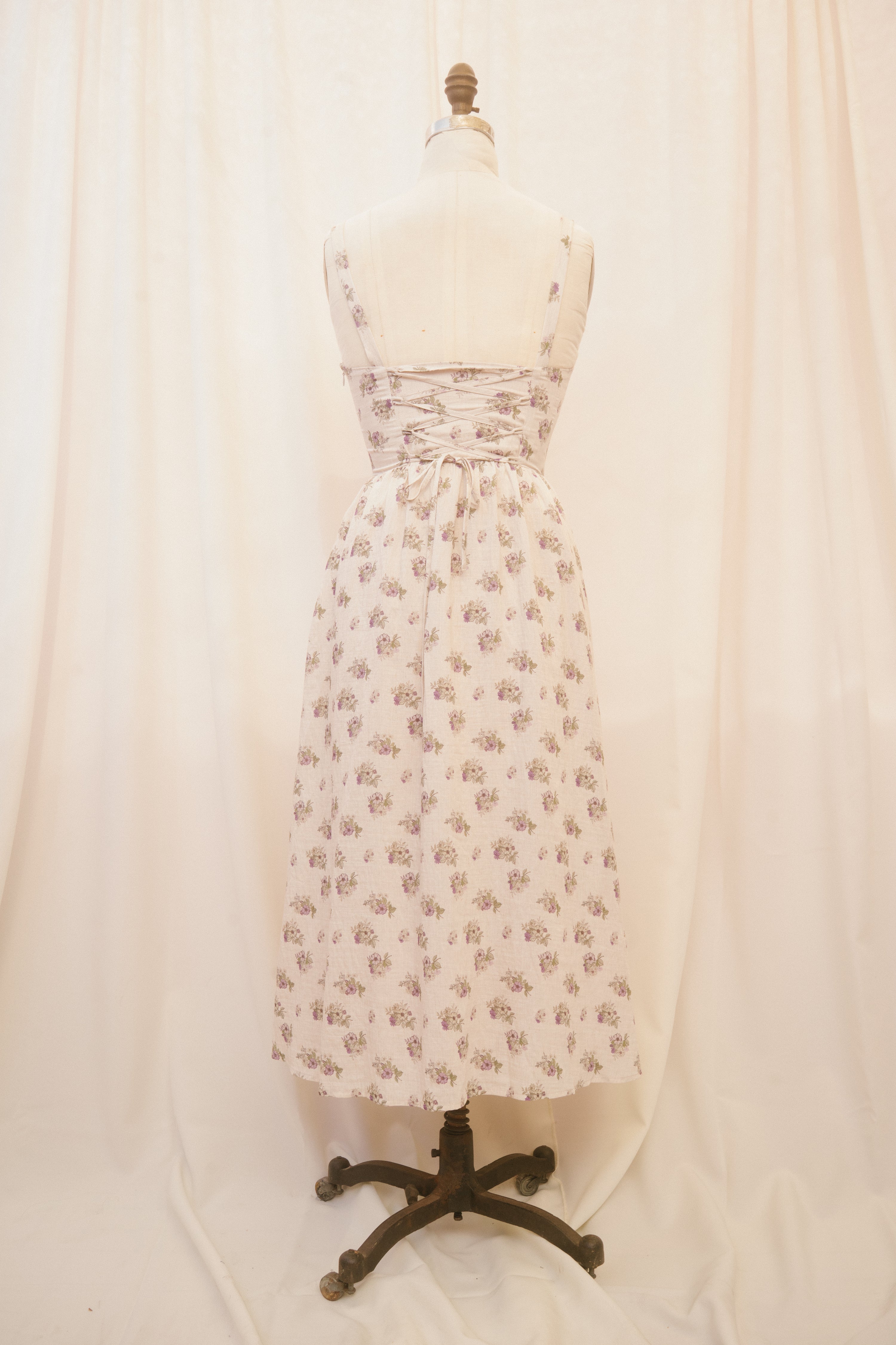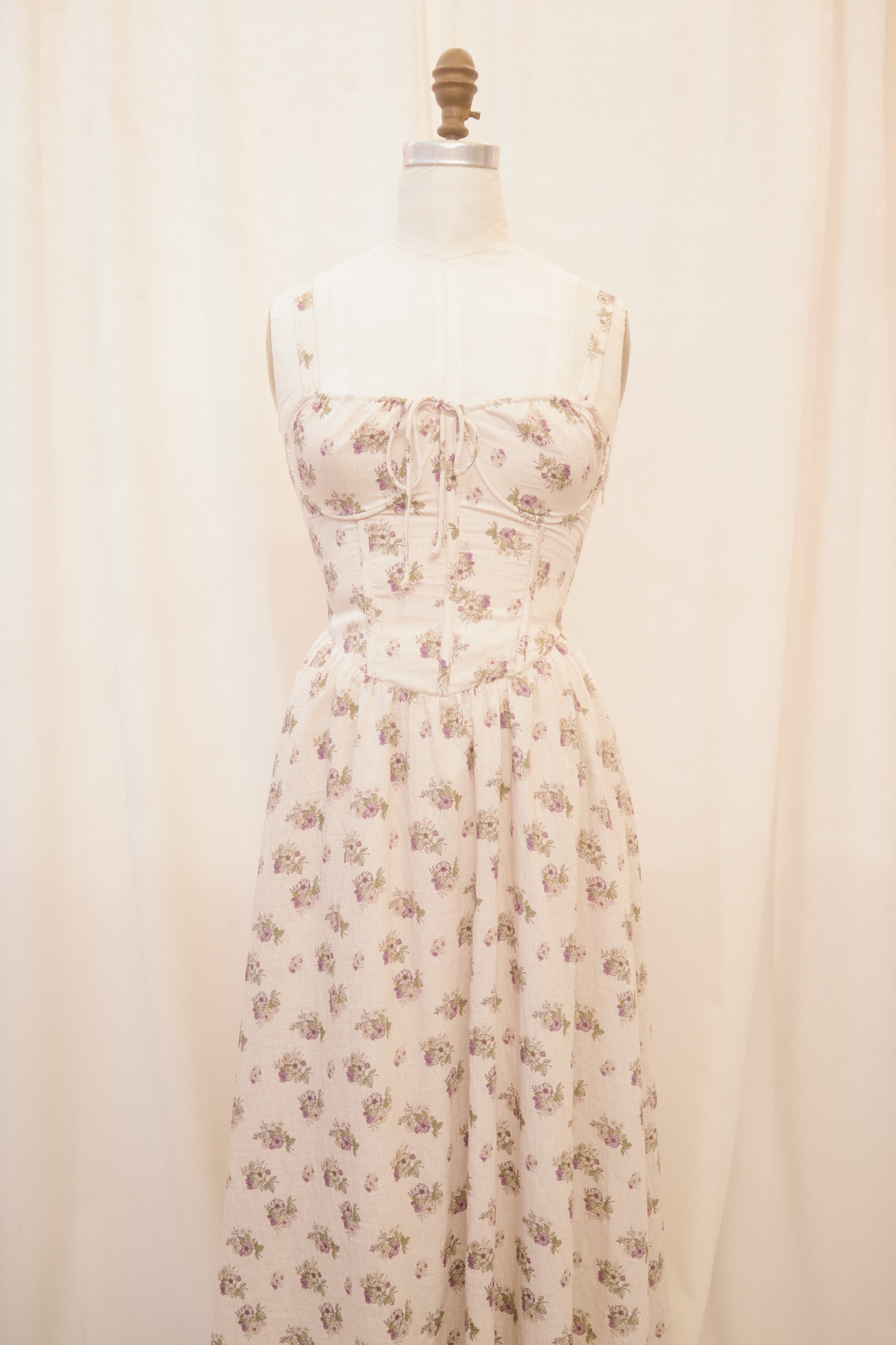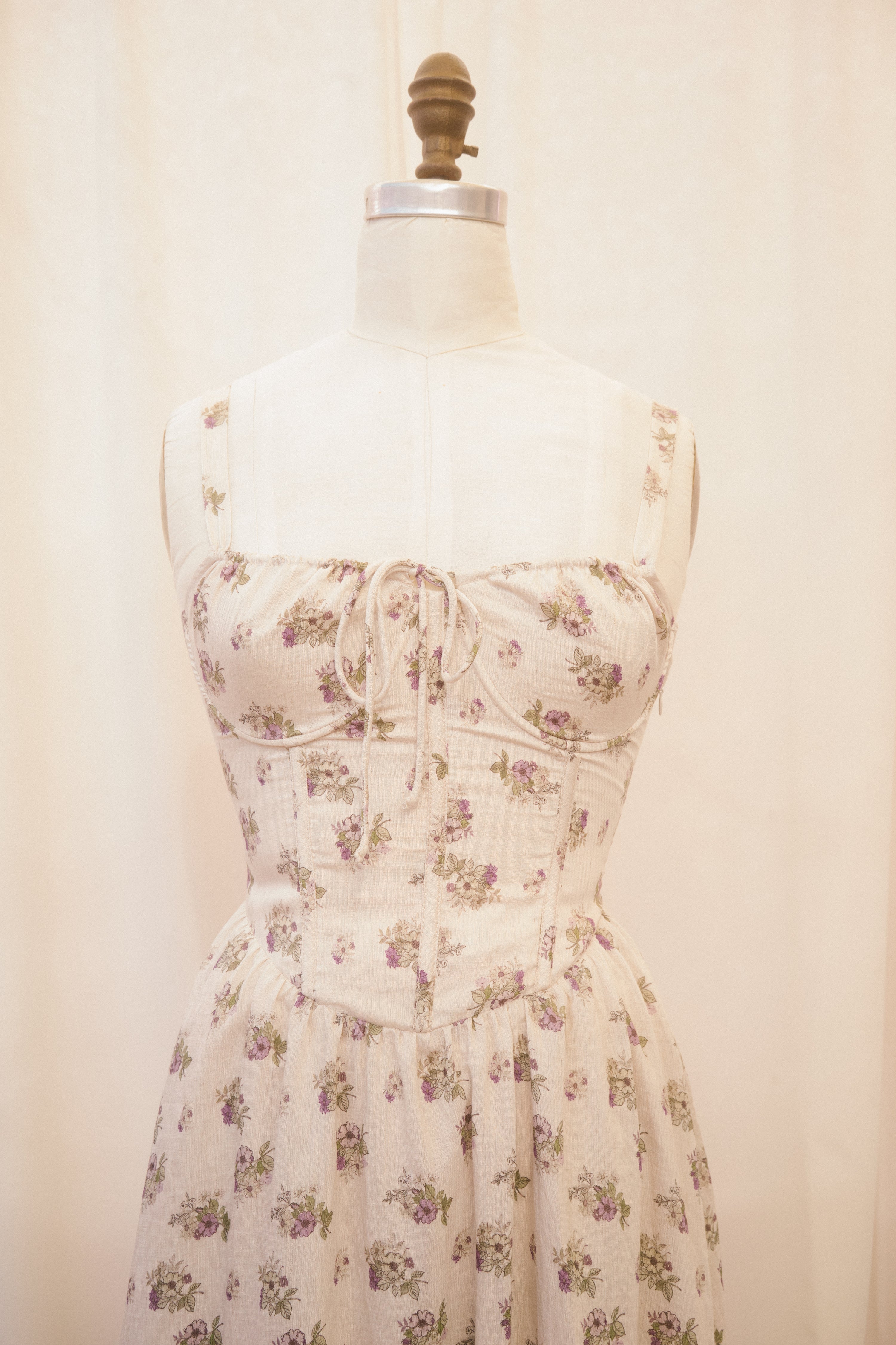 Slip into the Reggie dress when you're ready to make an impression. This spaghetti strap midi sundress comes in a heather grey fabric, speckled with delicate green and violet bouquets. The vintage inspired basque waistline with vertical corset-boning along the front bodice and functional corset-lacing on the back bodice ensures a snatched fit, while the hidden side-zipper makes for easy dressing. The undewire cups feature a functional drawstring bustline which ties in a bow at the center of the bust. Style with just about anything, because the fit of this dress is impeccable!
