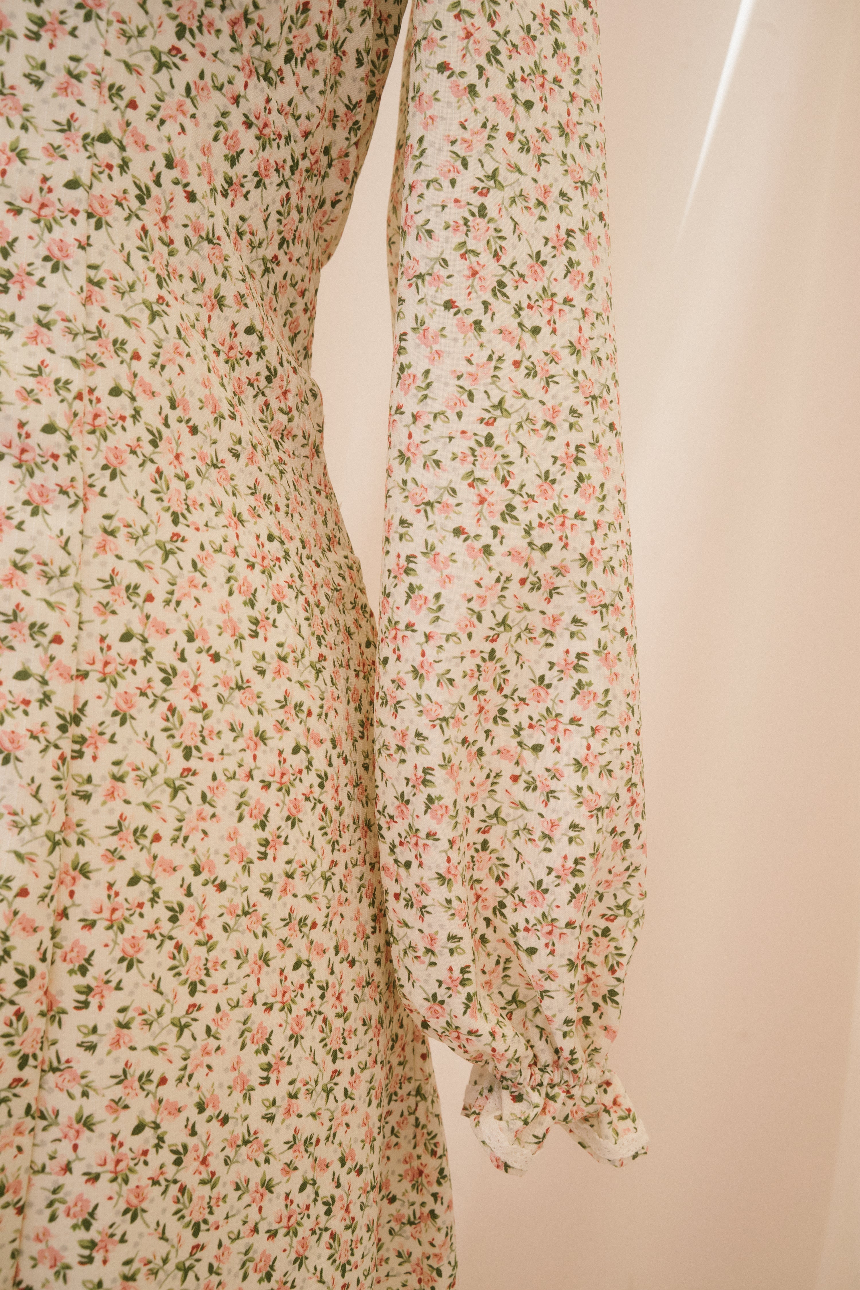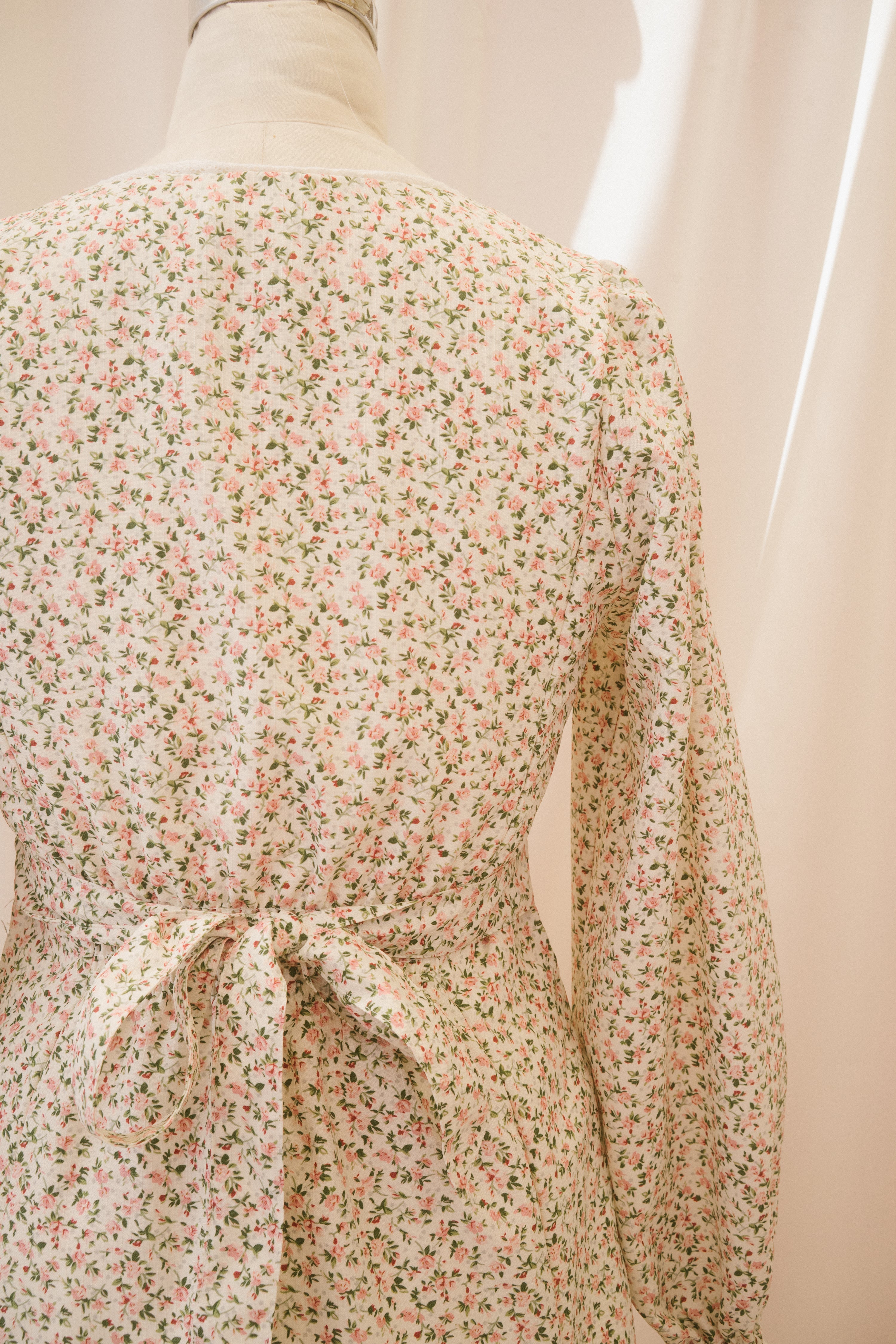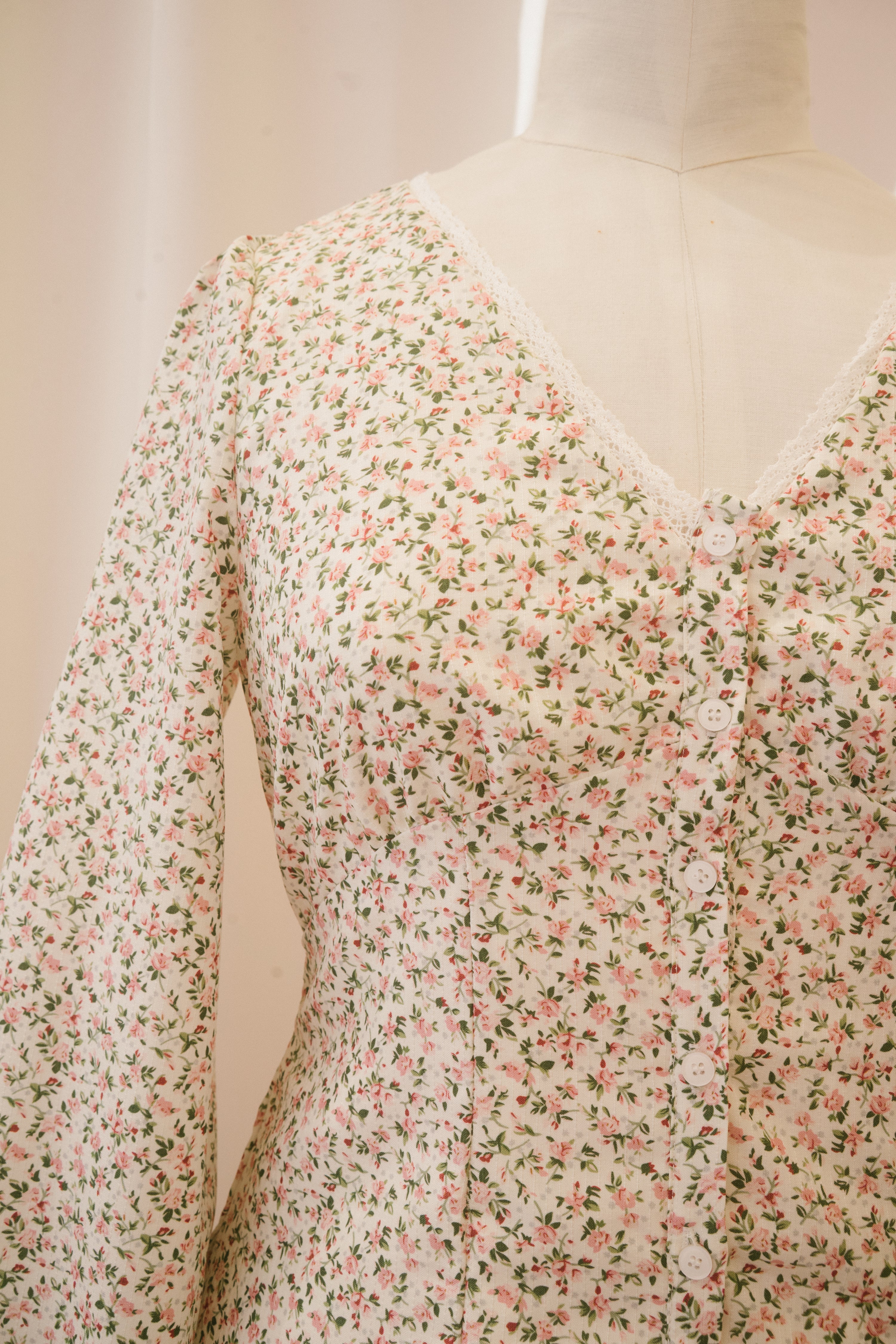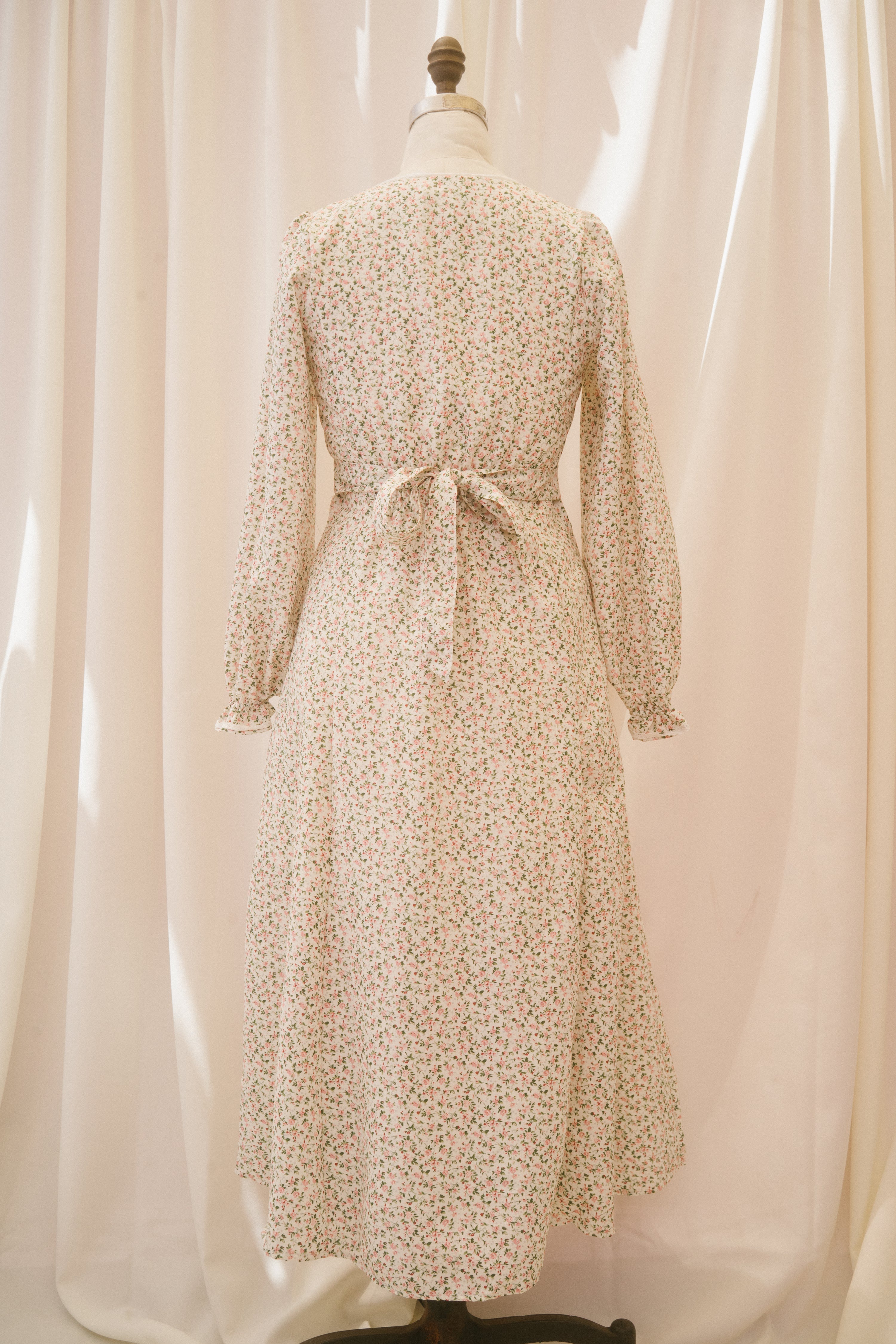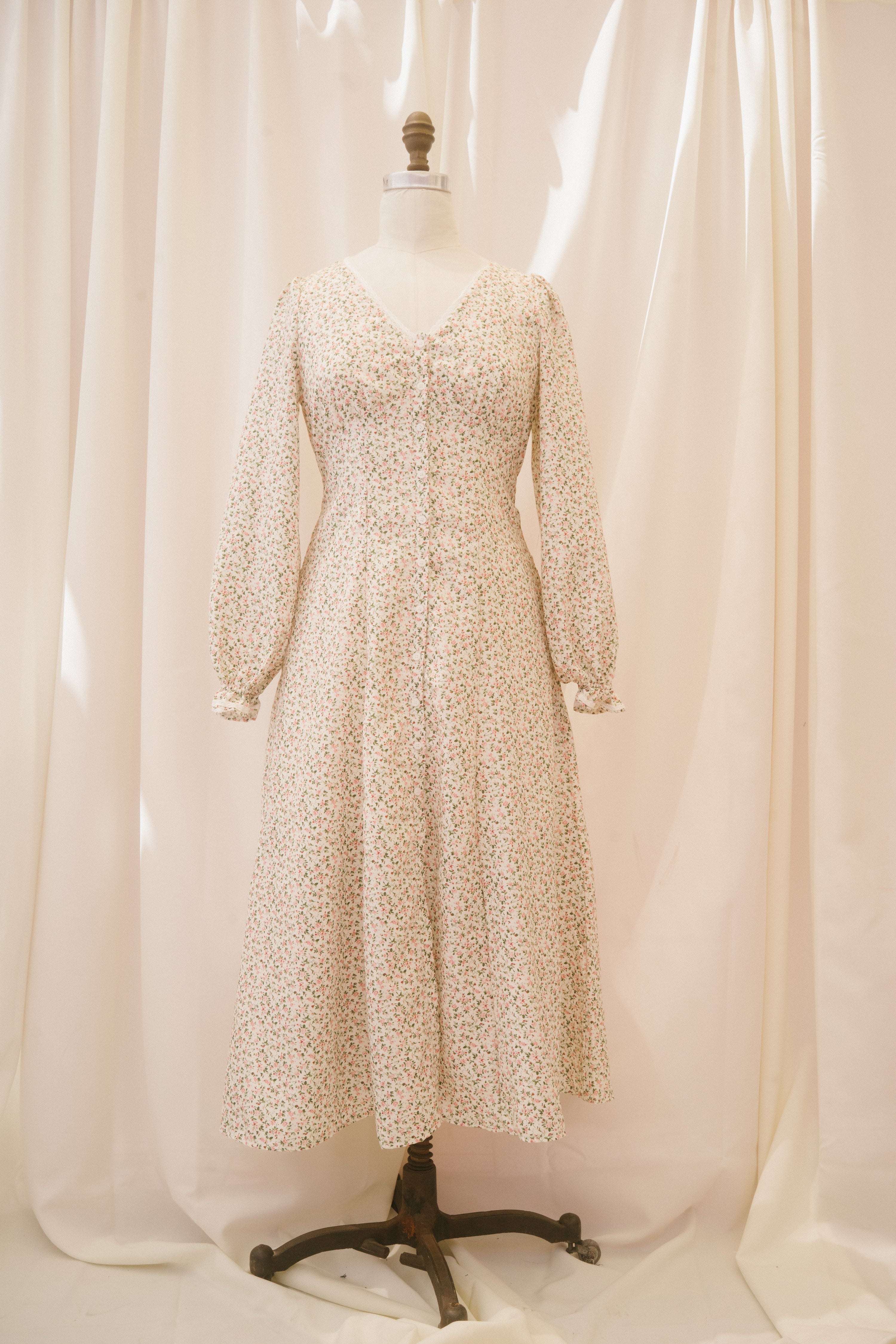 The girl in the Savannah Dress knows that fall is just around the corner, and she can't wait! This long sleeve midi dress comes in a delicately embroidered cream fabric speckled with a green and pink ditsy rose floral print. The v-neck is embellished with a petite white lace border; a detail echoed on the ruffles at the wrist. The empire waist is structured in the front, but the back panel of the waist is smocked for a comfortable, close fit. Long sashes at the side waist can be tied in a bow the front or back, according to your preference. The central row of functional buttons mean the Savannah can even be worn fully open as a shrug. Ample hidden pockets in the skirt are the icing on the cake!