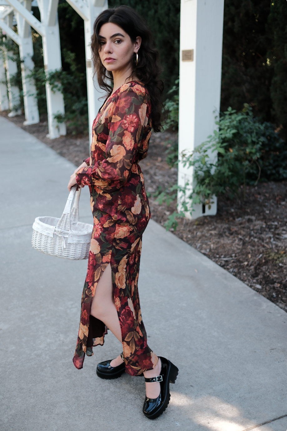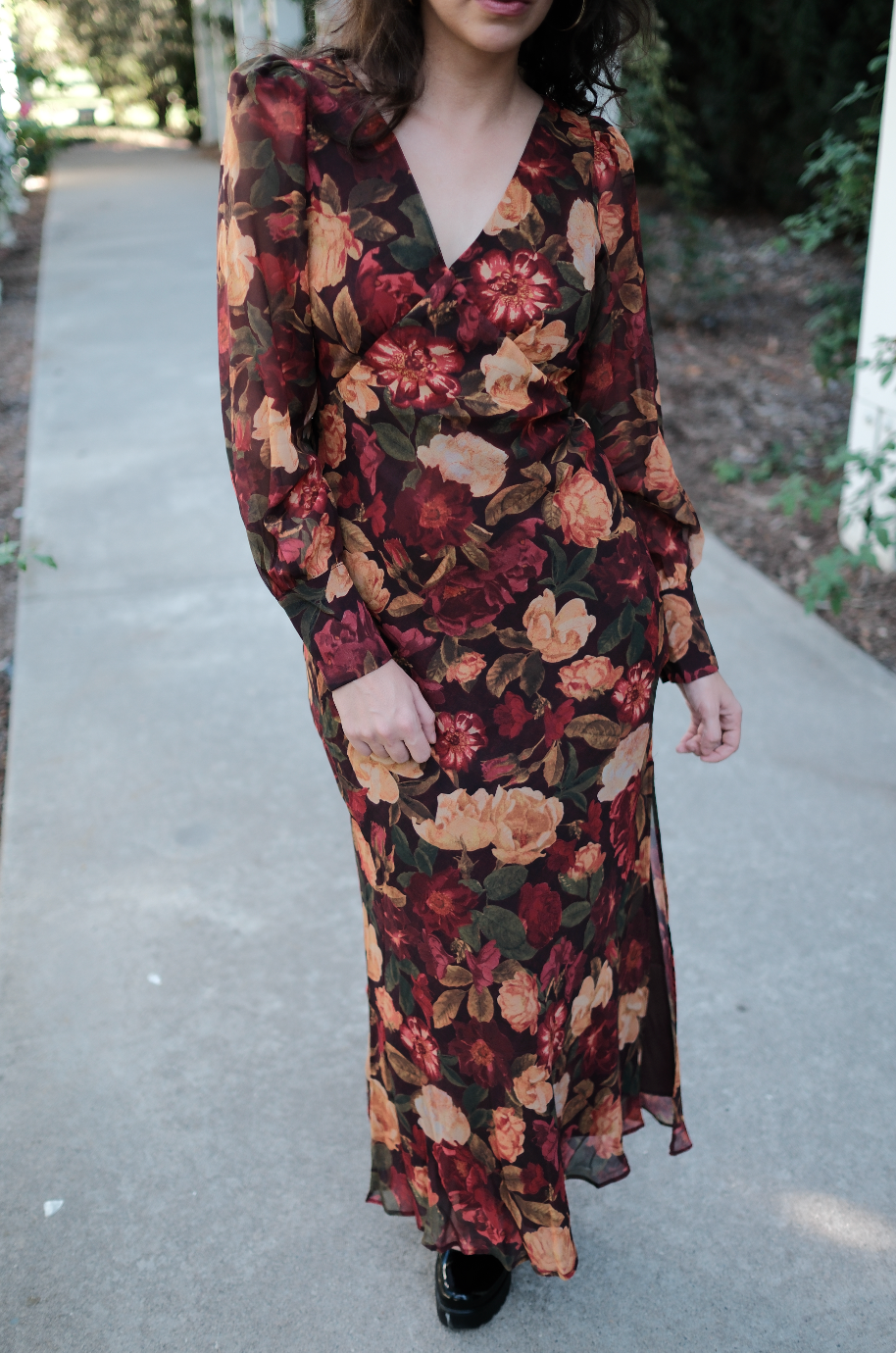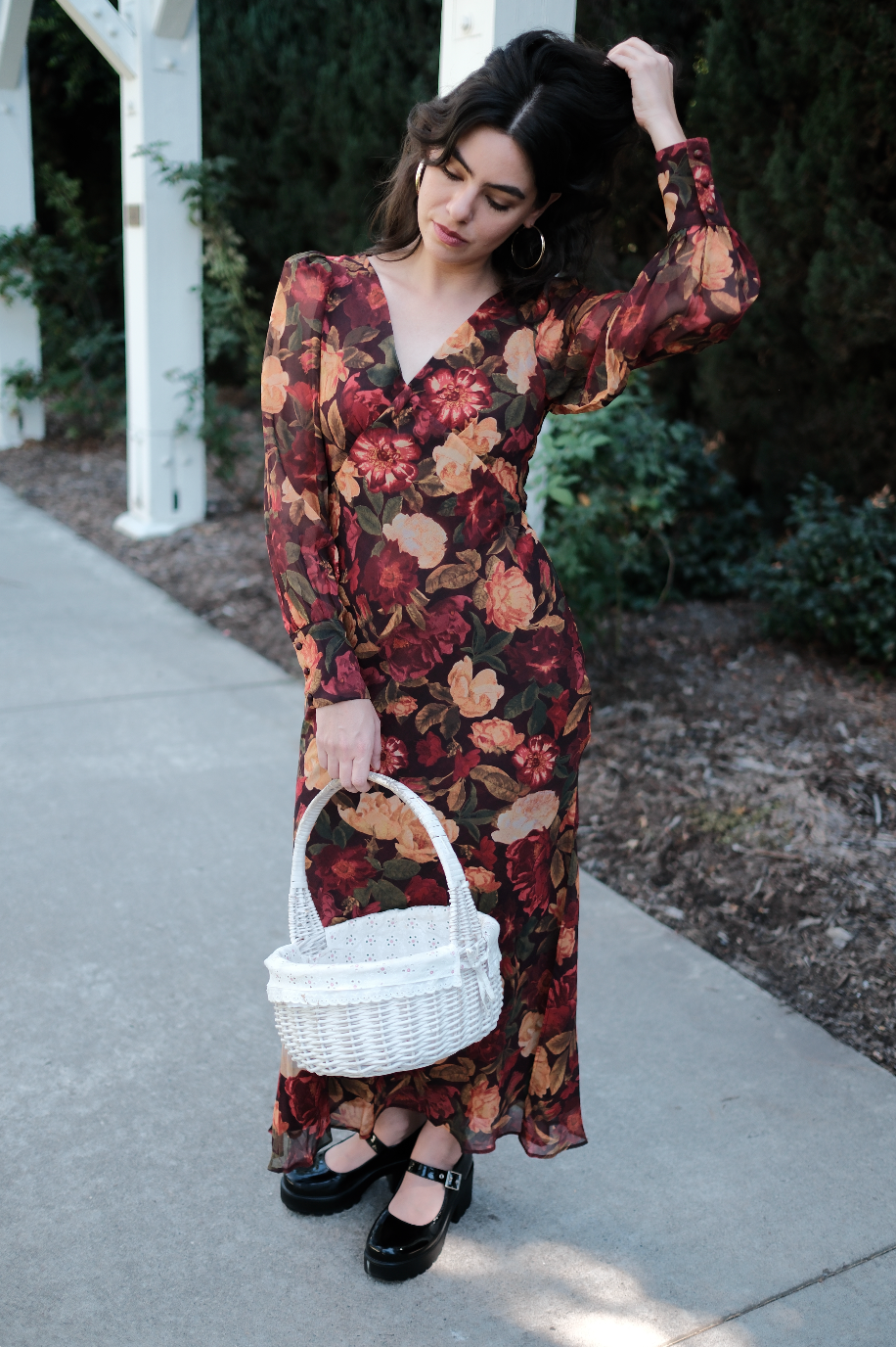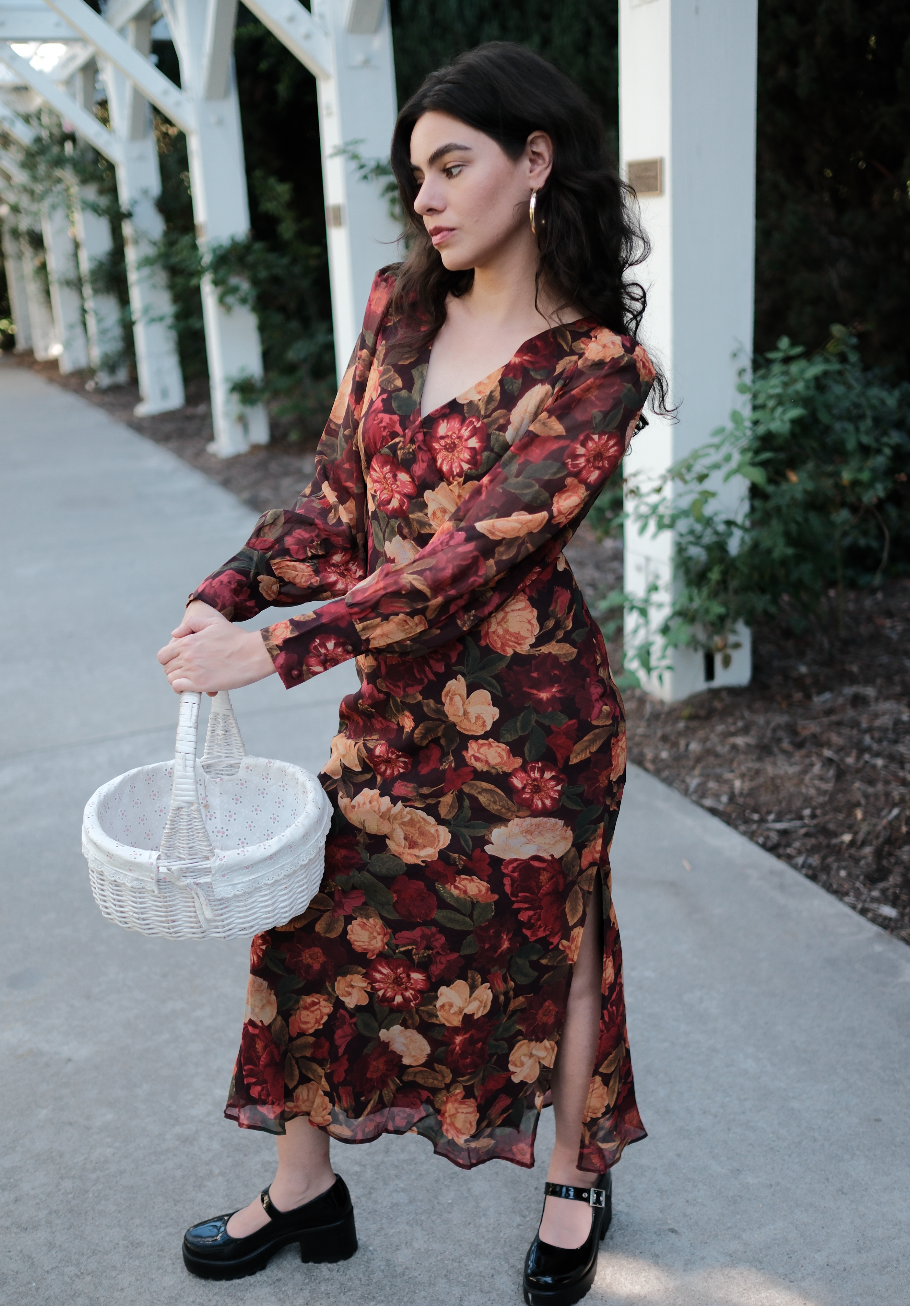 An autumnal beauty, the Siobhan Dress comes in the most romantic burgendy rust red and is covered in an oversized cream, light green, red and brown rosey print. This maxi dress as long sleeves that cuff at the wrists, with a raised waistline and a romantic deep v-neckline. The dress has a slit on the bottom left side of the dress with a fully lined, fitted and flowly maxi length skirt. Perfect for all of those autumn and holiday parties, style this dress with Mary Janes, a dash of lipstick and a lightweight bag.