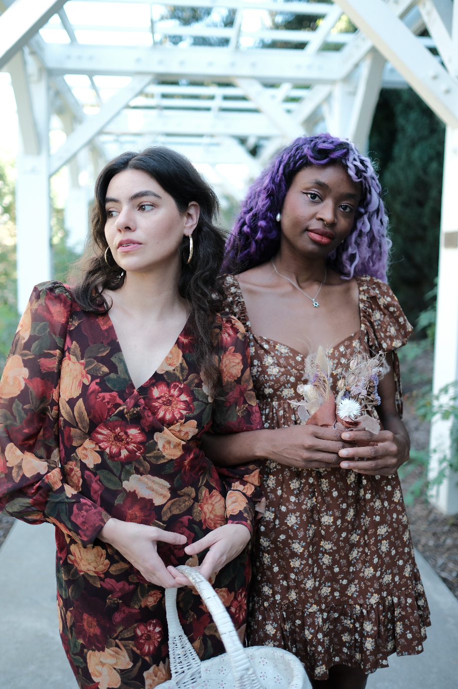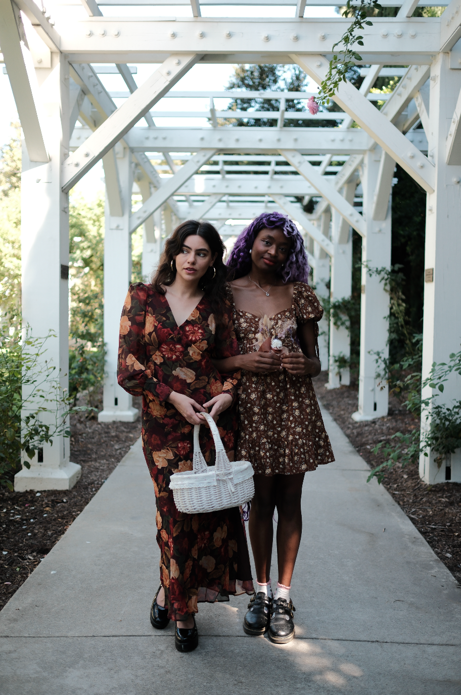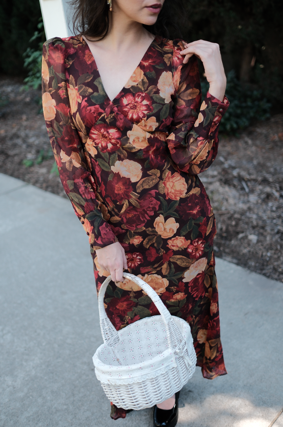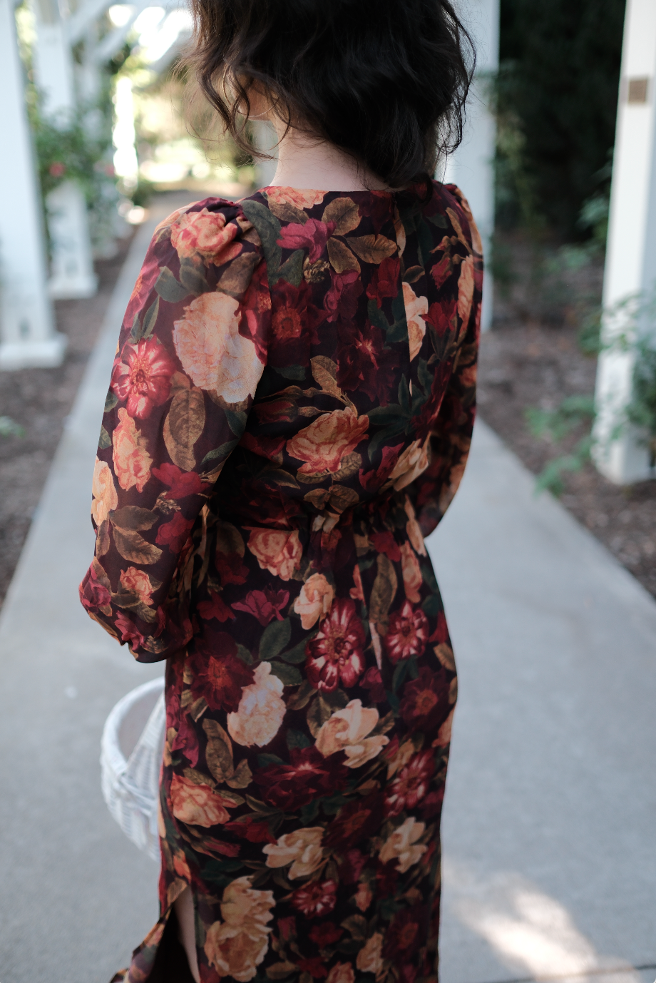 An autumnal beauty, the Siobhan Dress comes in the most romantic burgendy rust red and is covered in an oversized cream, light green, red and brown rosey print. This maxi dress as long sleeves that cuff at the wrists, with a raised waistline and a romantic deep v-neckline. The dress has a slit on the bottom left side of the dress with a fully lined, fitted and flowly maxi length skirt. Perfect for all of those autumn and holiday parties, style this dress with Mary Janes, a dash of lipstick and a lightweight bag.