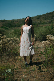 A delicate dance for summer, the Sofi Dress comes in a pretty cream hue and is scattered in a romantic red, green, blue and yellow ditsy floral print. This midi sundress has a raised waistline, thick straps with exaggerated ruffle detailing and decorative buttons along the front of the bodice. The piece is lined with a square neckline, smocking detail along the back and a straight fitting pretty midi length skirt. Style this vintage inspired beauty with an oversized sunhat, a dash of lipstick and summer sandals.