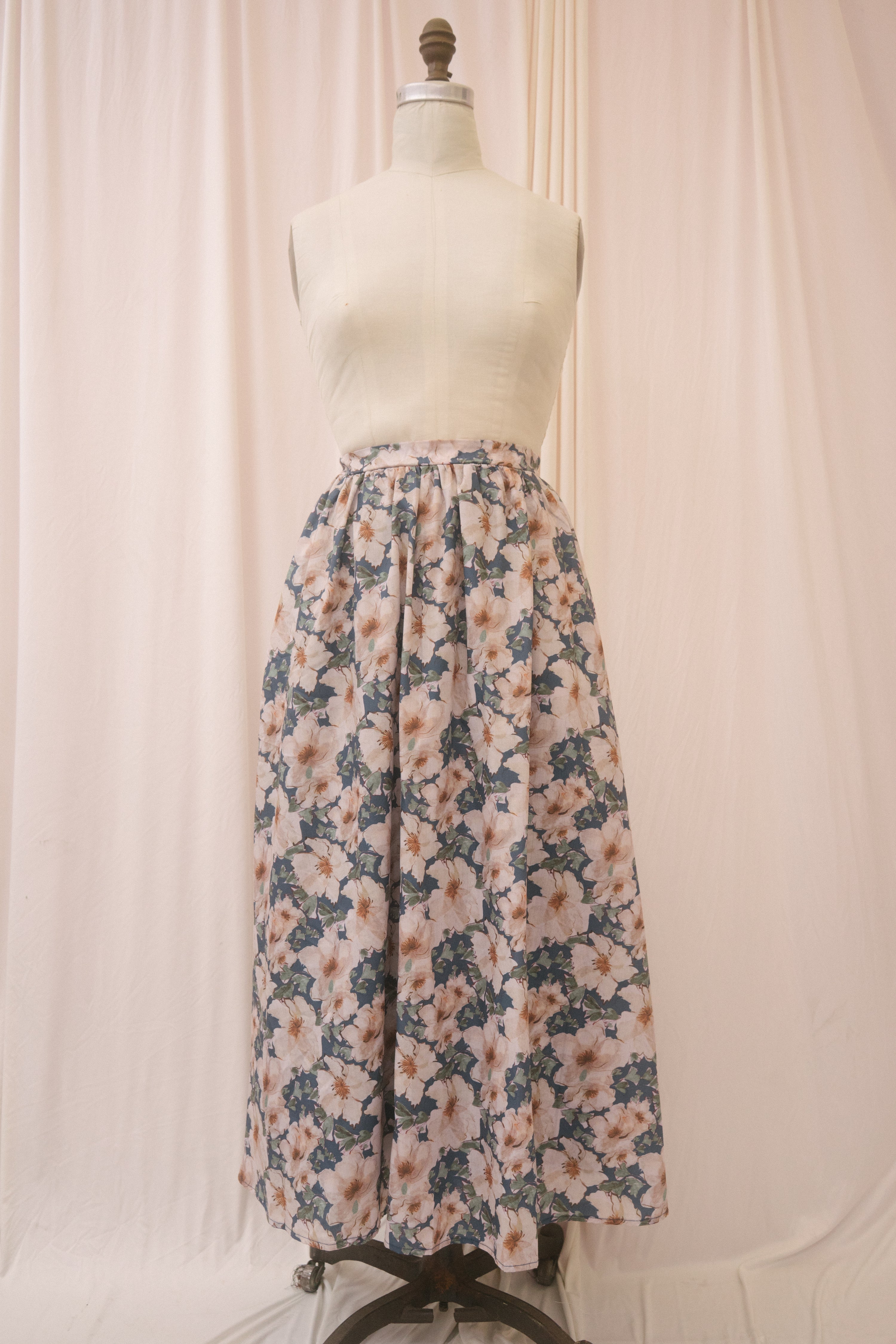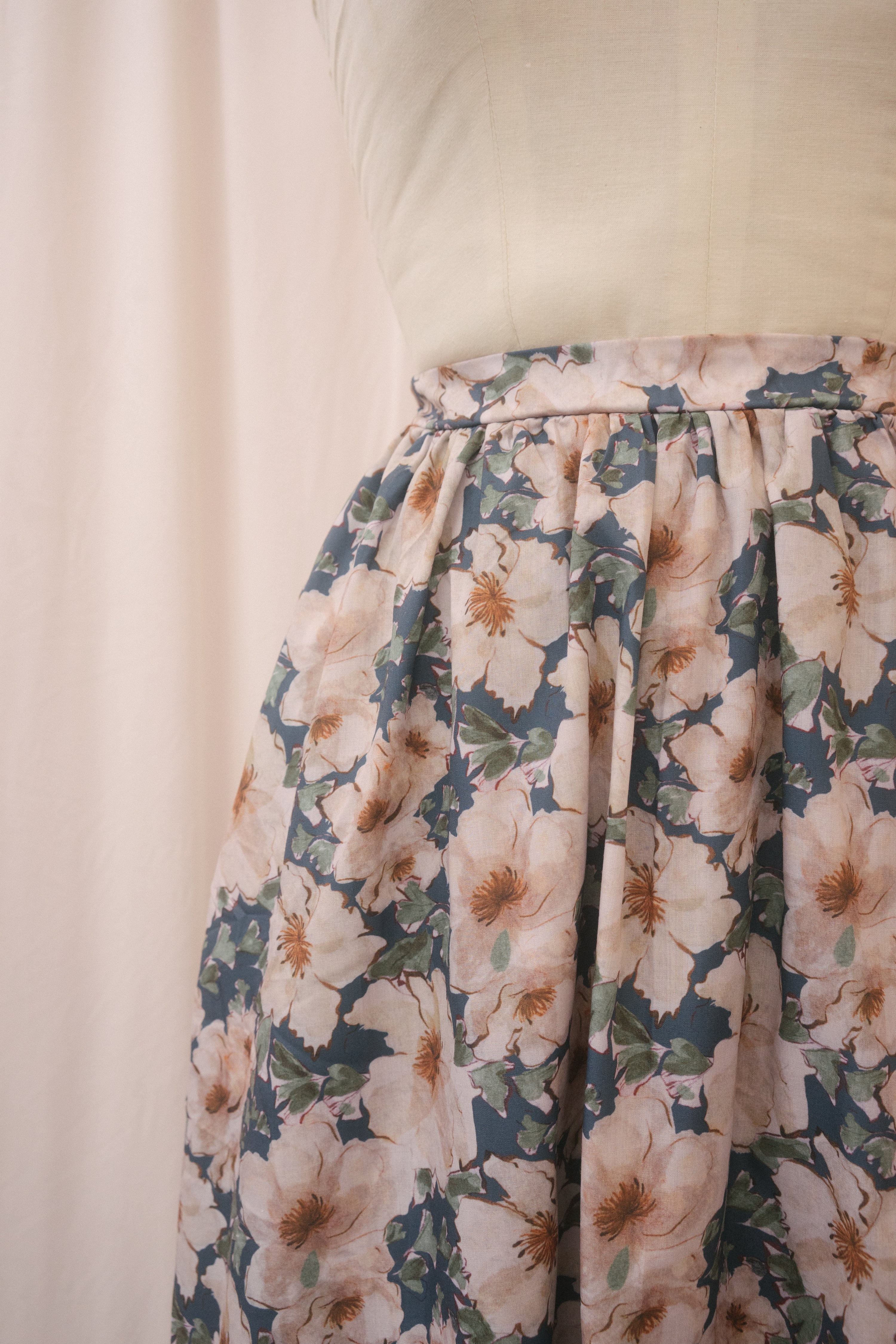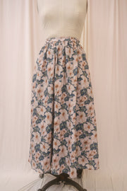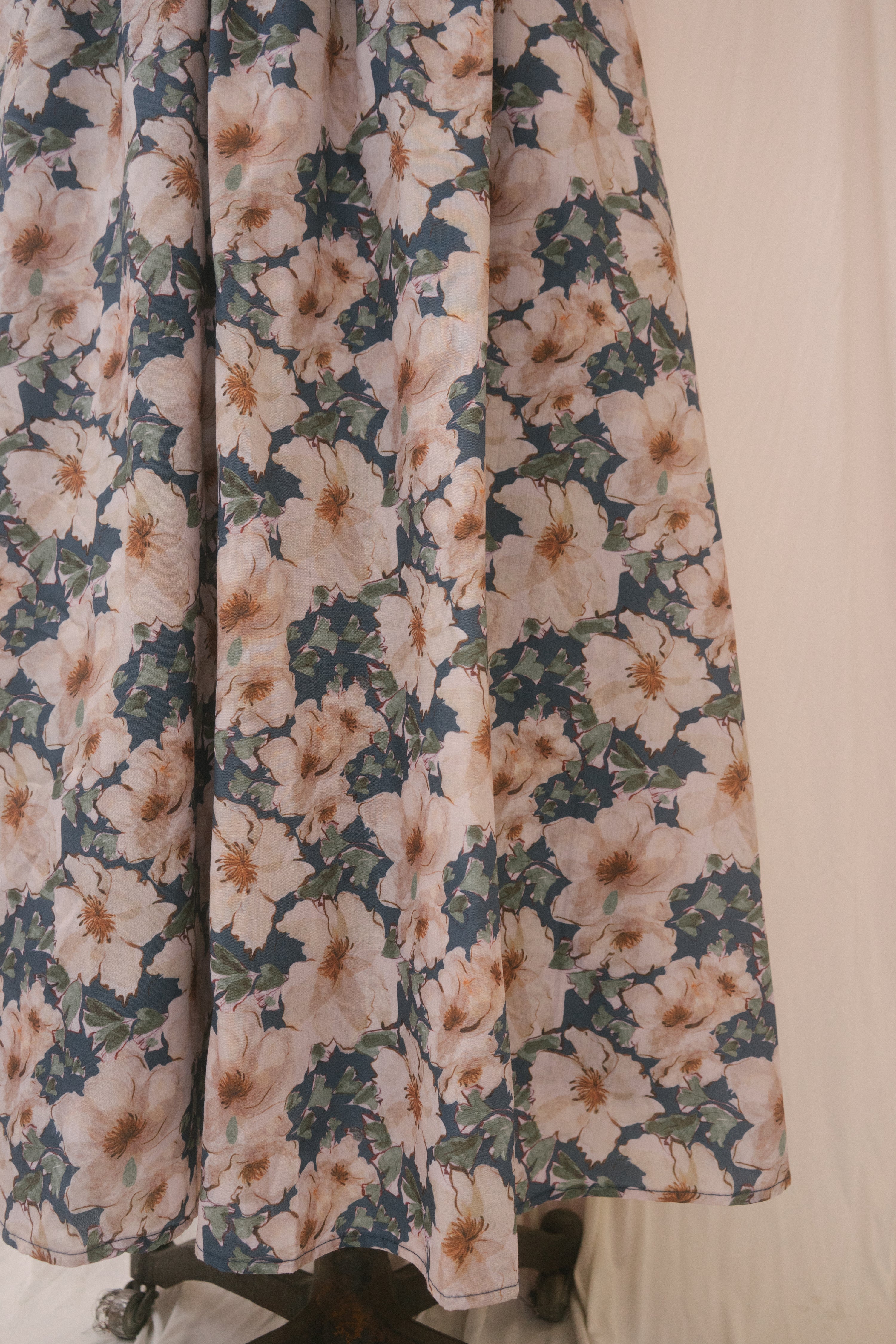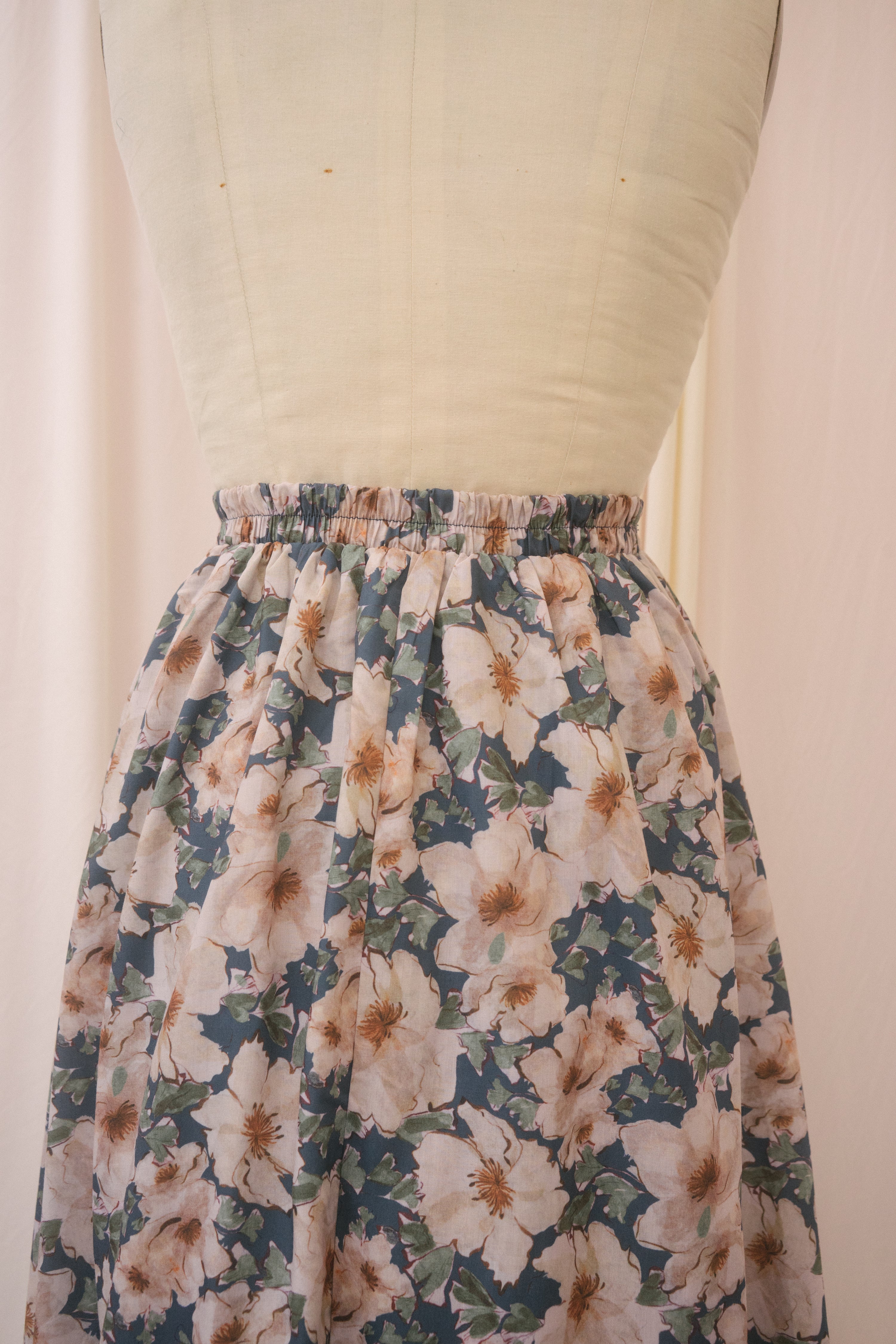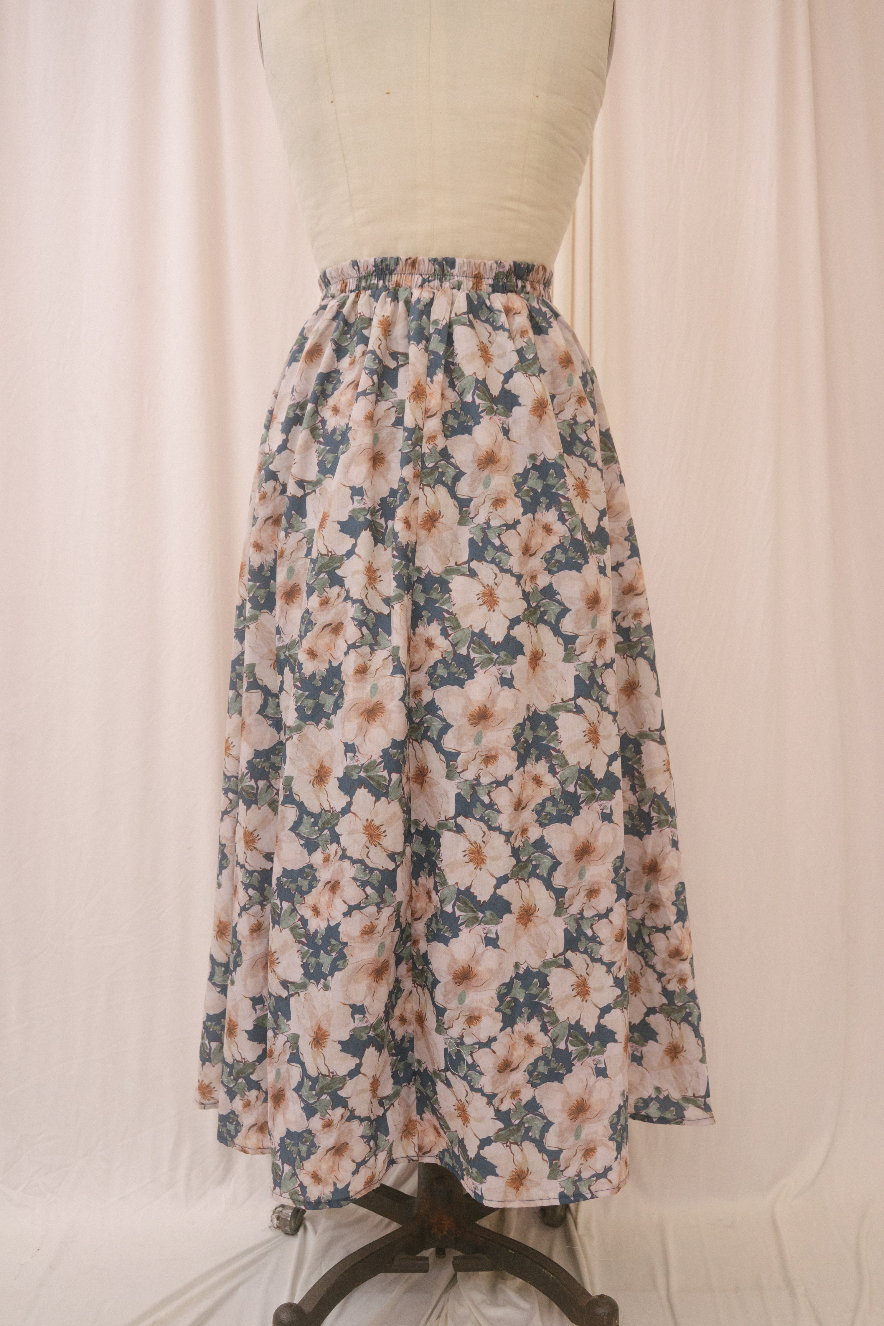 Throw your sandals off and run barefoot through the ferns in the Tamsin skirt. Designed with an elastic back band to sit comfortably at the natural waist, this light summer a-line midi skirt is patterned with large cream-colored blooms set on a moody blue background amongst green foliage. Best of all, the Tamsin features pockets for all of your secret snacks!