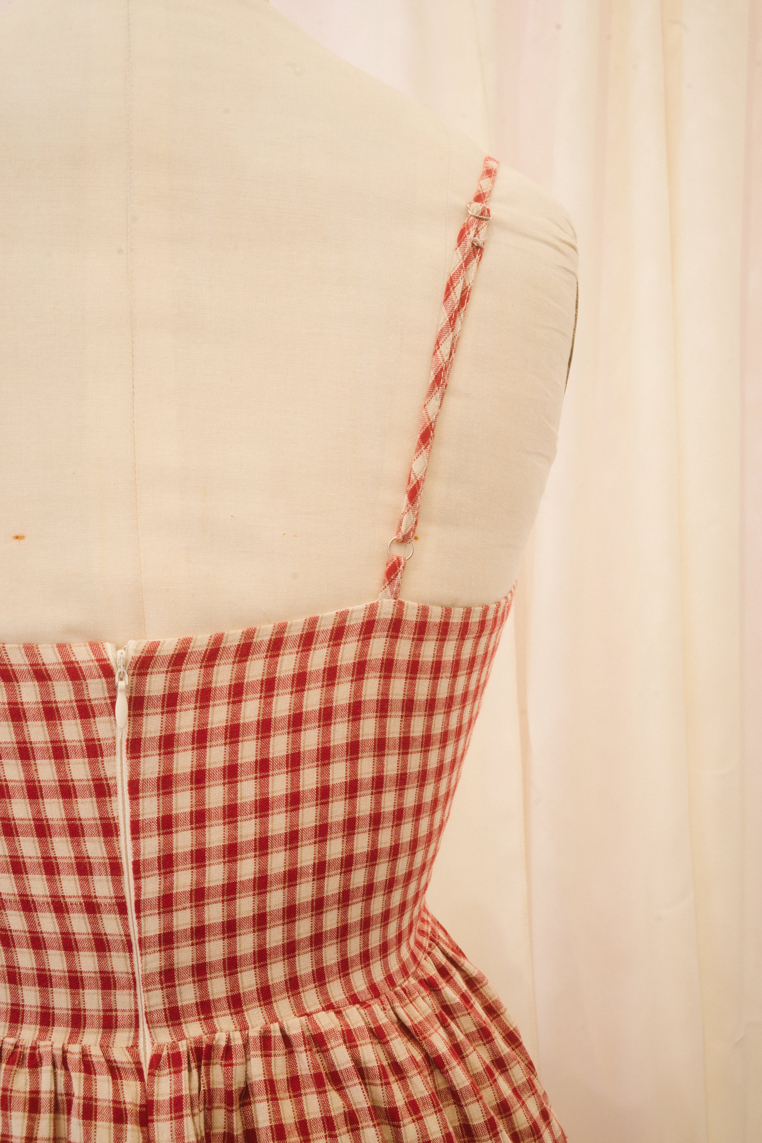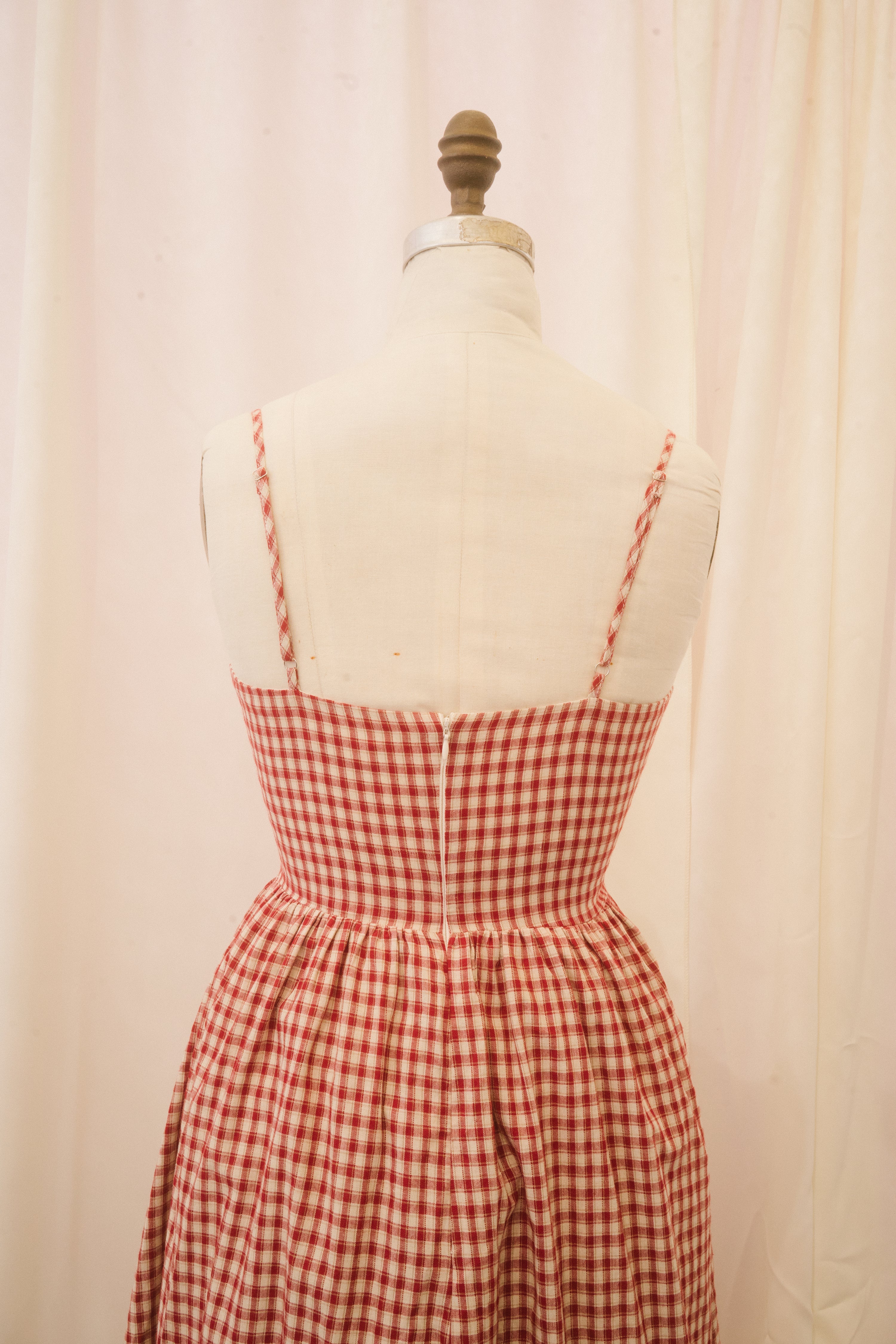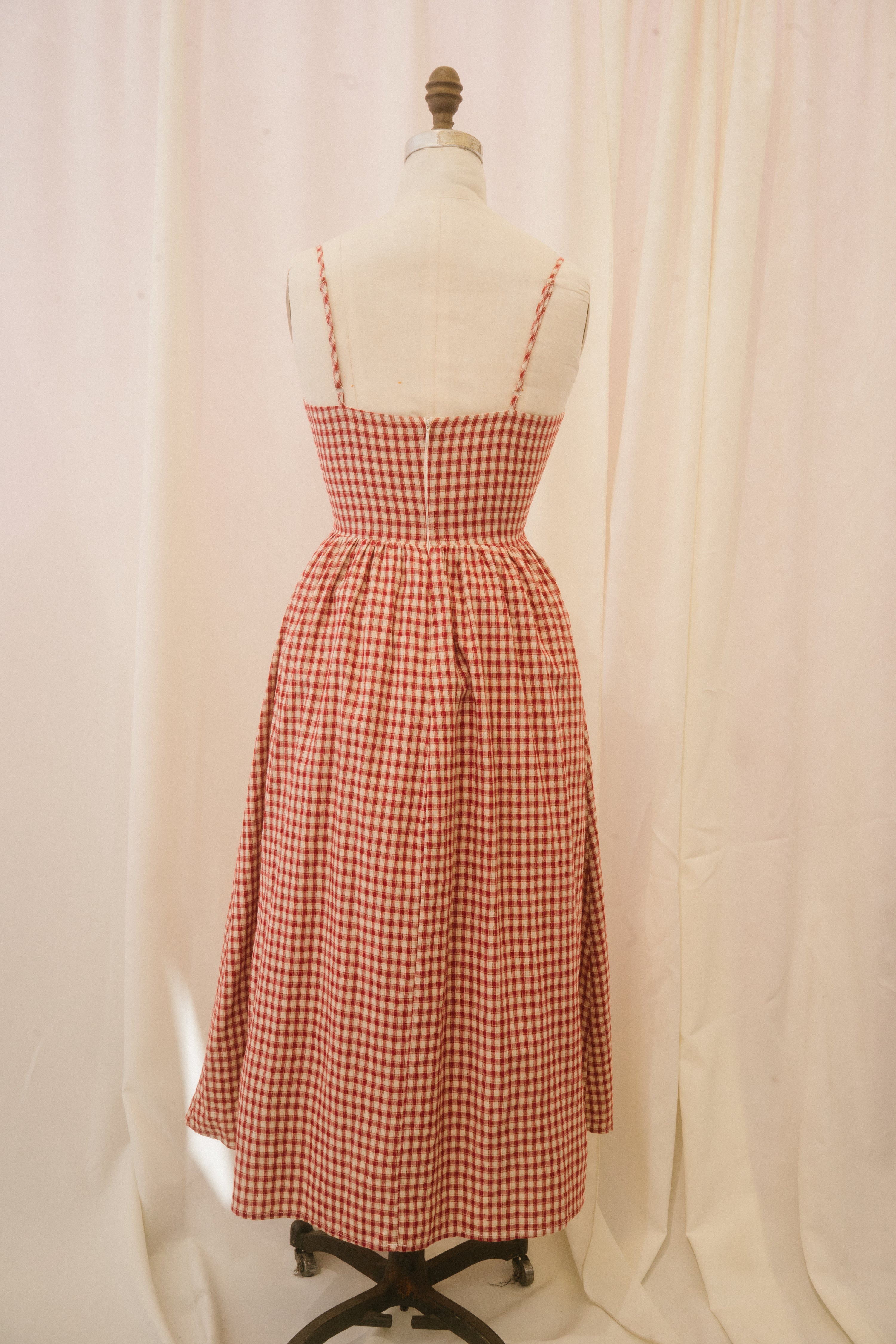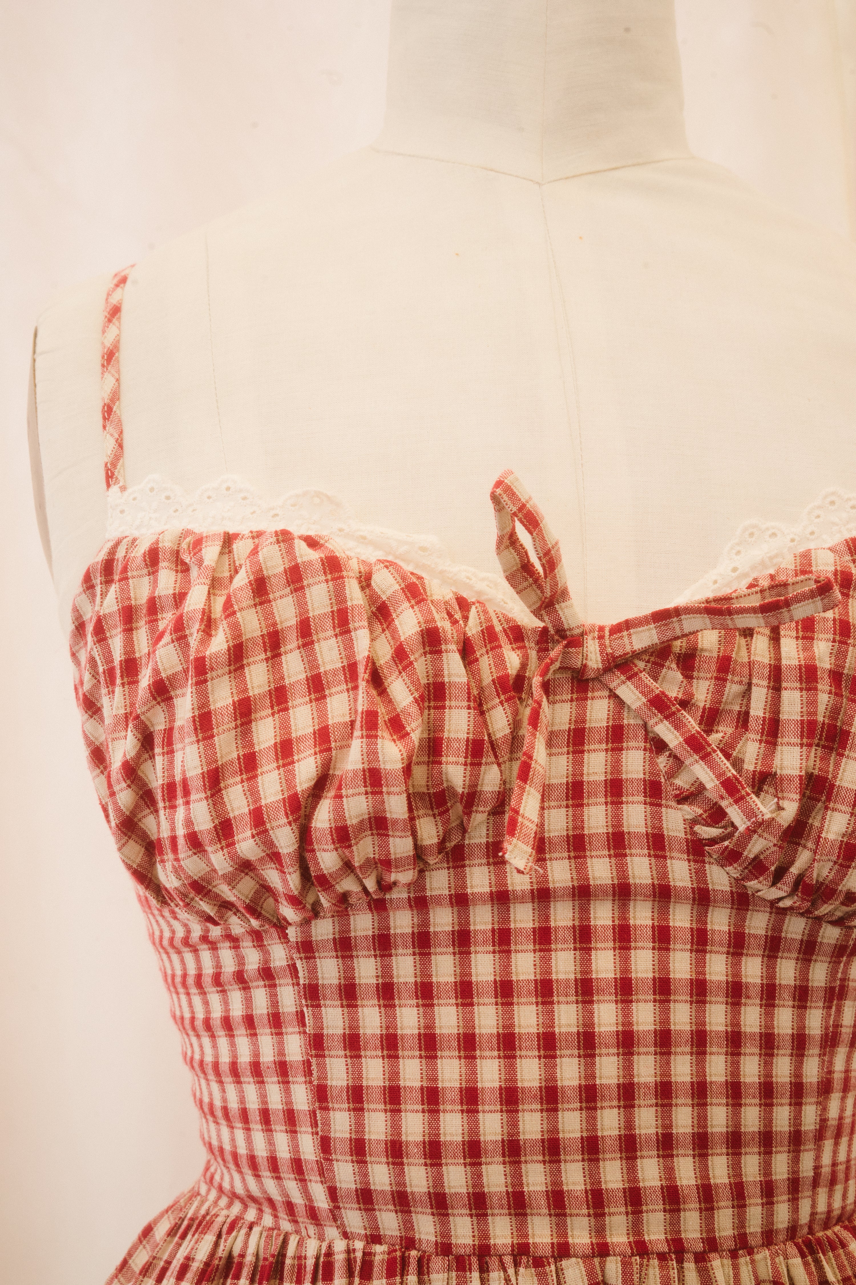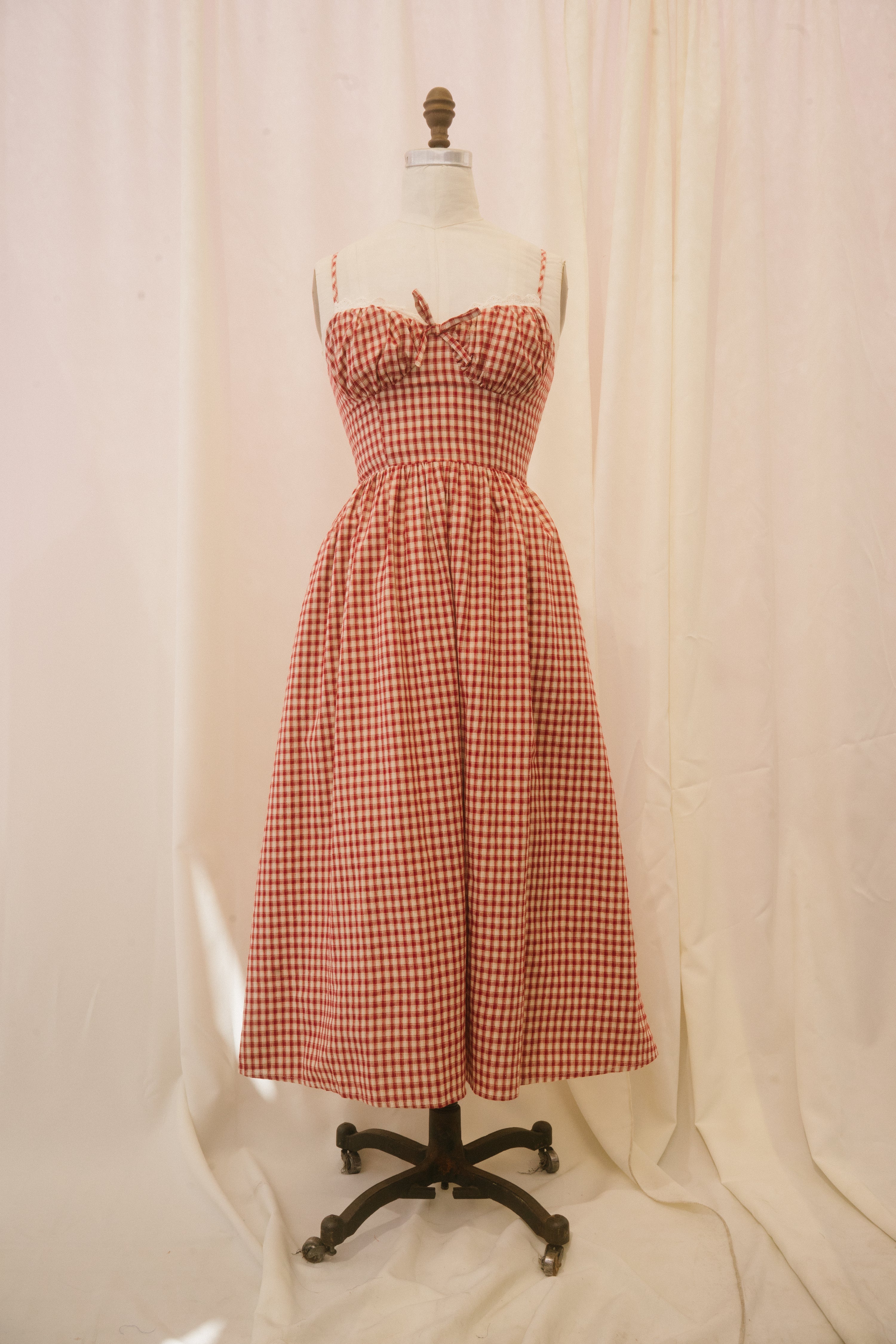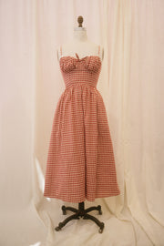 The Taytana dress is ready for sun-kissed, summer skin. This midi length spaghetti strap sundress comes in a cream and crimson gingham fabric and features a sweetheart bust with a white scalloped eyelet lace border and a bow at the center of the bodice. The ample skirt falls from the natural waist and features hidden pockets. A hidden back zipper makes the Taytana easy to throw on and go! Dress her up with espadrilles for a classic warm-weather look, or lean into the grunge effect by styling her with platform combat boots and a slouchy leather bag.