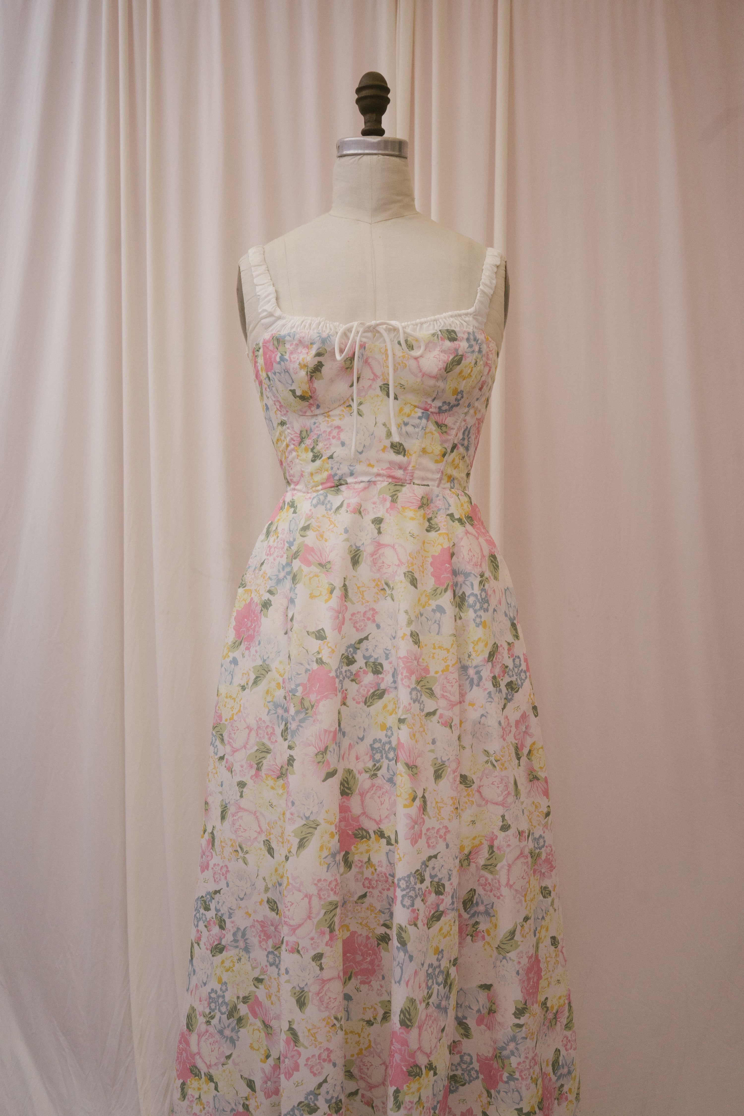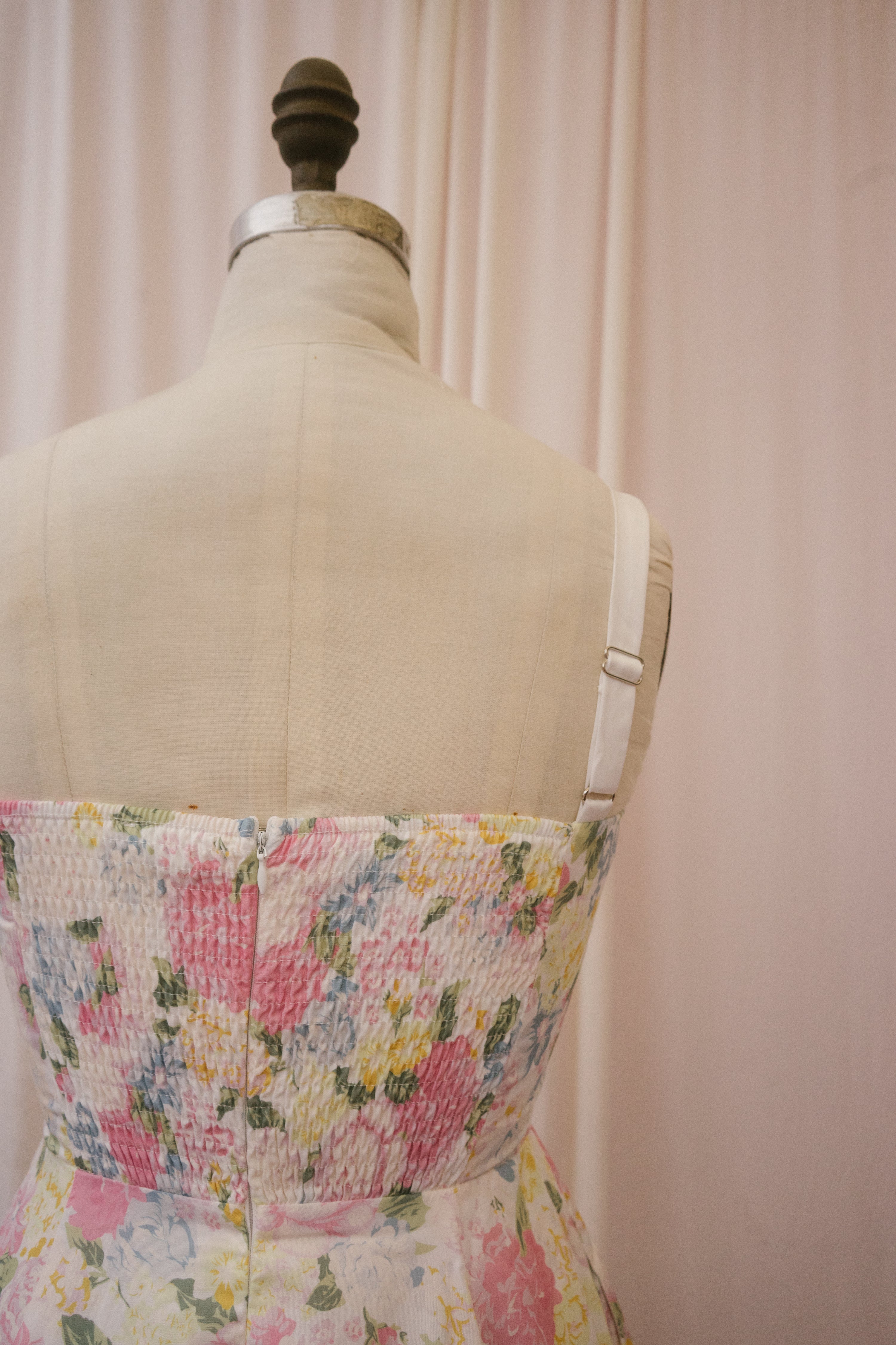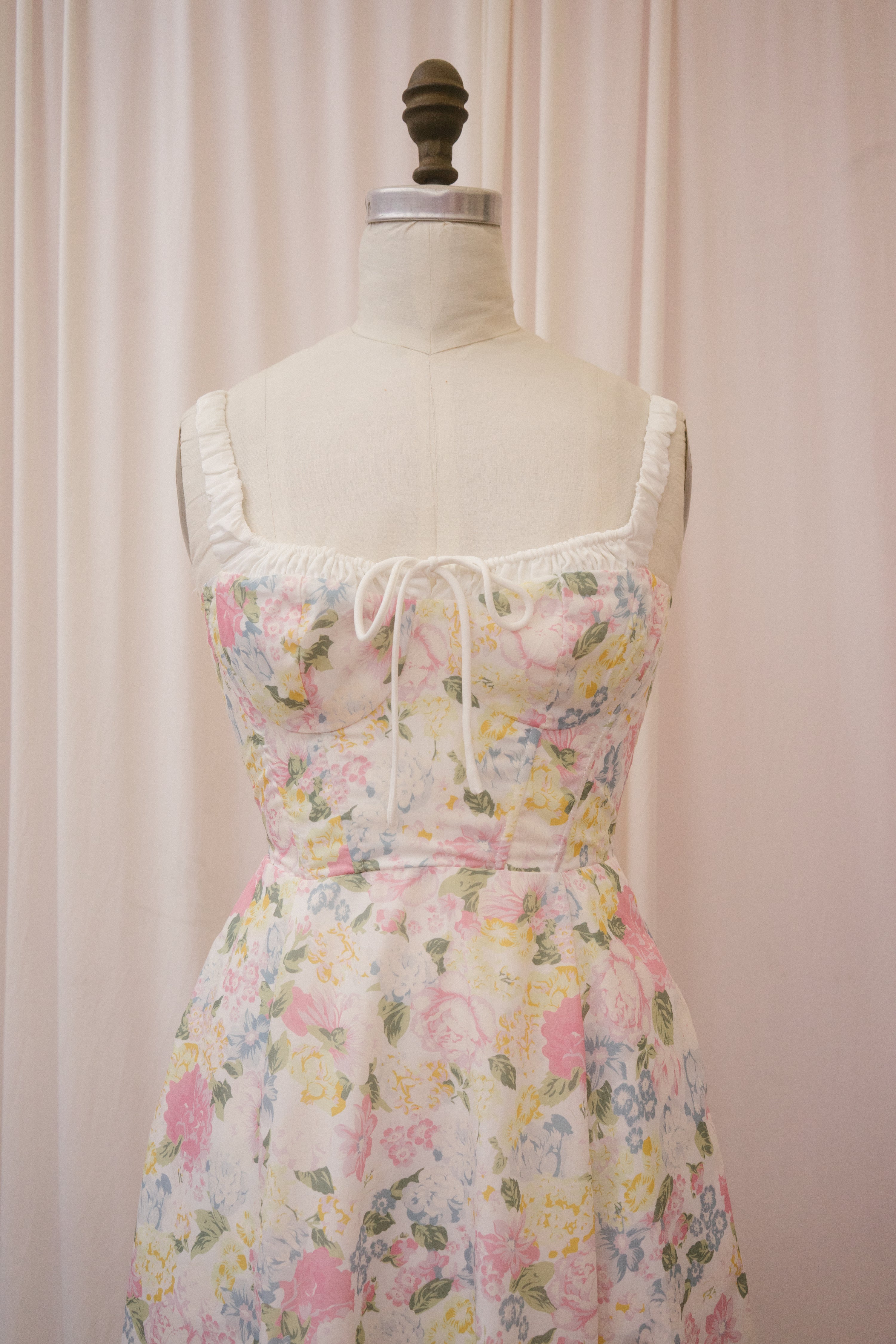Laura Ashley called and she wants the Tiffany dress all to herself! This spaghetti strap midi sundress is patterned throughout with the perfect 80s cool-girl floral in pink, blue, yellow, and green atop a white base. The milkmaid bodice features subtle ruching at the tie neckline and up the fully adjustable straps. Light boning in the front gives the bodice structure, while the zippered and fully smocked back ensures a comfy, personalized fit. The a-line skirt features hidden pockets, perfect for your snackes and scrunchie!