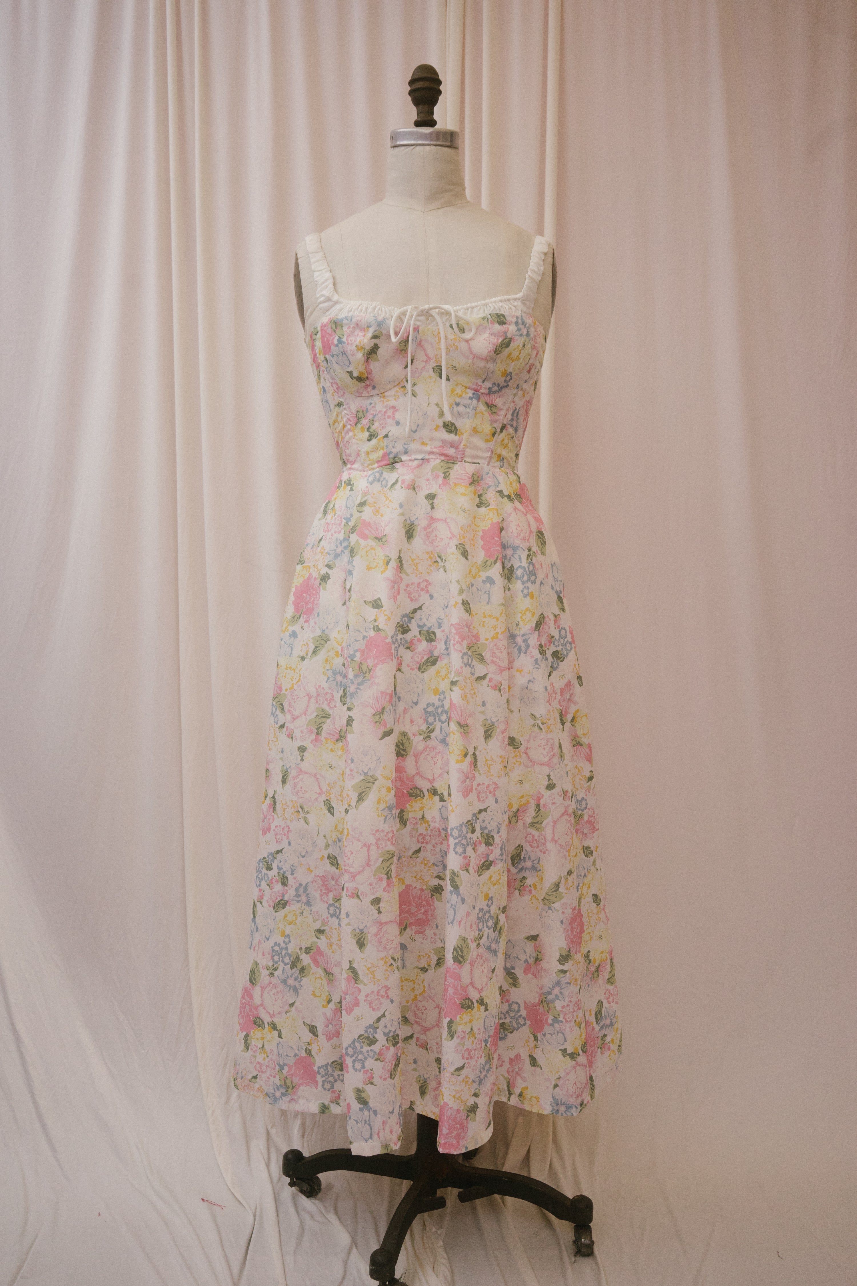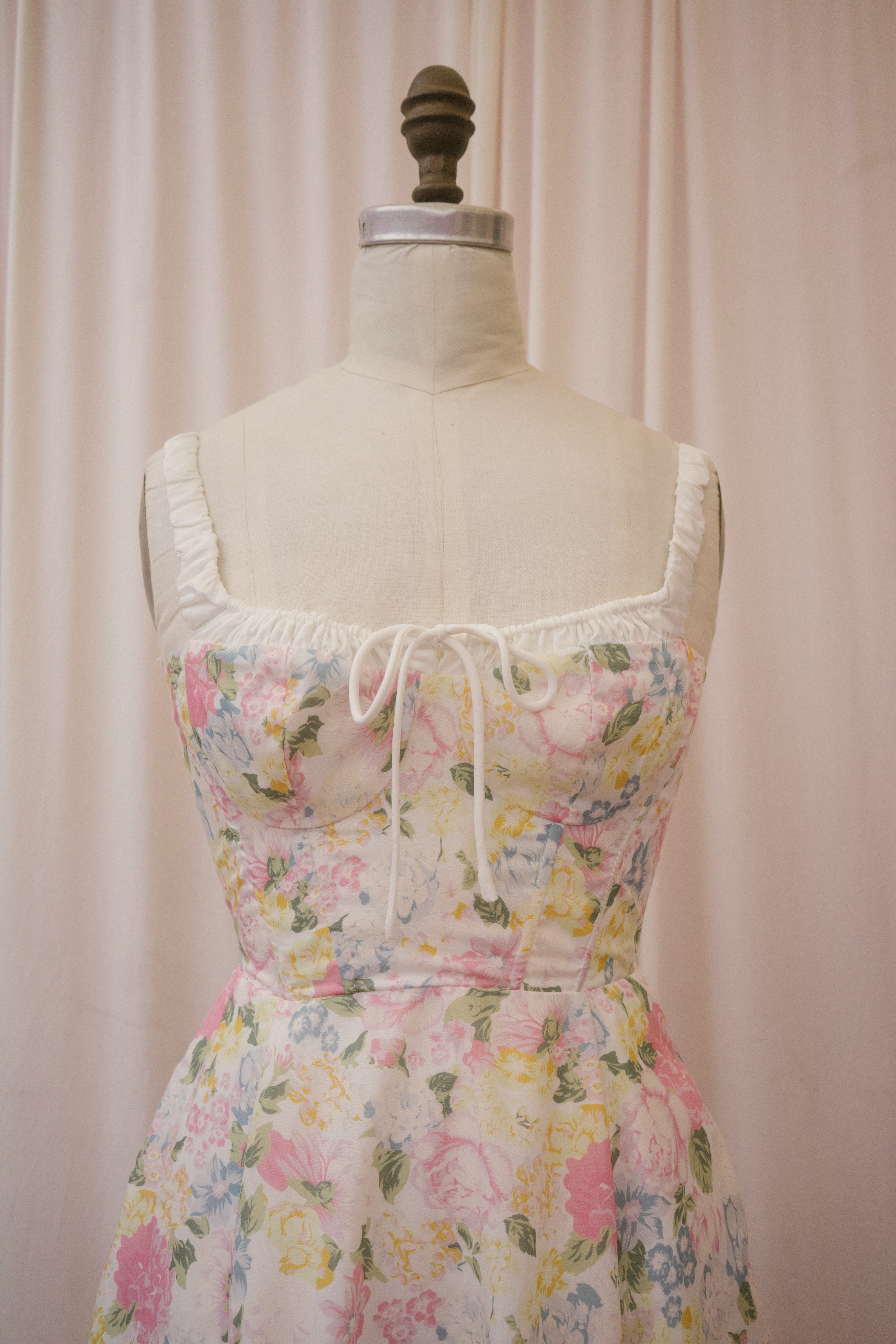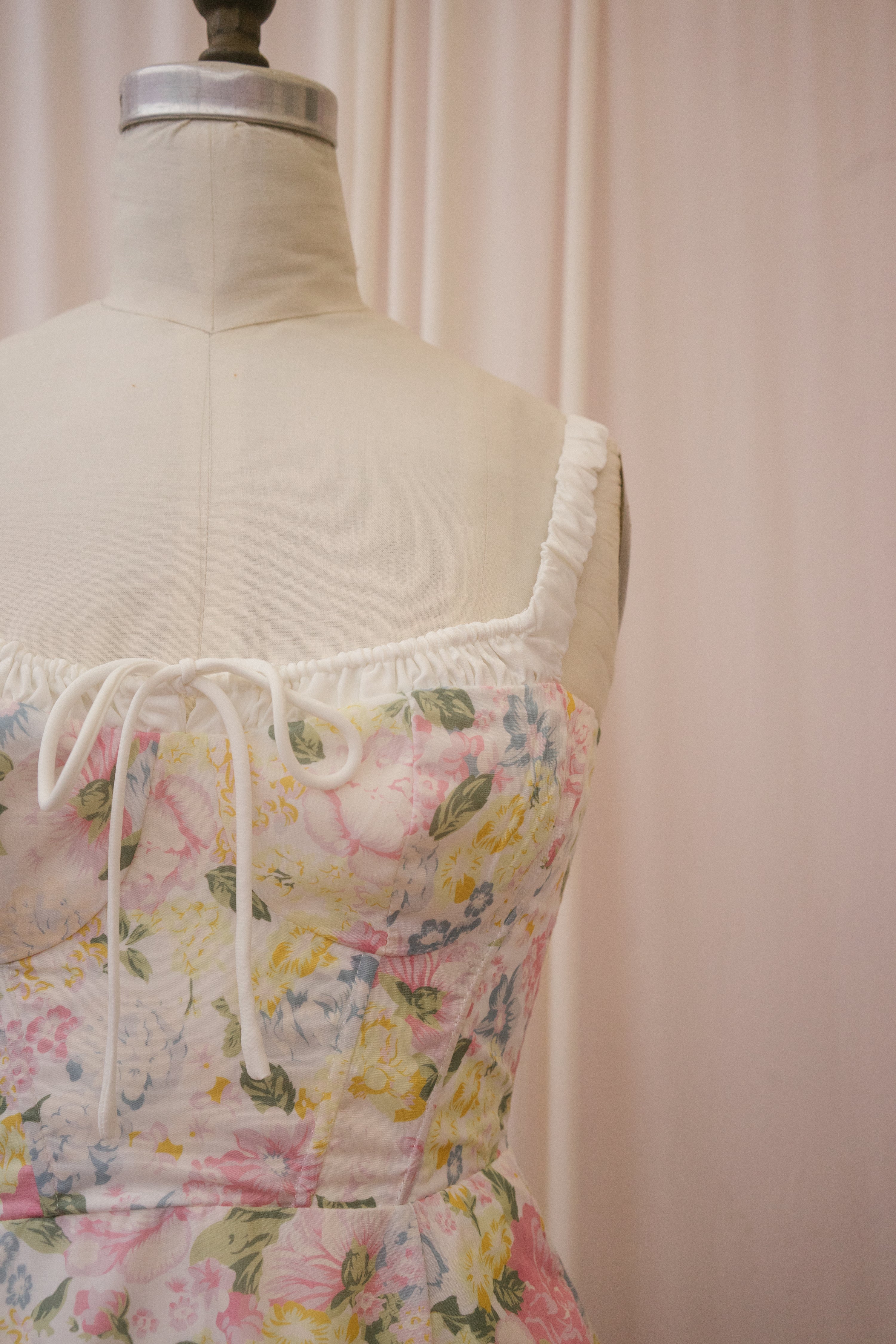 Laura Ashley called and she wants the Tiffany dress all to herself! This spaghetti strap midi sundress is patterned throughout with the perfect 80s cool-girl floral in pink, blue, yellow, and green atop a white base. The milkmaid bodice features subtle ruching at the tie neckline and up the fully adjustable straps. Light boning in the front gives the bodice structure, while the zippered and fully smocked back ensures a comfy, personalized fit. The a-line skirt features hidden pockets, perfect for your snackes and scrunchie!