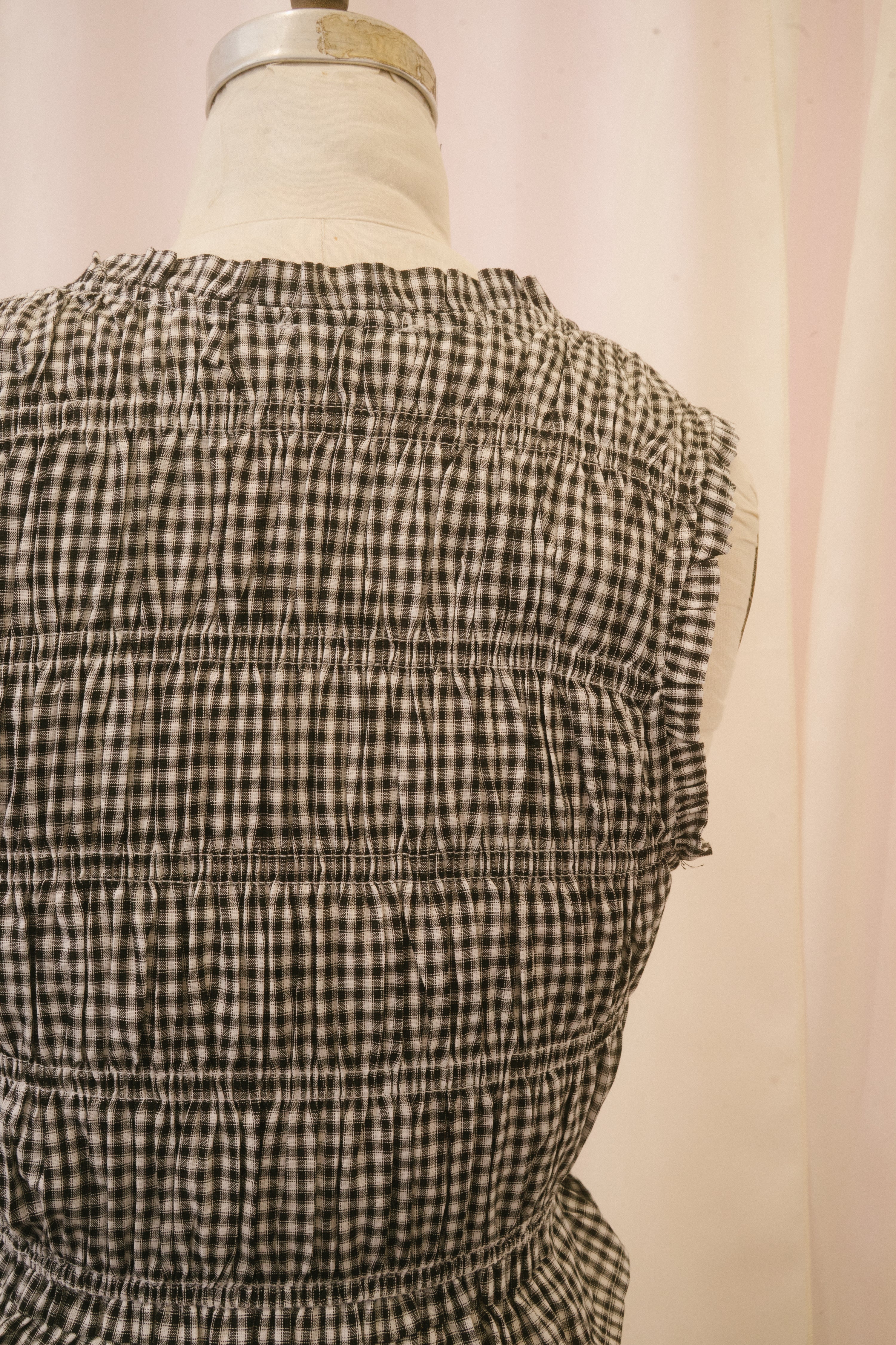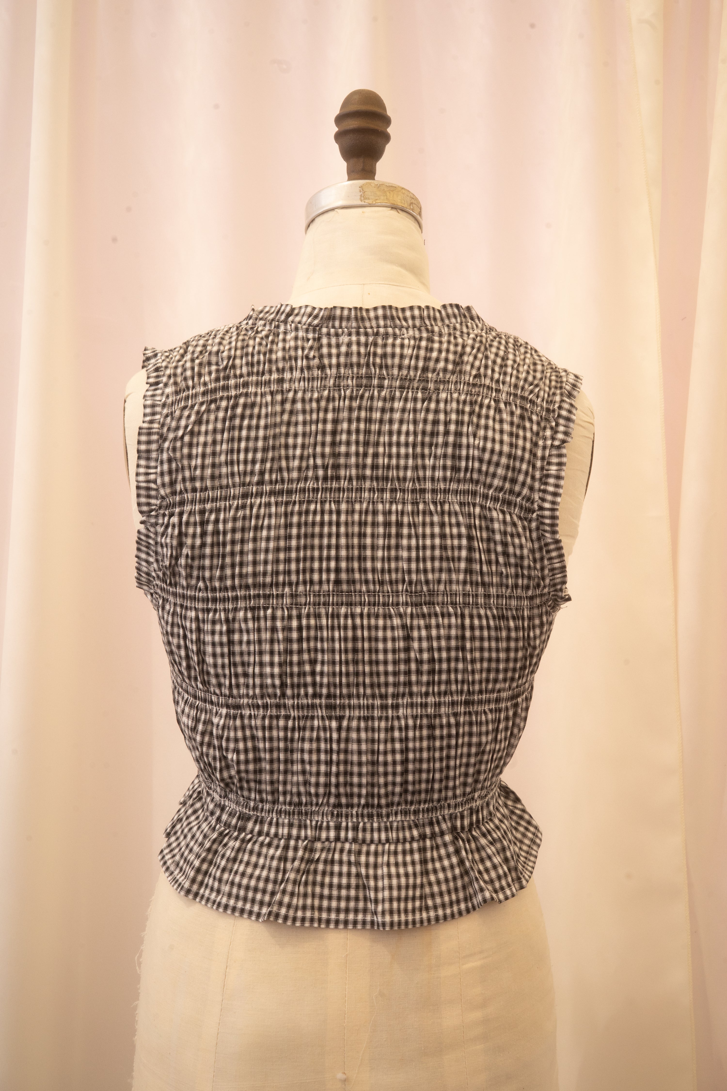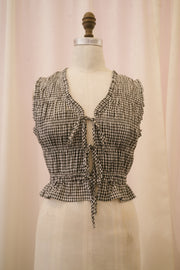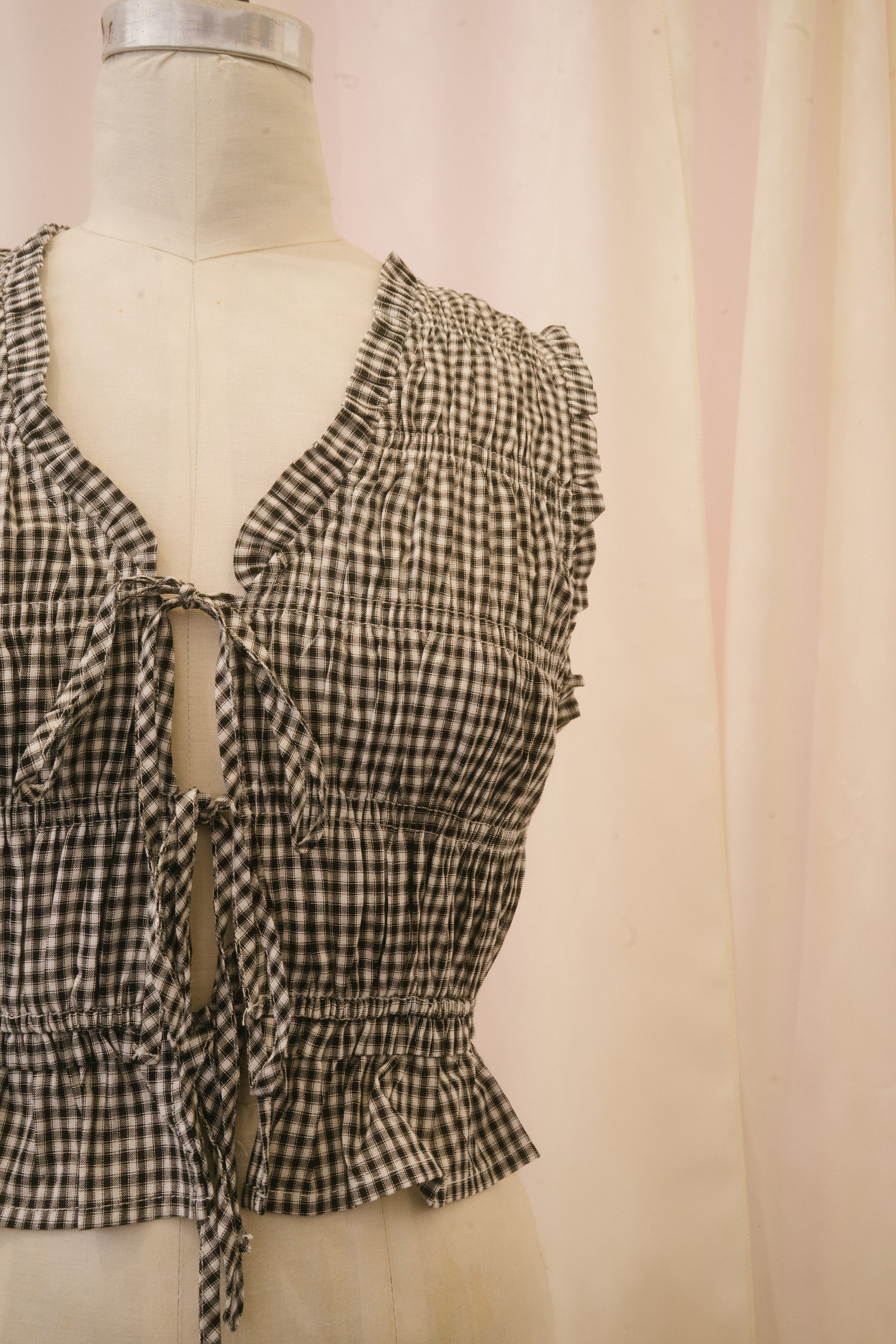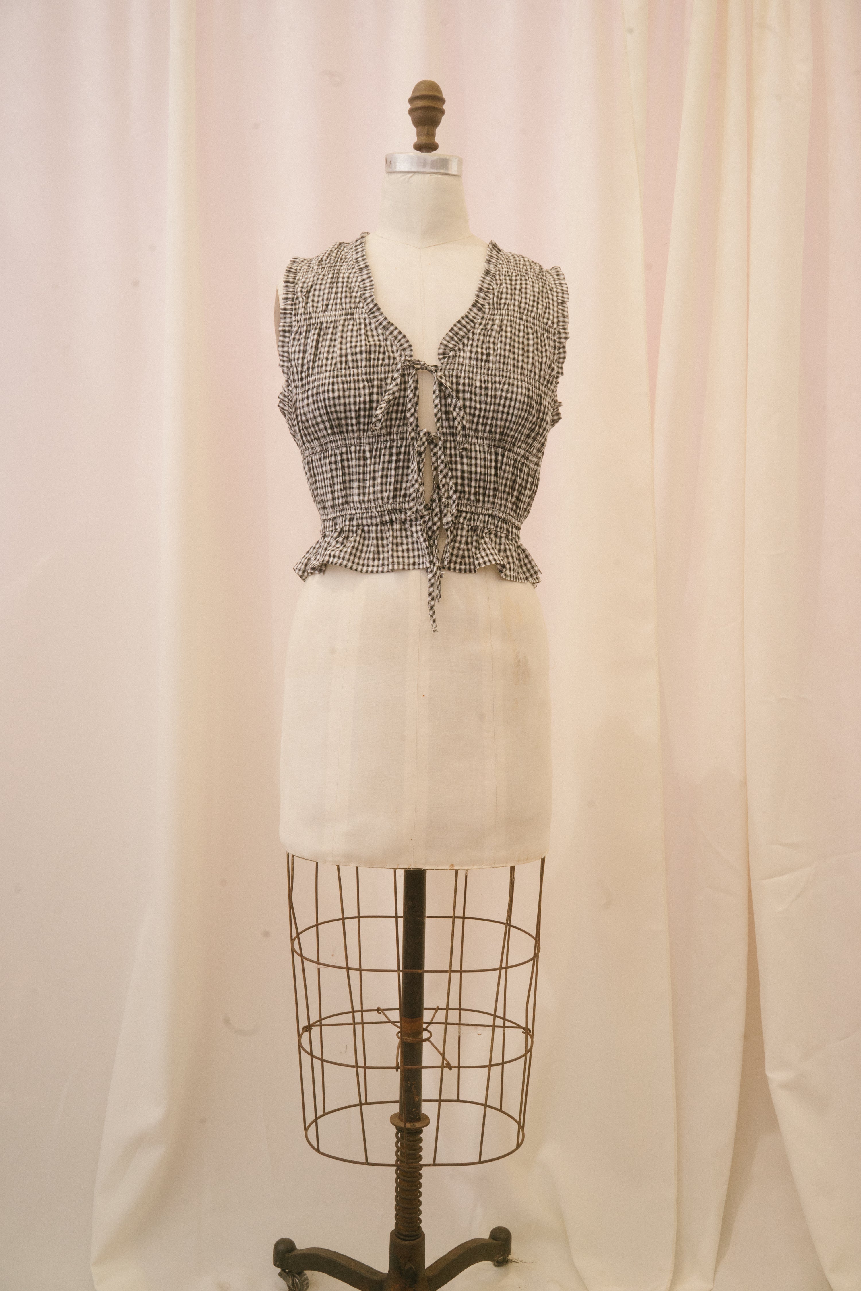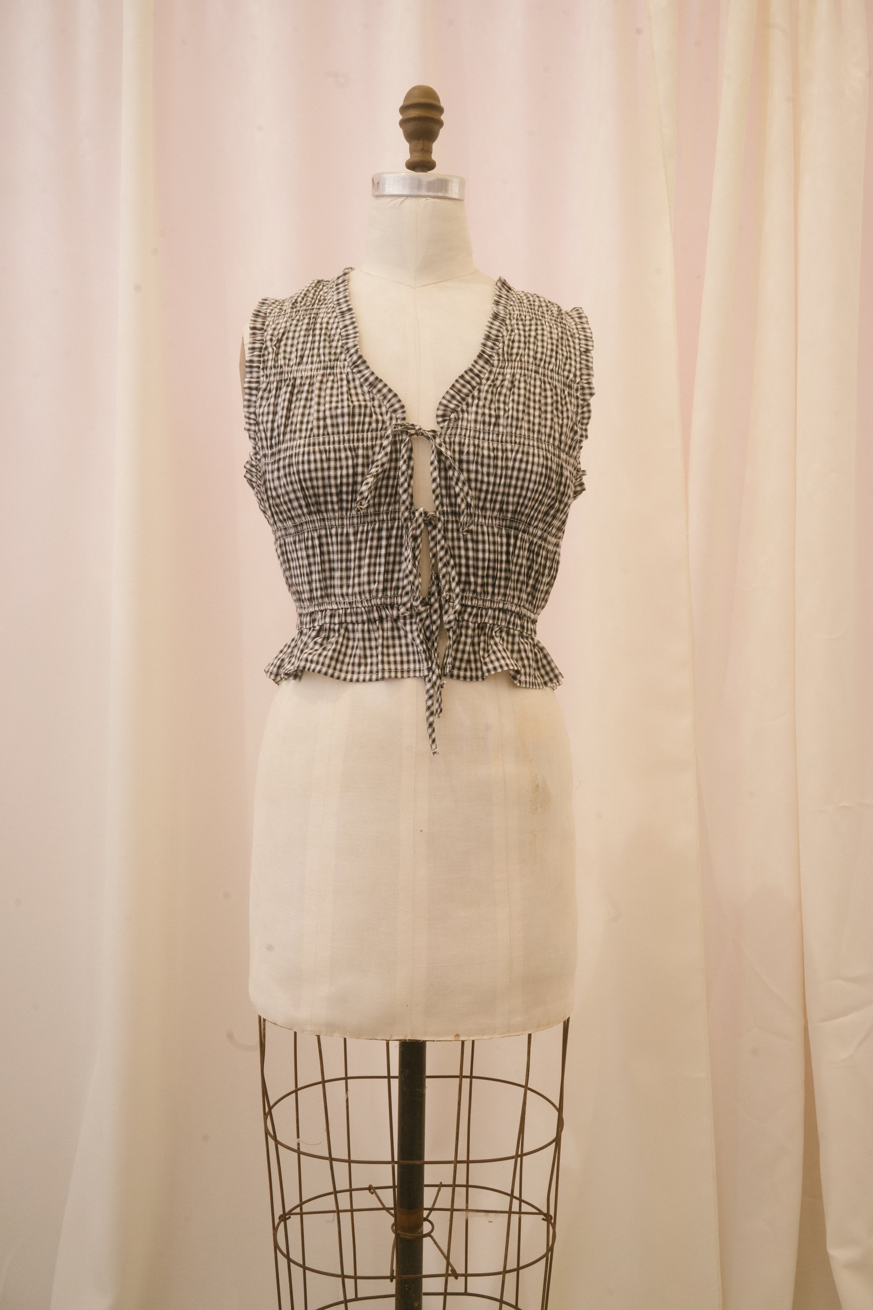 She's tiered, she's tiny, she's the Tilda top. The perfect accent on any outfit, this cropped black and white sleeveless top can be styled open as a wasitcoat or tied and worn as a standalone top. The v-neck bodice features three elasticated panels that tie at the open center with ribbon bows. Subtle ruffles on the neckline, straps, and bottom tier create volume and a subtle peplum shape. Pair Tilda with the Indigo skirt, for an easy outfit that's got fall style in spades!