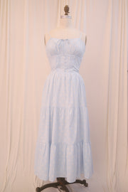 Be the princess of the picnic in our darling Vana dress. This midi sundress comes in a breezy blue and white stripe print, flecked with delicate white and yellow daisies. The adjustable neckline settles into a subtle v-shape at the center, which features a fully adjustable bow tie closure. The lightly pleated bodice highlights the natural waist, with a row of fabricated buttons down the center. The adjustable spaghetti straps and partially smocked back make this piece both comfortable and versatile, while the tiered skirt brings a touch of drama. Style with espadrille wedges and a straw sun hat.