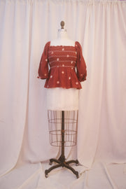 The Tori Blouse is our new go-to for fall romance that you can just throw on and go! This darling blouse comes in a rusty red poplin cotton and is embellished throughout with pink and white embroidered daisies. The bodice is fully smocked, giving shape and support that moves with you for a subtle peplum effect. The square neckline and three-quarter length puff sleeves are finished with a ruffle at the hems for a little extra flounce.