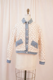 The Jenna jacket is stitched from soft cotton quilting for comfort and warmth, with collar, pockets, cuffs, and hems crafted from medium-wash denim for a touch of rustic charm and structure. Dainty crimson flowers bloom across the warm white outer shell, giving the piece a tender, homespun elegance. It's a jacket made for crisp mornings, countryside wanders, or a stroll through the farmer's market.