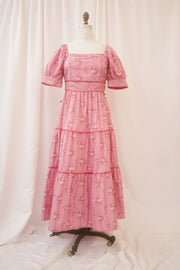 Sweet, vibrant, and irresistibly romantic, the Sorbet Dress is made for moments that feel like falling in love. This puff sleeve maxi dress comes in a berry pink cotton patterned with vertical rows of florals. The square neckline features a magenta border of scalloped rickrack that repeats on the cuffs, empire waistline, and tiers of the a-line skirt. A smocked back ensures a comfortable, flattering fit, while the rear waist tie cinches everything together.