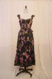 The Alara dress in Midnight Floral is moody evening perfection. This spaghetti strap midi dress comes in a black, slinky fabric paterned with large purple and green violet watercolor florals throughout. The romantic cut makes the Alara a perfect evening dress, ideal for events with a cocktail dresscode! The soft cups of the sweetheart neckline are defined with underwire, and the boning of the bodice gives a corseting effect, but the smocked back panel and hidden rear zipper make for comfortable wear with a custom fit. The skirt falls gently from the natural waist, skimming the body til it reaches the bottom tier, for a subtle mermaid shape. The thigh-high slit and independent ribbon belt bring the drama for your next fancy event, but can be styled with chunky combat boots for a cool 90s everyday vibe.
