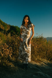 Inspired by sweet romance novels, the Allie Dress is the sweetest blend of summer meets fall. This midi dress has short flutter sleeves, a v-neckline and an empire waistline with fabric gathering details along the bust. In a cream hue, its scattered in an oversized brown rosy print with a straight slip dress style silhouette. The piece is fully lined with a pretty textured floral design. Style with an oversized knit, lace up fall booties and a dash of your favorite lipstick.