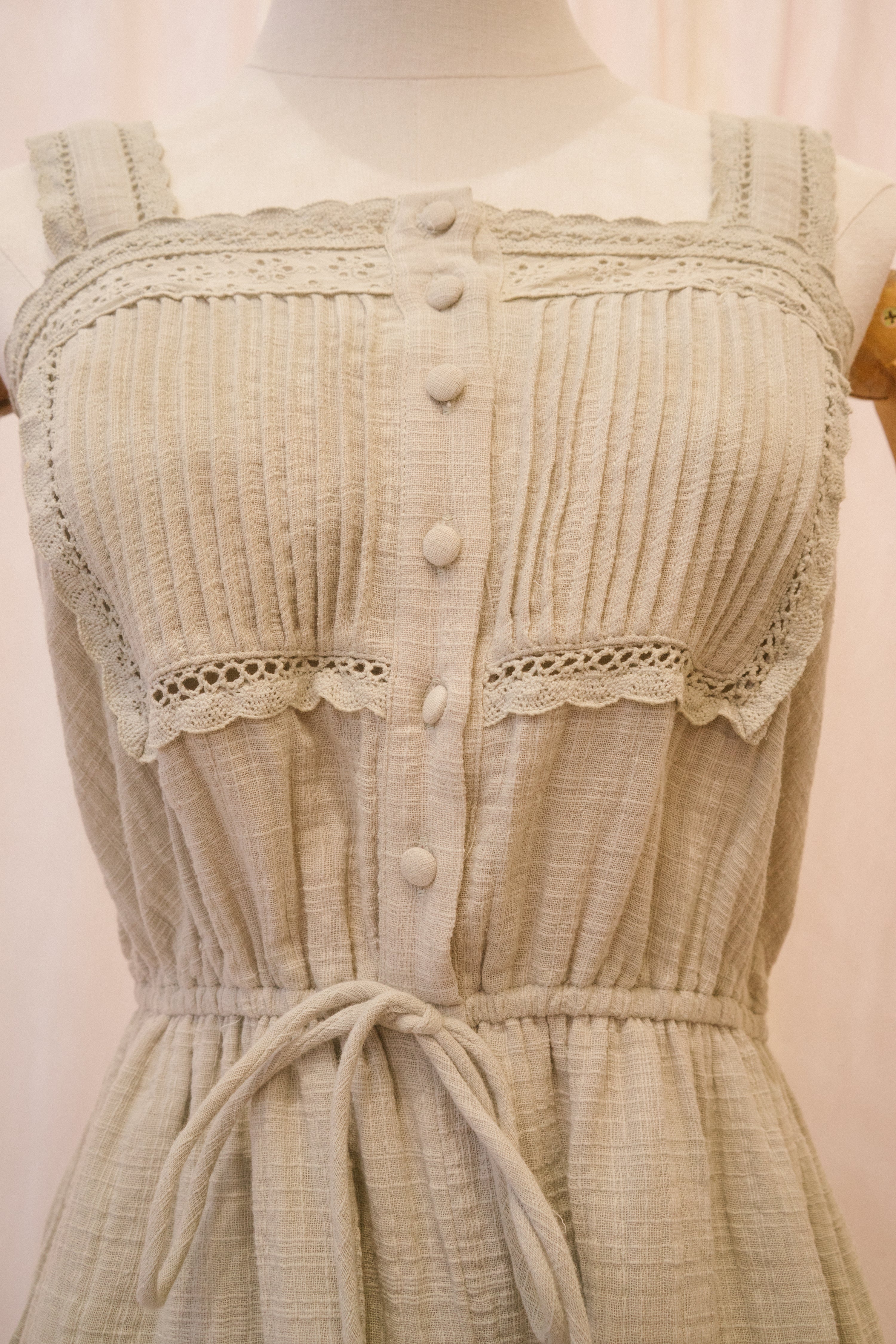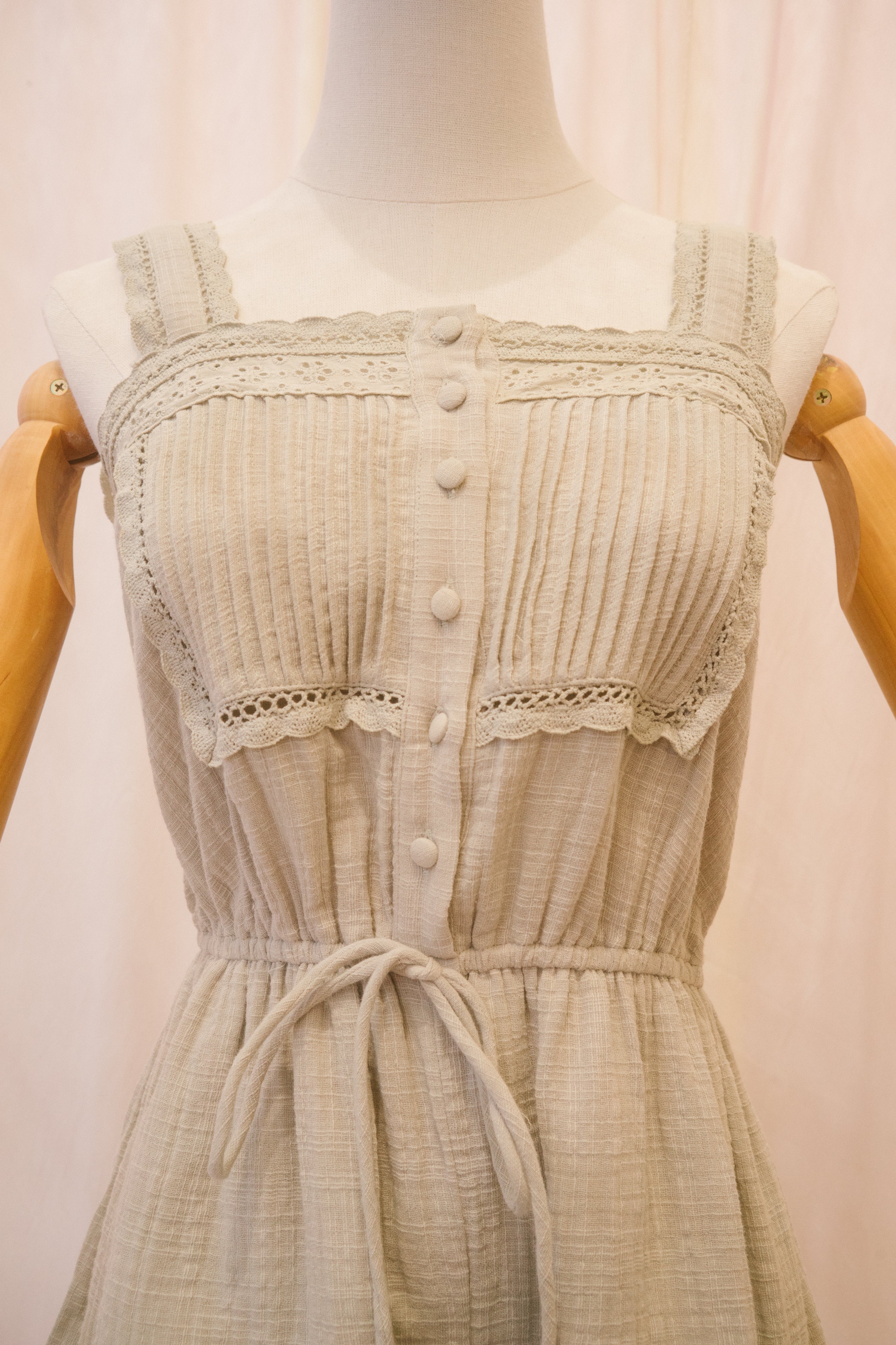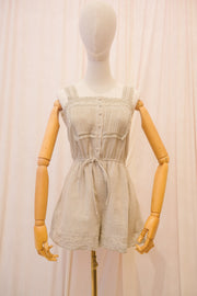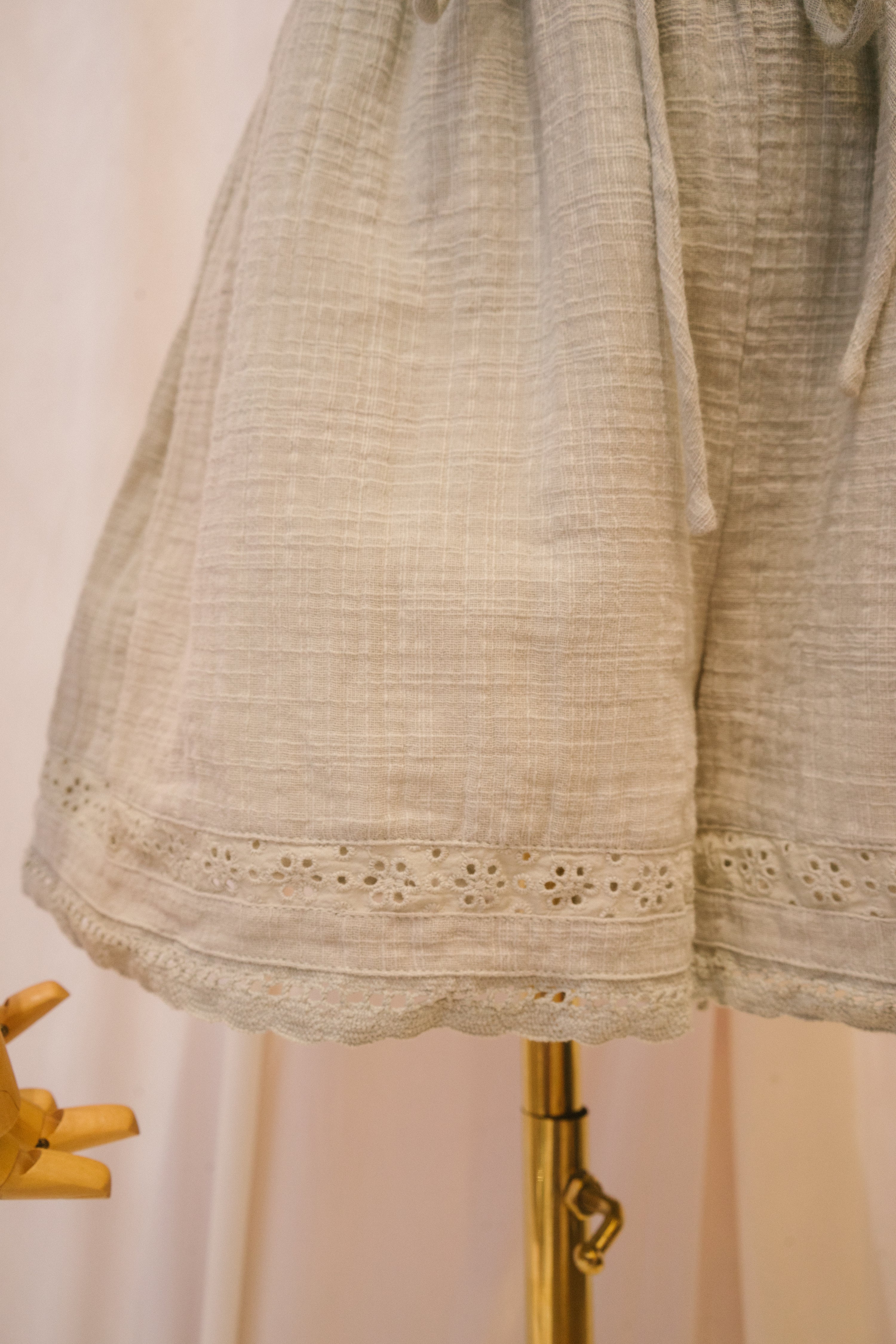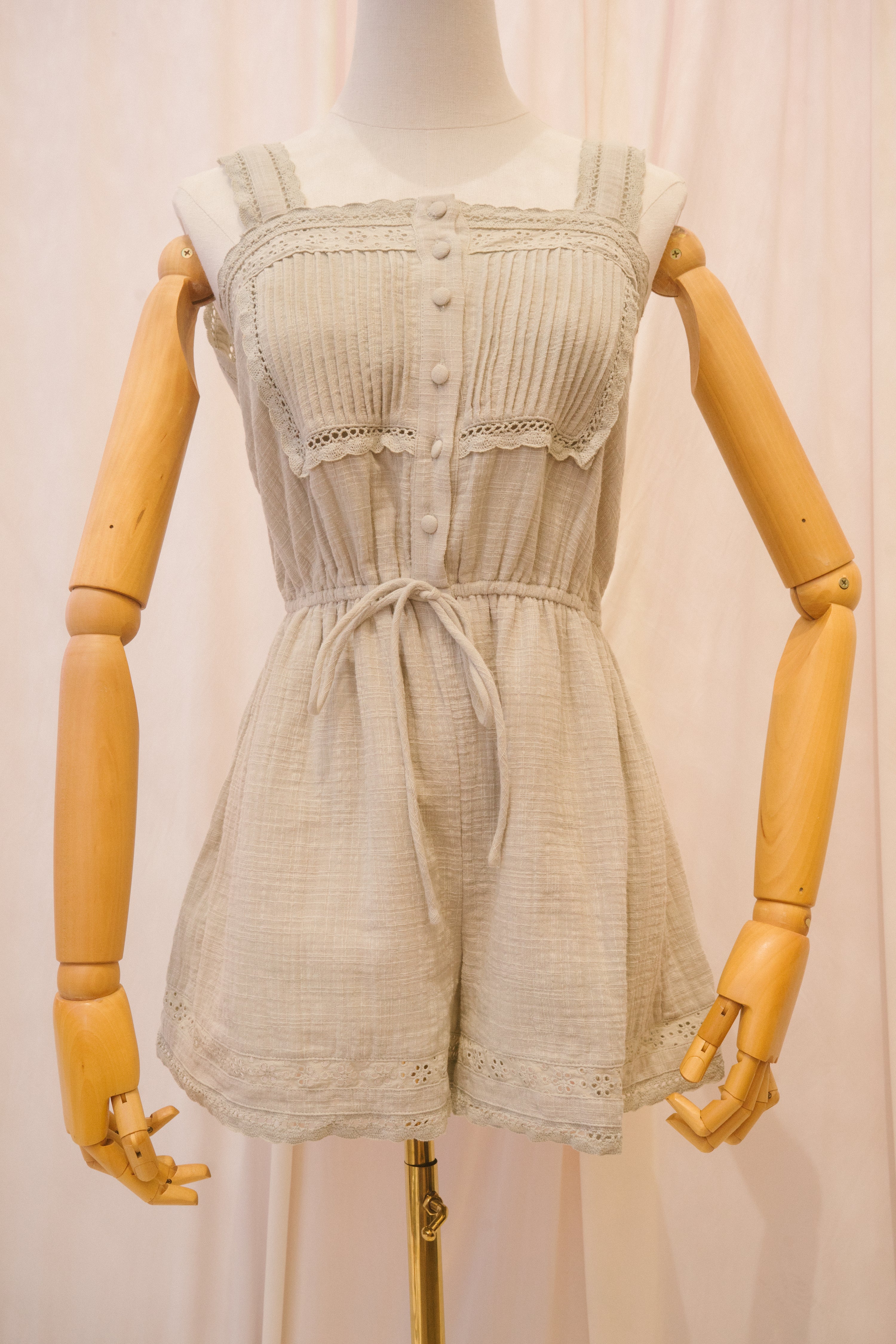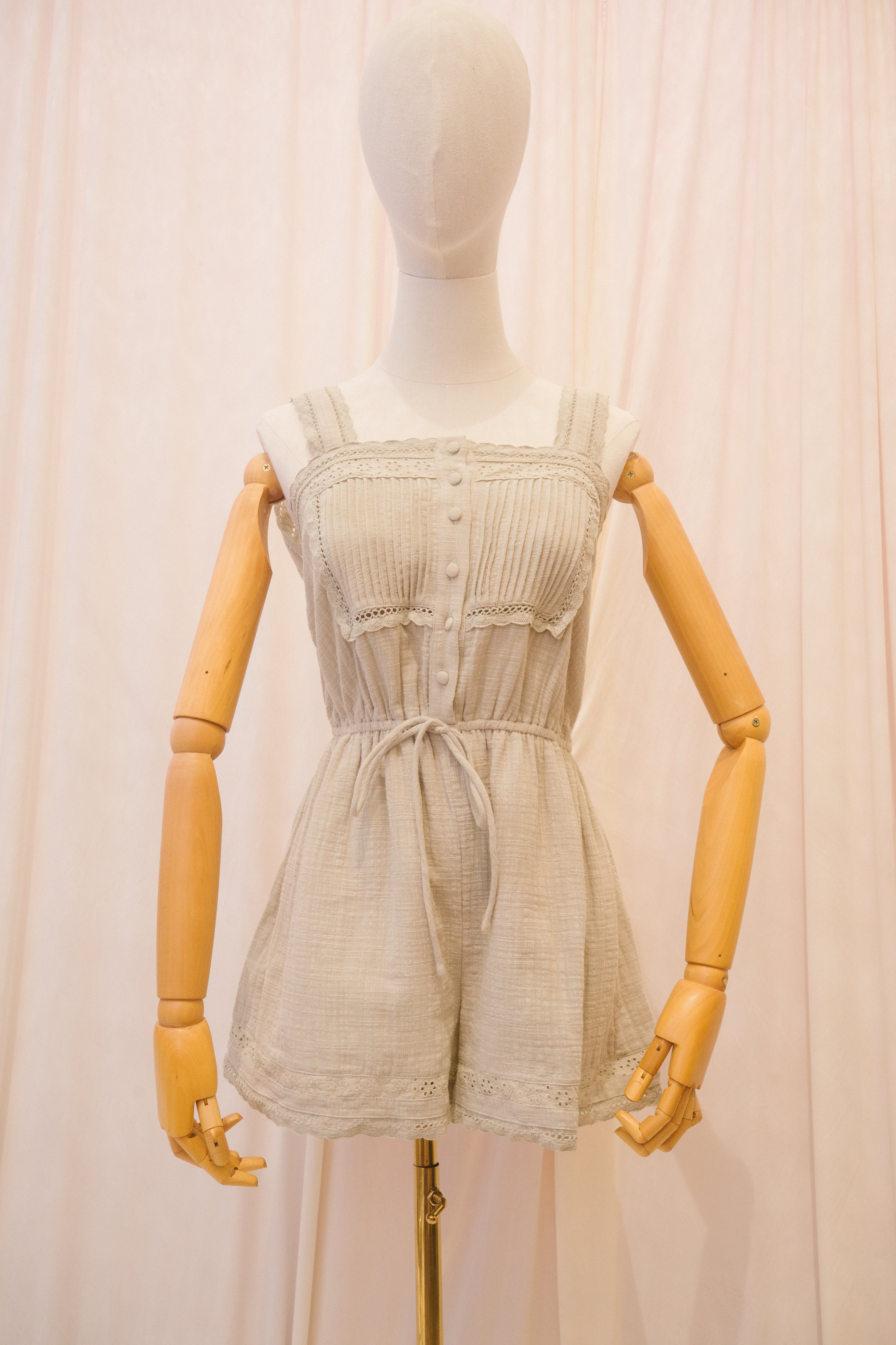 Stop to smell the roses in the Bambi romper! This short, sage green romper features so many thoughtful details designed to keep you comfortable and cute in the heat. The eyelet lace of the hem, neckline, and straps is darling, while the super stretchy elastic waistline, thicker straps, and hidden pockets are built for comfort and function. The bodice buttons up the front with six fabricated buttons. The micro-pleated yolk detail on the bodice recalls y2k bohemian romance, while the seersucker fabric and hidden pockets are thoroughly contemporary additions.