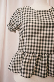 The girl in the Bramble blouse knows where the juiciest wild berries grow. This breezy linen blend blouse comes in classic black and cream gingham. The short puff sleeves are accented with a ruffle at the hem. The blouse falls away from the body to a larger ruffle at the bottom hem for a swingy modern peplum effect. And the best part? The Bramble is reversible, thanks to a keyhole bow-closure at the nape of the neck that creates a v-neck if worn open in the front.