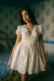 Inspired by casual day dresses of the Edwardian era but with a modern twist, the Brigitte Dress comes in a muted cream hue and is peppered with a muted lavender, soft pink and sage green ditsy floral print. This babydoll mini dress has a deep v-neckline with a subtle basque waistline and vertical pleated detailing along the mid waistline. It has fabric gathering along the waistline with a fully lined mini length flowly skirt. Finished off with an oversized bow in the center of the bodice, style with an oversized knit, slides and a messy updo for the perfect winter to spring look.